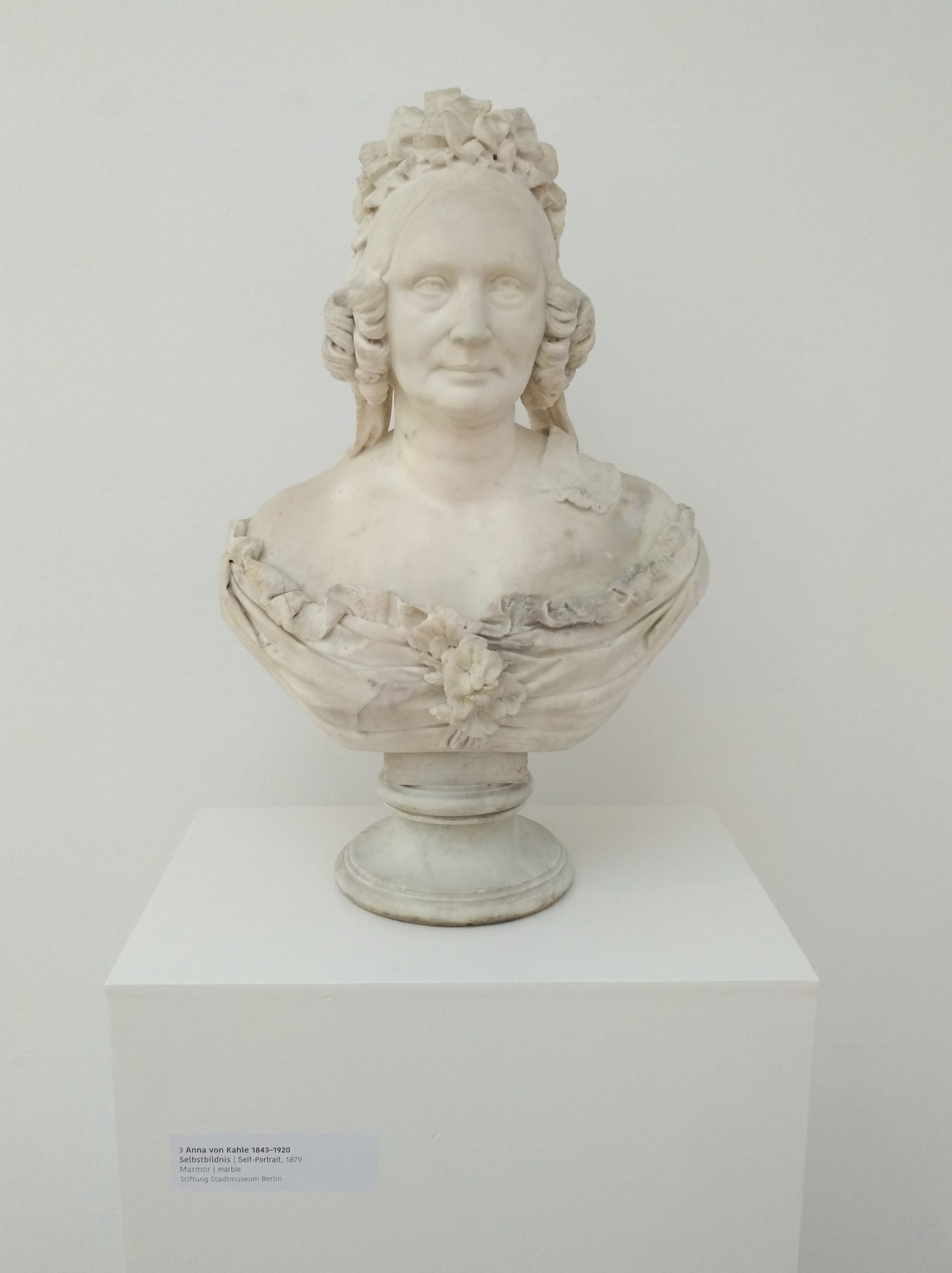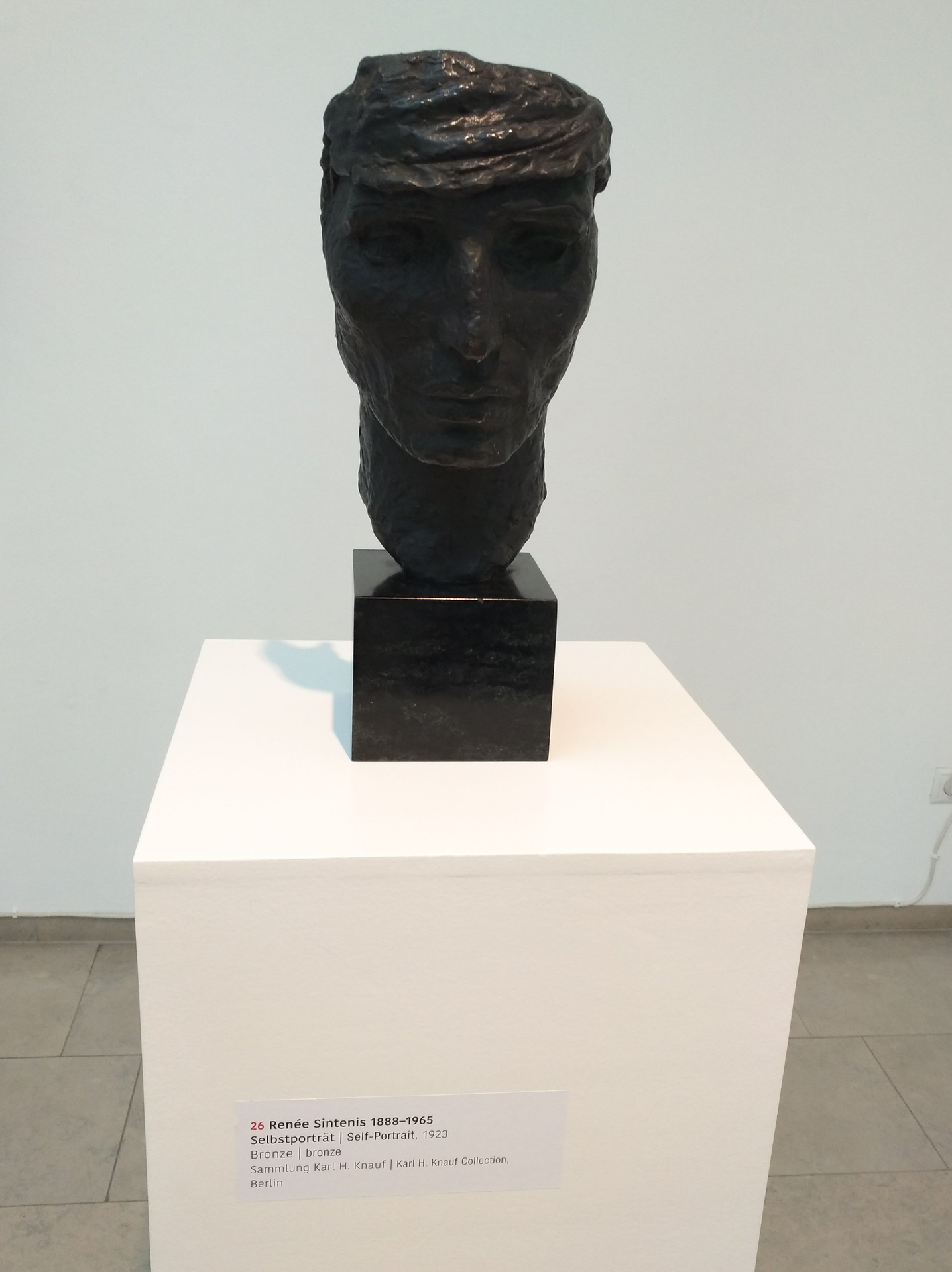 Besonders eindrucksvoll gelingt dies in dem Raum, der sich dem „Klischee“ des Porträts widmet. Hier wird besonders deutlich, wie ungerechtfertigt die Nichtbeachtung von Bildhauerinnen unter künstlerischen Aspekten ist. Zu sehen sind Arbeiten, die in ihrer Vielfalt von Formsprache und Material beeindrucken. Porträtbildhauerei galt lange als einer der wenigen für Frauen akzeptablen Tätigkeitsbereiche. Auffällig ist, dass die frühen Arbeiten vor allem berühmte Persönlichkeiten zeigen. Dies spiegelt die Tatsache wieder, dass im 19. Jahrhundert für den Erhalt von Kunstwerken von Frauen vor allem entscheidend war, wen sie abbildeten und nicht wer das Werk geschaffen hatte. Die repräsentativen Porträts wie die „Bismarck-Büste“ von Elisabet Ney, aber auch Künstlerporträts wie die Bronze „Heinrich Vogeler“ von Clara Rilke-Westhoff, verdeutlichen diesen Aspekt. Demgegenüber widmet sich der zweite Teil des Raumes dem Selbstporträt und veranschaulicht in den dort versammelten Kunstwerken die Emanzipationsbewegung der Bildhauerinnen. Auf der einen Seite des Raumes ist ein Selbstbildnis Anna von Kahles von 1879 zu sehen. Neben der besonderen Stofflichkeit des Kleides und der Haube überrascht vor allem die lebensnahe Darstellung des Gesichtes der Künstlerin, die eigene Falten und den Ansatz eines Doppelkinns nicht verbirgt. Dennoch ist auffällig, dass sich Von Kahle hier nicht als Künstlerin, schon gar nicht als Bildhauerin präsentiert, sondern eine klassische bürgerliche Darstellung des 19. Jahrhunderts wählt. Ganz anders sieht es auf der anderen Seite des Raumes aus. Hier werden vier Selbstproträts aus der ersten Hälfte des 20. Jahrhunderts gezeigt. Gemeinsam ist diesen Arbeiten von Renée Sintenis, Käthe Kollwitz, Ilse Fehling und Guta von Freydorf eine selbstbewusste Behauptung der eigenen Künstlerinnenpersönlichkeit gegenüber der damaligen gesellschaftlich akzeptierten Rolle der Frau. Besonders aussagekräftig ist unter diesem Aspekt die kleine Terrakotta-Arbeit „Sculptura (Selbstbildnis)“ von Guta von Freydorf. Indem Freydorf den eigenen Akt, der skizzenhaft modelliert bleibt, mit Klöpfel und Meißel, den klassischen Attributen der Bildhauerei, ausstattet, reklamiert sie die Deutung des eigenen Körpers für sich und positioniert sich selbstbewusst als Bildhauerin.