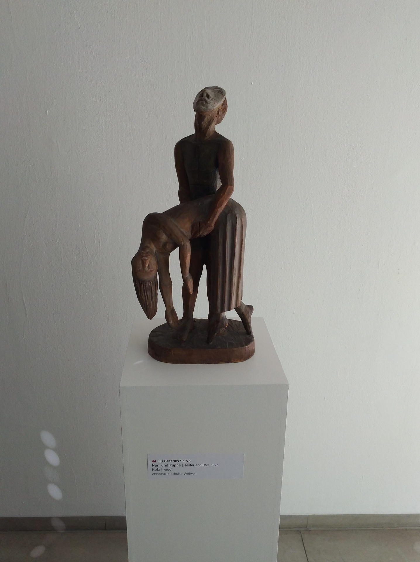 An den Wänden der Ausstellungsräume begegnen den BesucherInnen immer wieder Fotografien nicht ausgestellter Arbeiten. Aufgrund von gesellschaftlichem Druck, Diffamierung durch die Nationalsozialisten oder schlichtem Desinteresse ging eine Vielzahl von Werken von Bildhauerinnen verloren und ist heute nur noch durch überlieferte Abbildungen oder zeitgenössische Erwähnungen bekannt. Die in der Ausstellung gezeigten Fotografien verdeutlichen schon allein durch ihre schlechte Qualität diesen Verlust der Originale anschaulich. Kleinformatig, unscharf und dunkel können sie nicht ansatzweise mit der Präsenz der physisch vorhandenen Skulpturen mithalten und erheben so auch keinerlei Anspruch darauf, als Ersatz für diese zu gelten. Anhand der Künstlerin Lili Gräf wird das in allen Räumen bereits anklingende Schicksal vieler der nur durch zweidimensionale Abbildungen vertretenen Bildhauerinnen noch einmal unter der Überschrift „Leerer Sockel“ gebündelt. Das Werk der unter anderem am Bauhaus tätigen Holzbildhauerin galt lange als verschollen. Die hier ausgestellte Holzfigur „Narr und Puppe“ von 1926 ist eine Wiederentdeckung, die erstmals seit dem Tod der Künstlerin 1975 eine objektbezogene Auseinandersetzung mit ihrem Werk jenseits der erhaltenen Fotografien erlaubt.