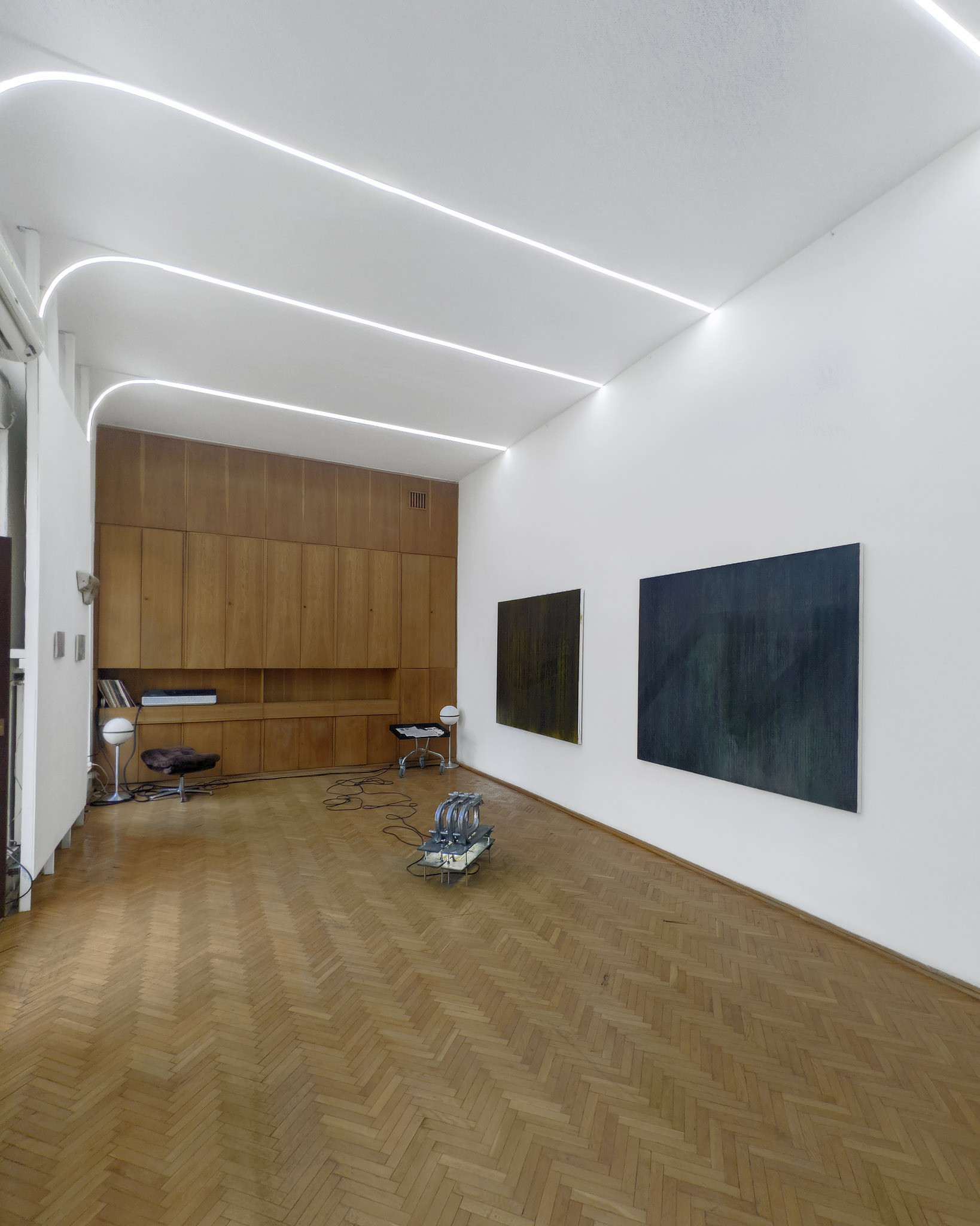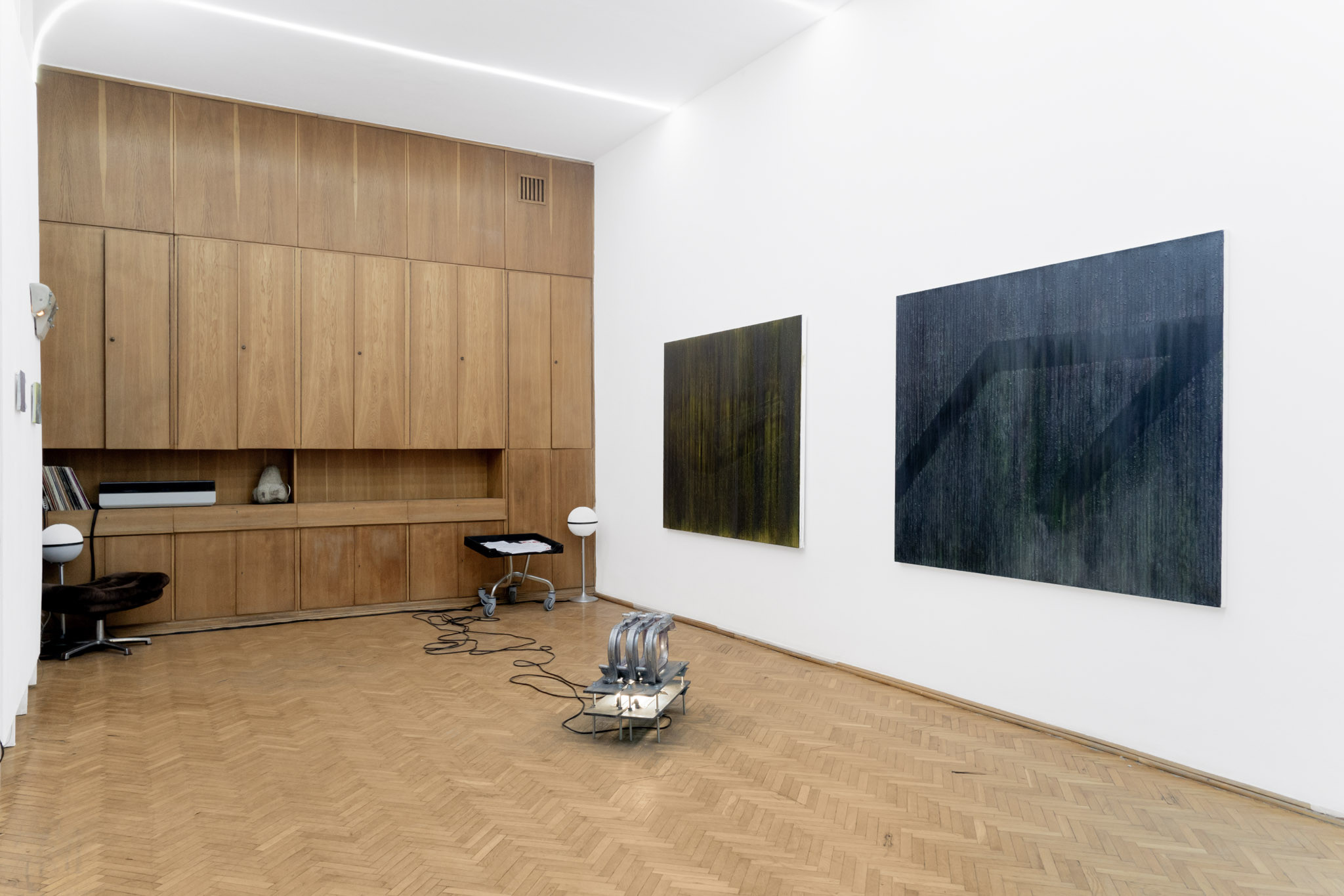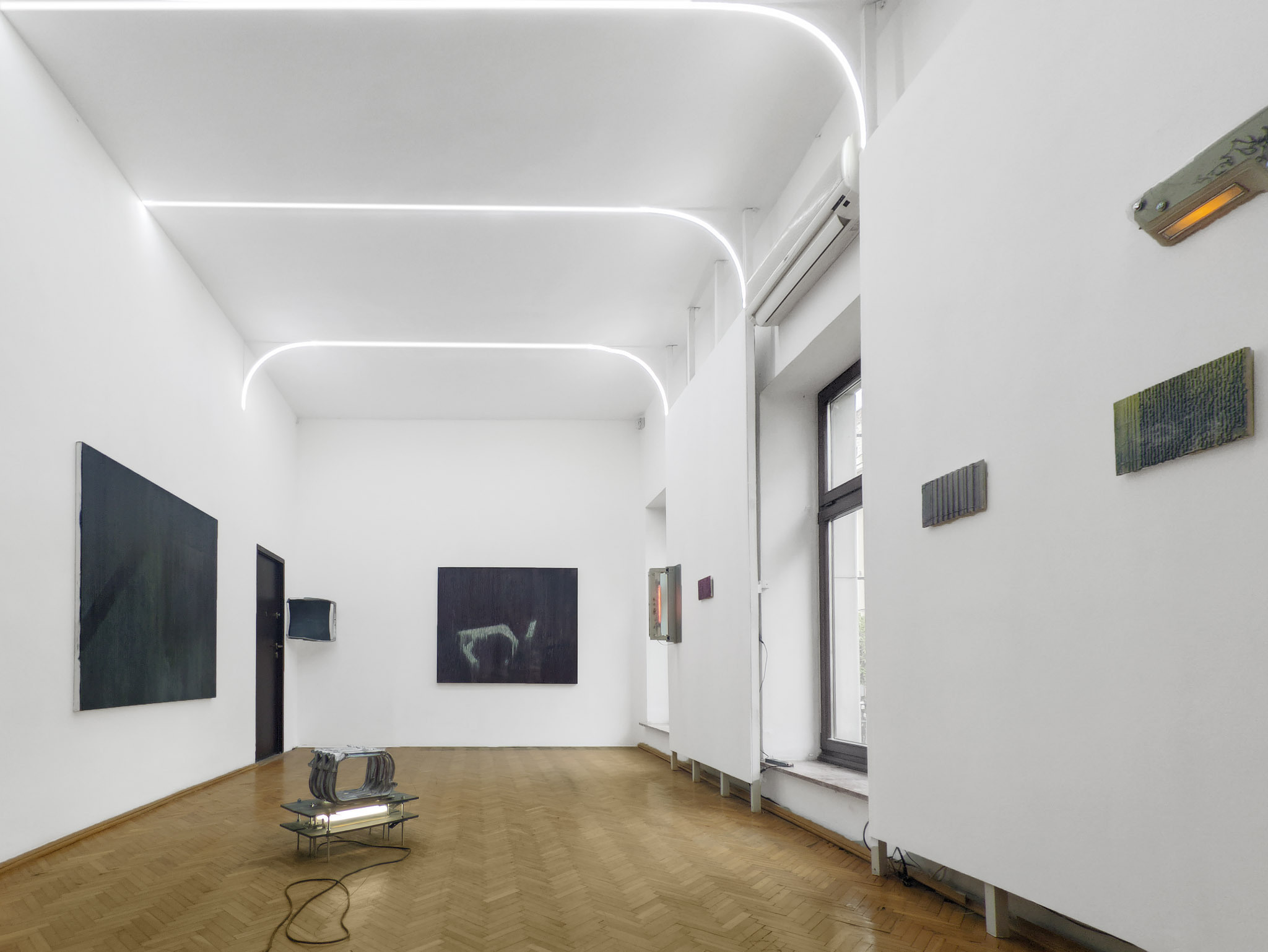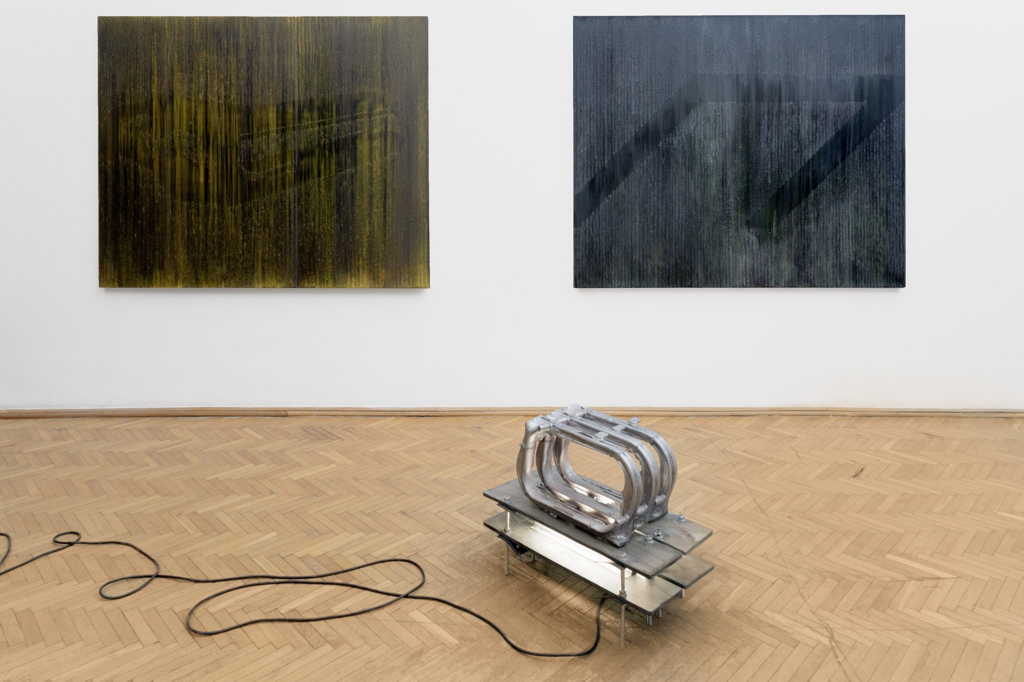 Stan Buglass' exhibition, Auto Deco, presents paintings and sculpture that use found forms from the street to blur the line between abstraction and reality. These semi-abstract, rather semi-representational works echo commercial and industrial objects. They are undulating remnants and rejects of forgotten architecture and mechanical forms reorganised to become a remnant or ruin of what they once were, while becoming something else entirely. These precarious recollections of buildings and machines transport us to a realm of ageing infrastructure, where thick drops of glazed oil paint run down architectural facades and accumulate in crevices. Painting and sculpture work together to create a fragmented illusion of walls and passageways, suggesting a sense of human transience.