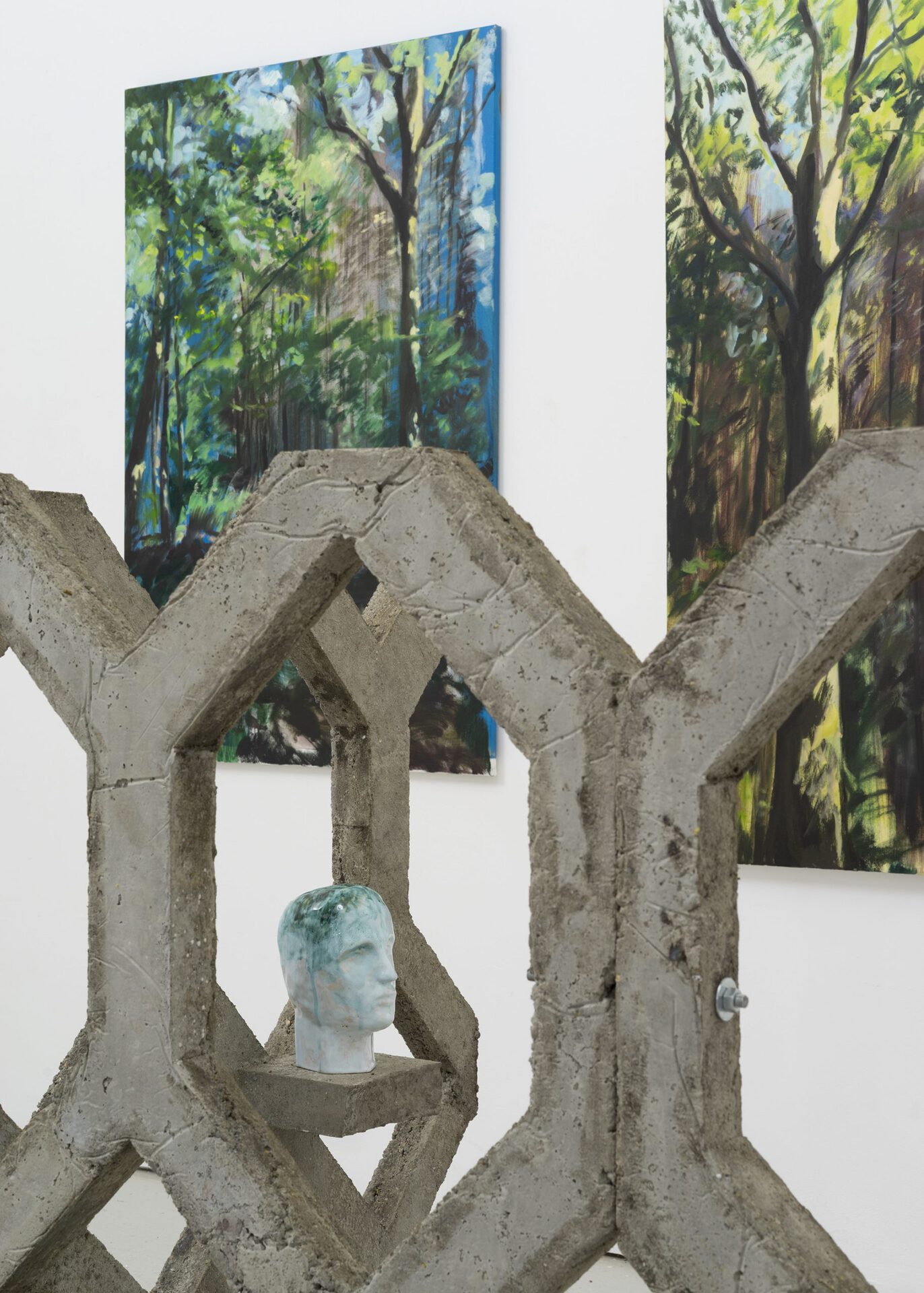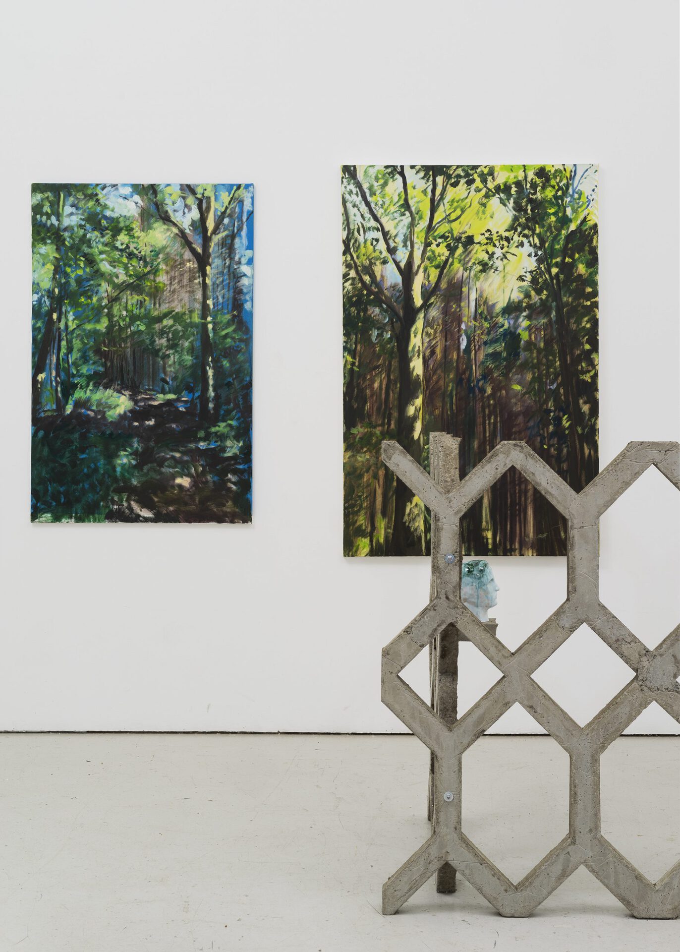 This exhibition brings together the works of London based painter Ellie Pratt and Berlin based sculptor Ole Meergans. While Ellie, who’s body of work is predominantly dealing pose and portrait, will present new works depicting cropped sections of light flooded woodland, Ole will make a large installation citing architectural elements of Cafe Moskau, a centre piece of Berlins Karl-Marx-Allee, as well as elements of figurative plastic. Ole Meergans (b.1988, Berlin) is a sculptor who lives and works in Berlin. He completed his Master of Fine Arts at UdK Berlin at Manfred Pernice class. In his sculptural installations, he often combines abstracted architectural shapes with figurative plastic. While referring to art and architecture from Eastern Germany and the former Eastern Bloc countries, he questions its contemporary representation and perception. His main focus is public sculptures and architectural art of the time, which aesthetic he reflects and re-contextualises. With his collective COLLCOLL he collaborates to produce public sculptures, questioning modes of public ownership and the meaning of public spaces Ellie Pratt (b.1991, Kent) is a painter who lives and works in London. She completed a BA in Painting at the Slade School of Fine Art in 2013, followed by an MA in Painting at the Royal College of Art in 2015. Recent exhibitions include group shows at Pm/ Am (London), Mackintosh Lane (London), and V.O Curations (London). Drawing upon both historical and contemporary culture, Ellie often juxtaposes inherited forms of representation with personal experiences to form images that capture transient scenes through use of light and colour. Her paintings, often depicting young women inhabiting dark domestic interiors or back lit by sublime landscape, play on a strange tension in the dichotomy of inside and outside worlds, exploring metaphors of the unconscious and blurring boundaries of reality.Text