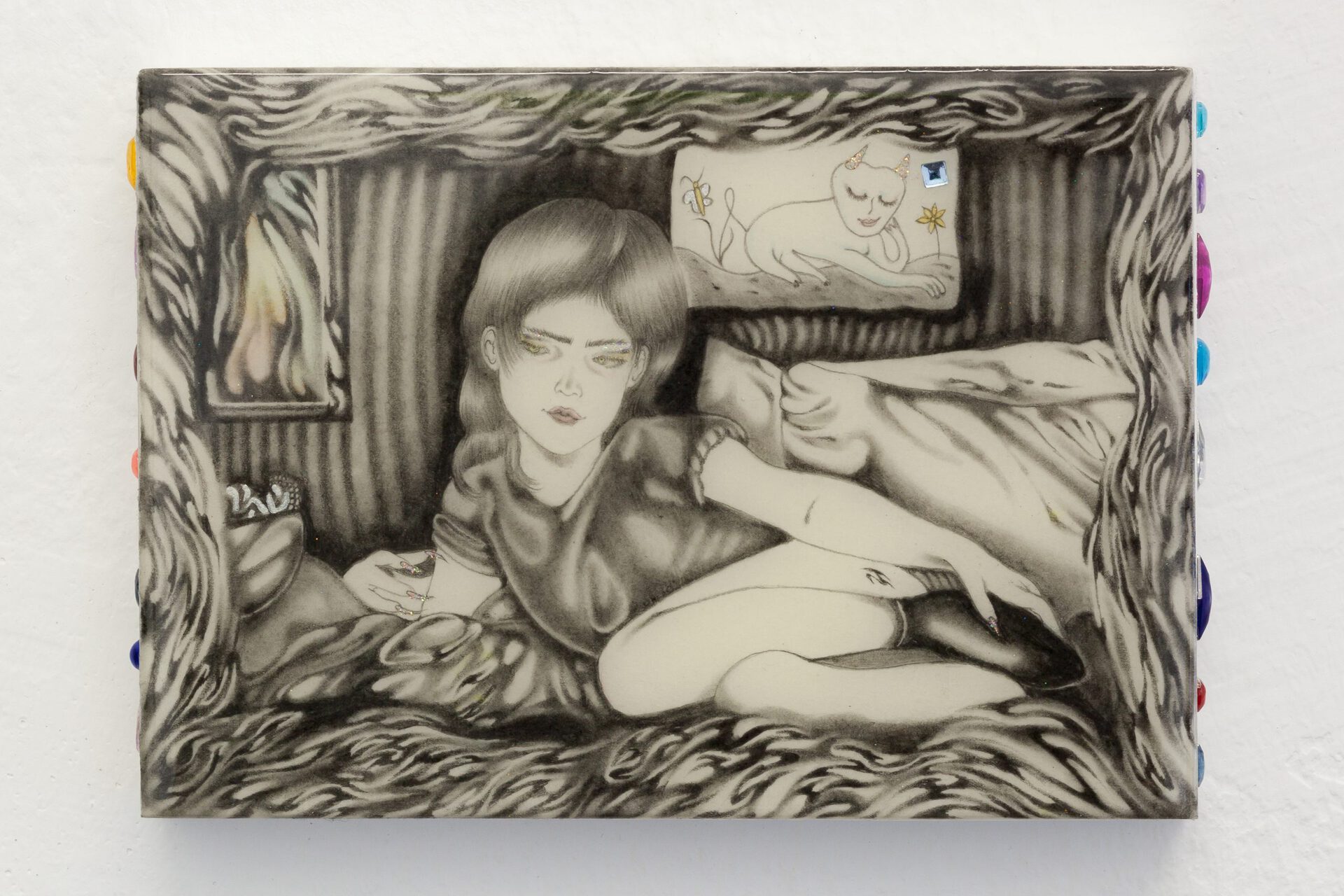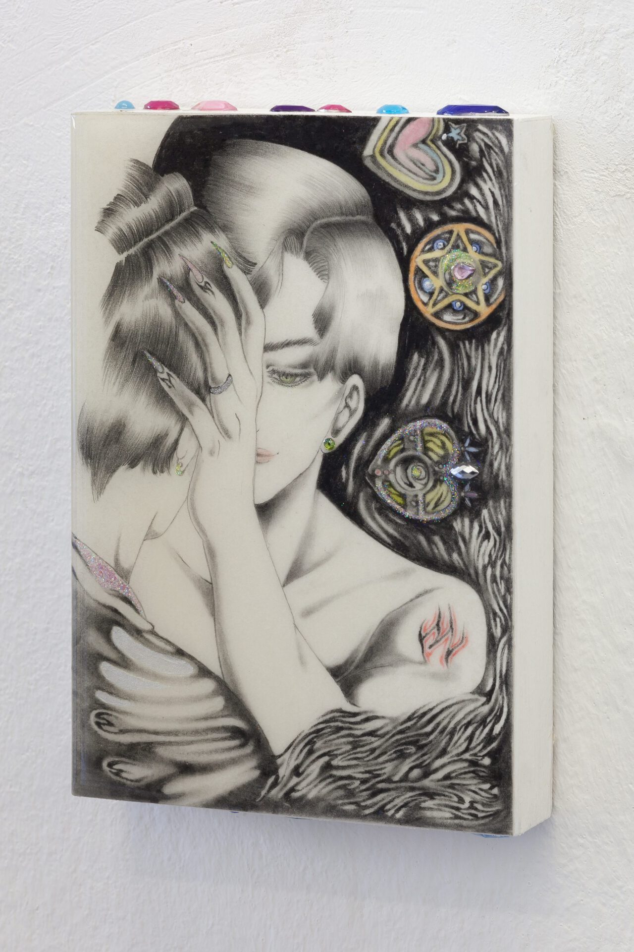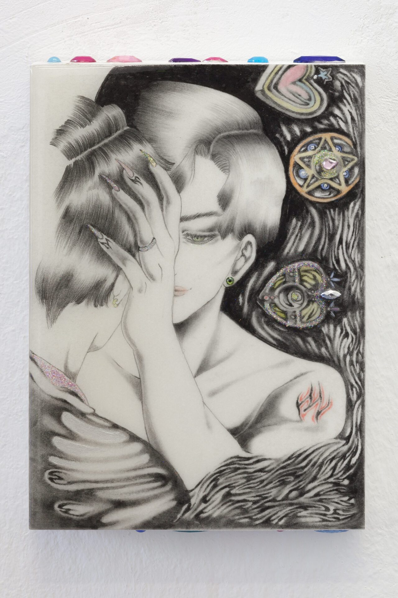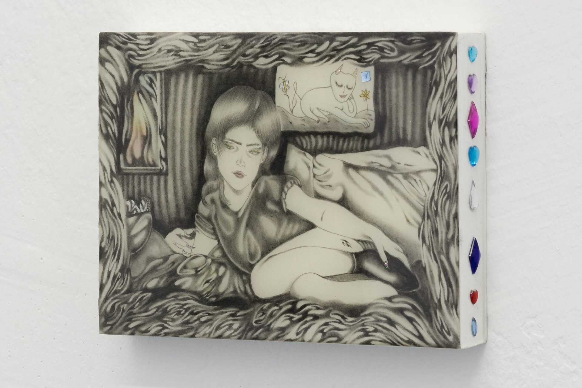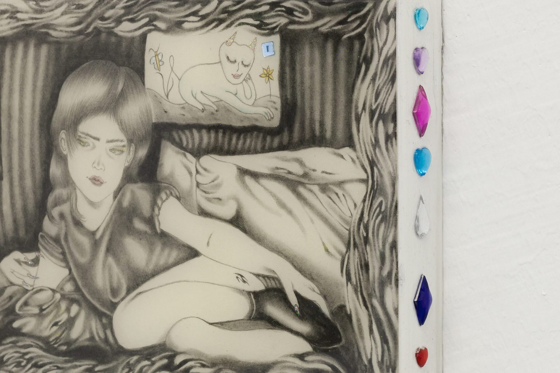 We choose to disbelieve Psyche because she conflates matter with spirituality, we disregard the psychic because she intends something too strongly with her mind. We presume that Psyche is hiding something, repressing some Ur-Sache that would unpack the symptom of her pathological lies. Such a presumption, however, fails to engage with the cultural preoccupations that produce psychic illness: the fact that Psyche is so beautiful that we cannot refrain from picturing her, posting her, sharing her, idolising her, shaming her. Why not sketch out her likeness in graphite and watercolour, wait for a certain alchemy to turn the image from self-knowledge towards collective madness? Diagnoses have only ever described the way we respond to the irrationality of society-building, the excess of being that gushes out when morality bites on the clitoris, when the Other is chained up in the shadows. Hysterical woman, multiple-personality-disorder woman, Influencer woman, narcissist, freak. She tells her fanciful stories and her payment (the price, the fare) to us has the function of neutralising something infinitely more dangerous than money – namely, a debt to society.