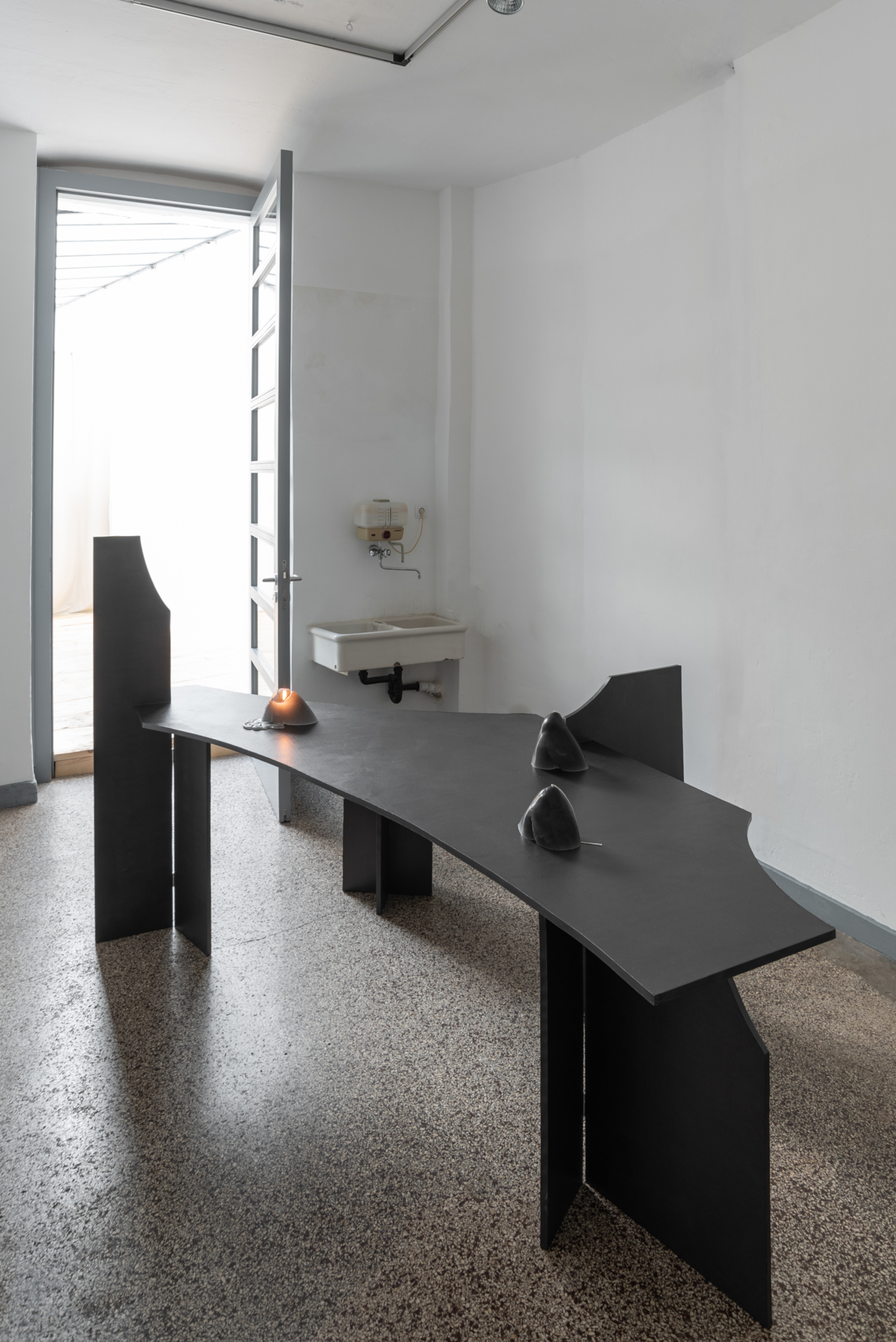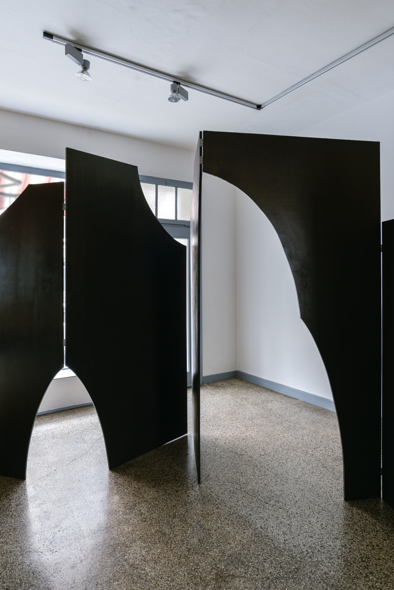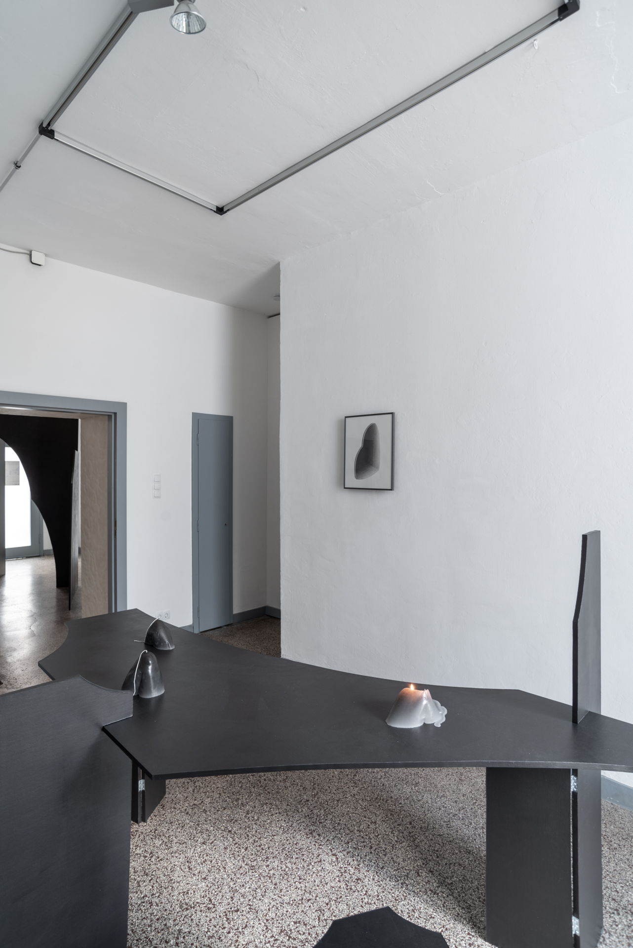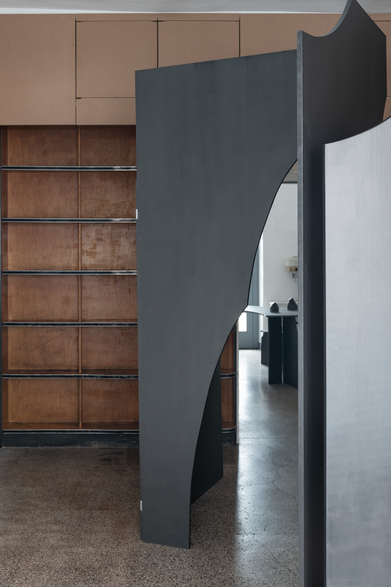 For the visual display the duo produced paravents-style interior made of simple honeycomb boards, covered in a graphite-pigment-solution unfolding through the exhibition space which simultaneously function as passage, paravent and display.