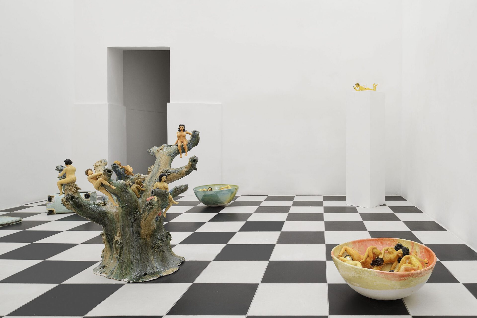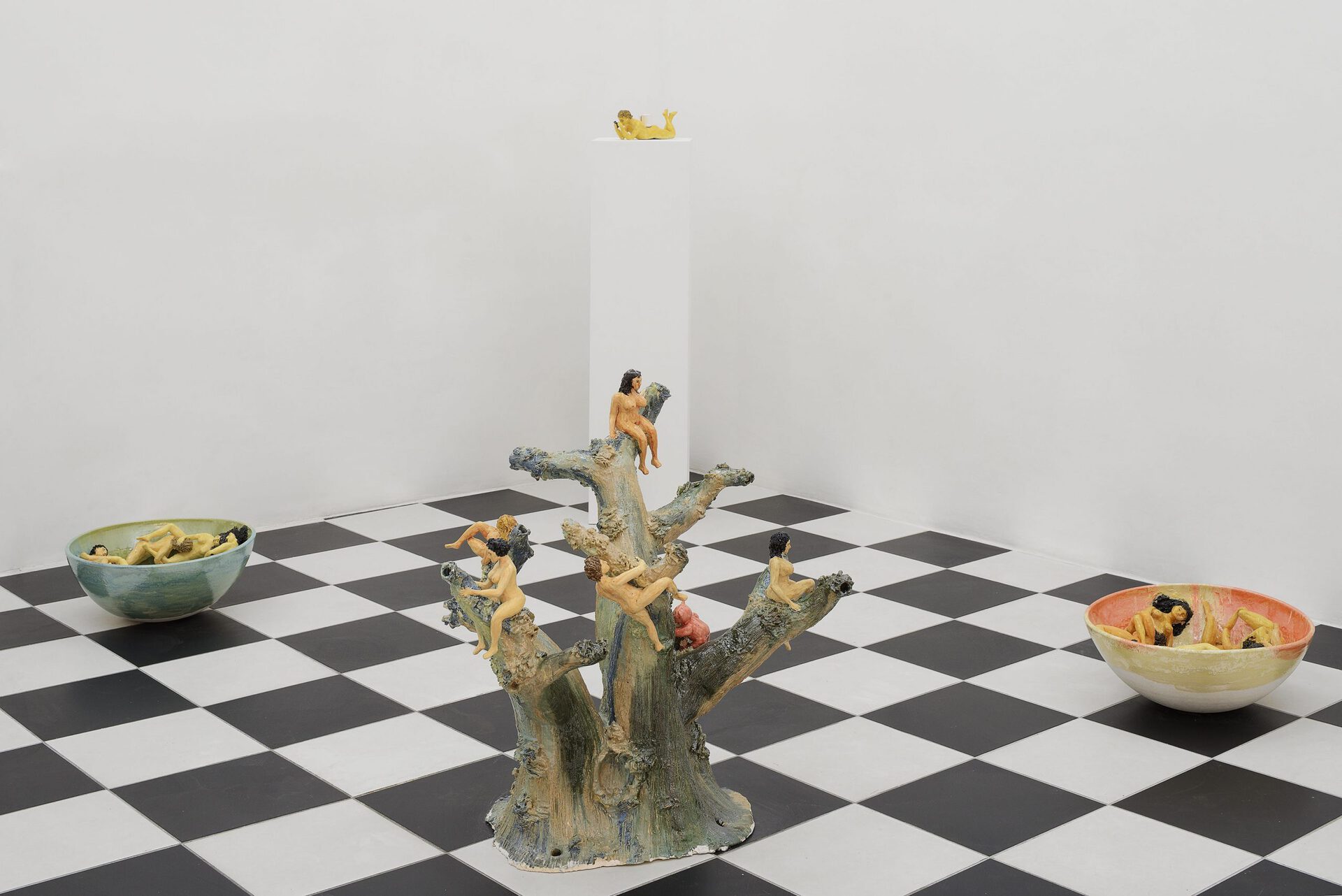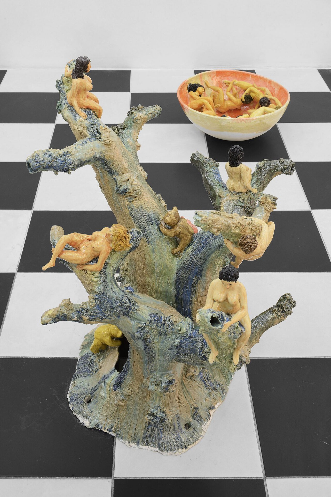 The tree – one of the works – unfortunately exploded in the kiln, so I improvised and turned the hole into a cave where bears are hoarding their own toilet paper. My friend asked me if they were “stockpiling” them. I also added a face mask to a naked figure in one of the bowls - even though they are not observing social distancing rules.”