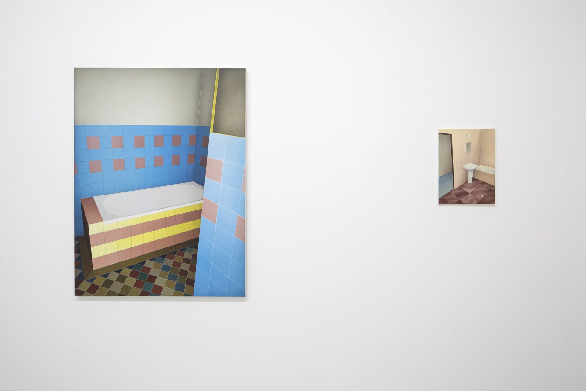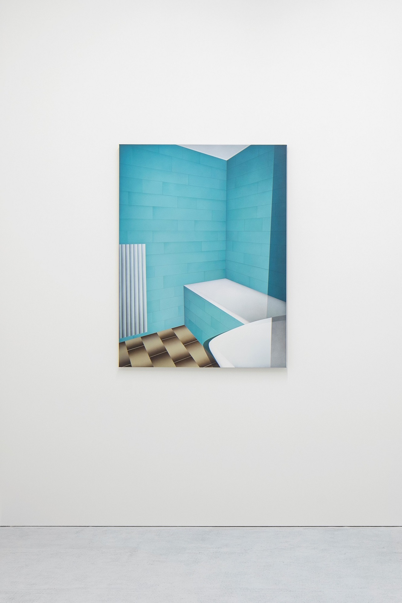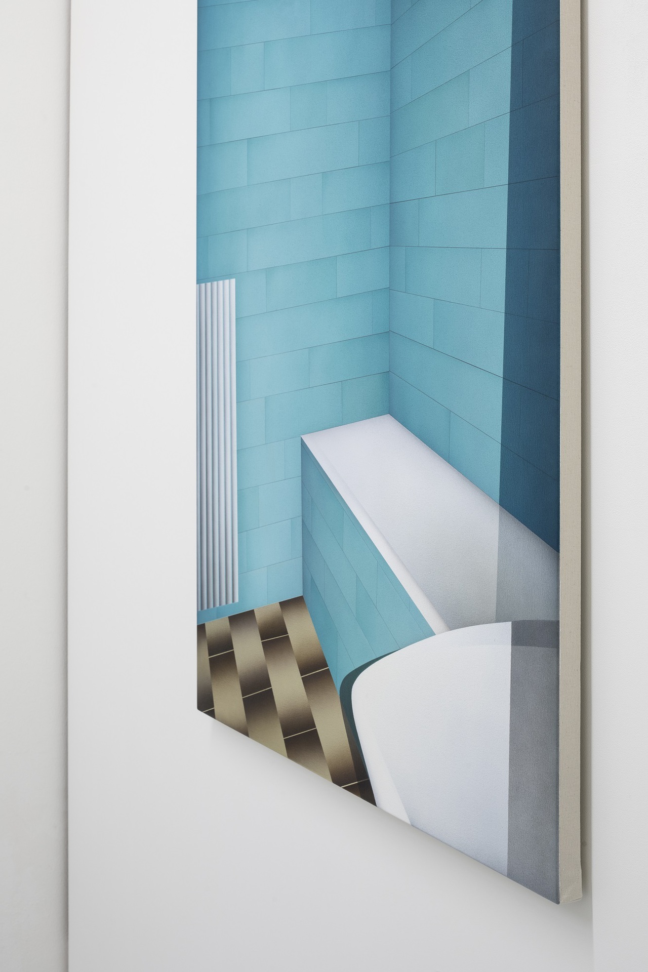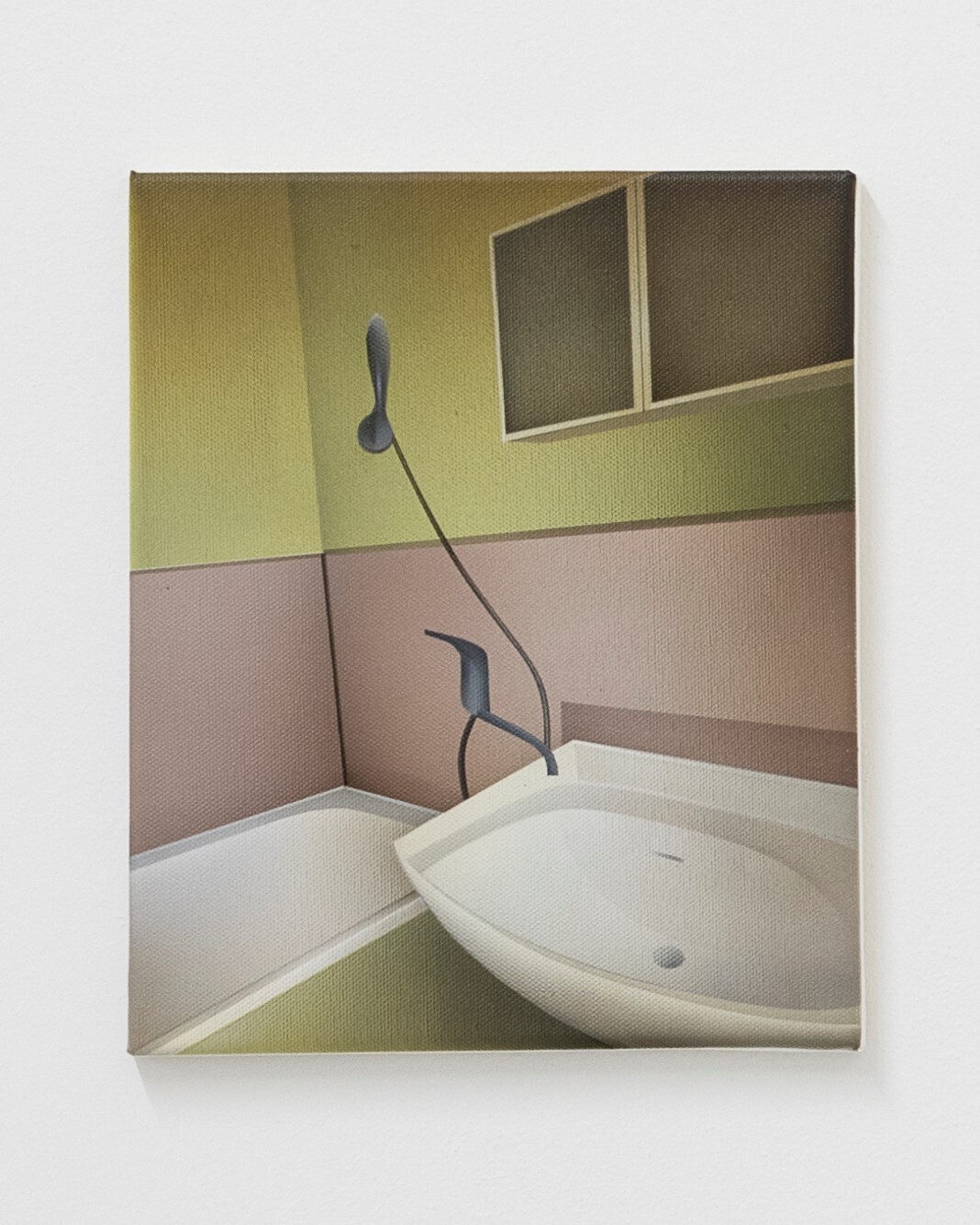 For instance, there’s a wet place in every one of Alexandra’s bathroom paintings, but always in a different spot (often appearing in the places of egress, diagonal or a small cut3): for example, Cerulean Blue Bath (2021) is completely dry, save the floor. That means: the presence of the fantasy of moisture does not take place at the same time as the perception of dryness, they represent different times and different situations when fantasies of the people are happening.