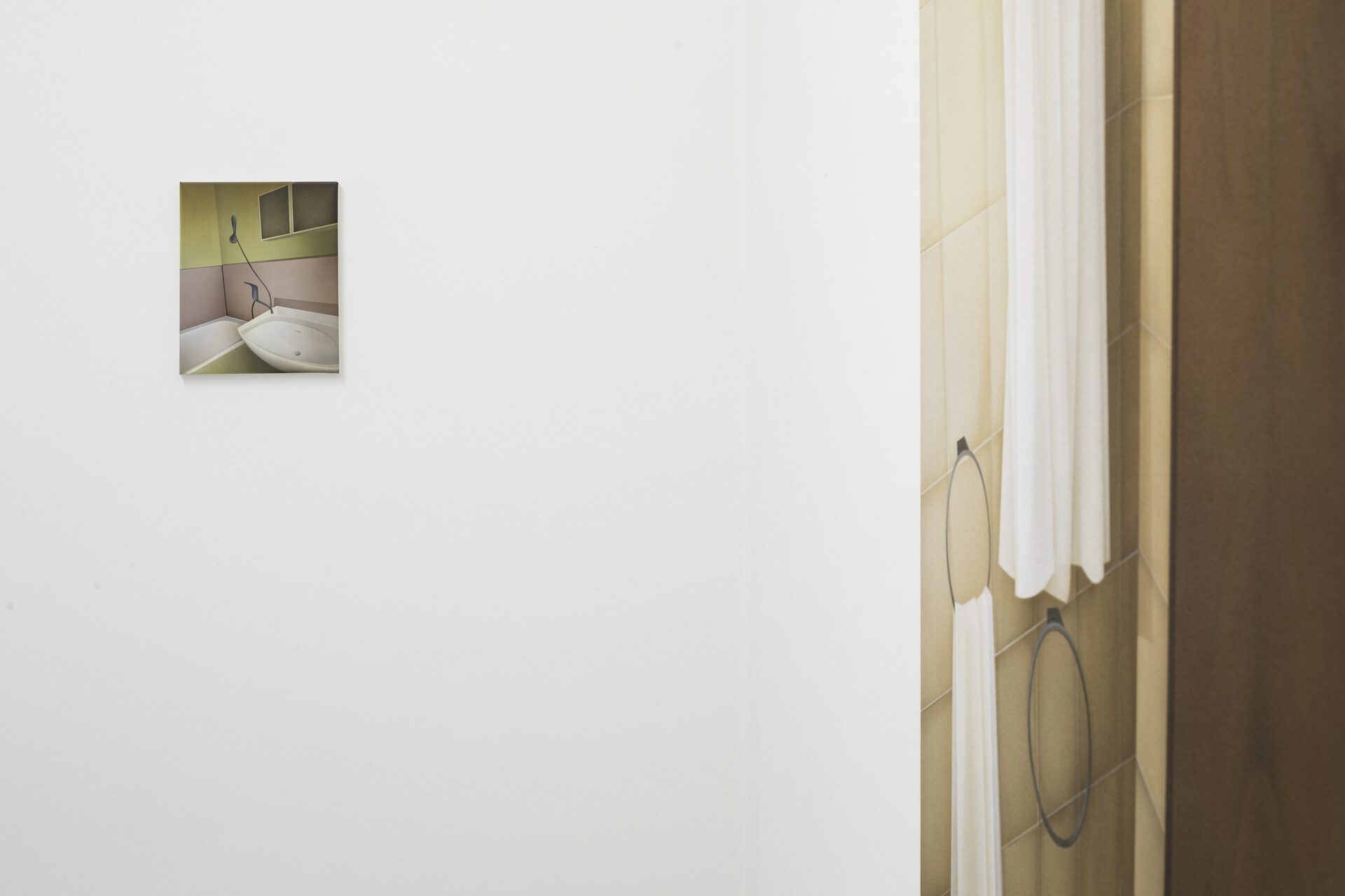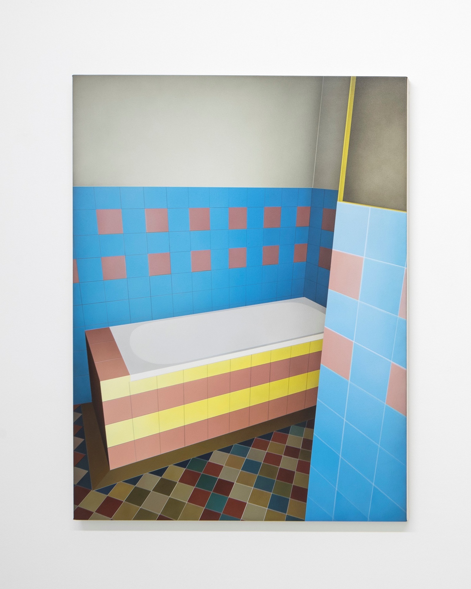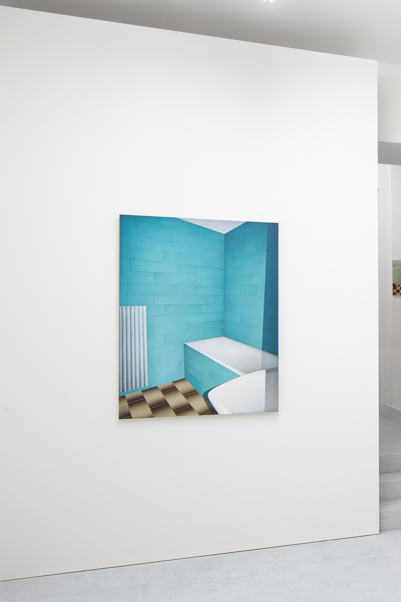 For instance, there’s a wet place in every one of Alexandra’s bathroom paintings, but always in a different spot (often appearing in the places of egress, diagonal or a small cut3): for example, Cerulean Blue Bath (2021) is completely dry, save the floor. That means: the presence of the fantasy of moisture does not take place at the same time as the perception of dryness, they represent different times and different situations when fantasies of the people are happening.