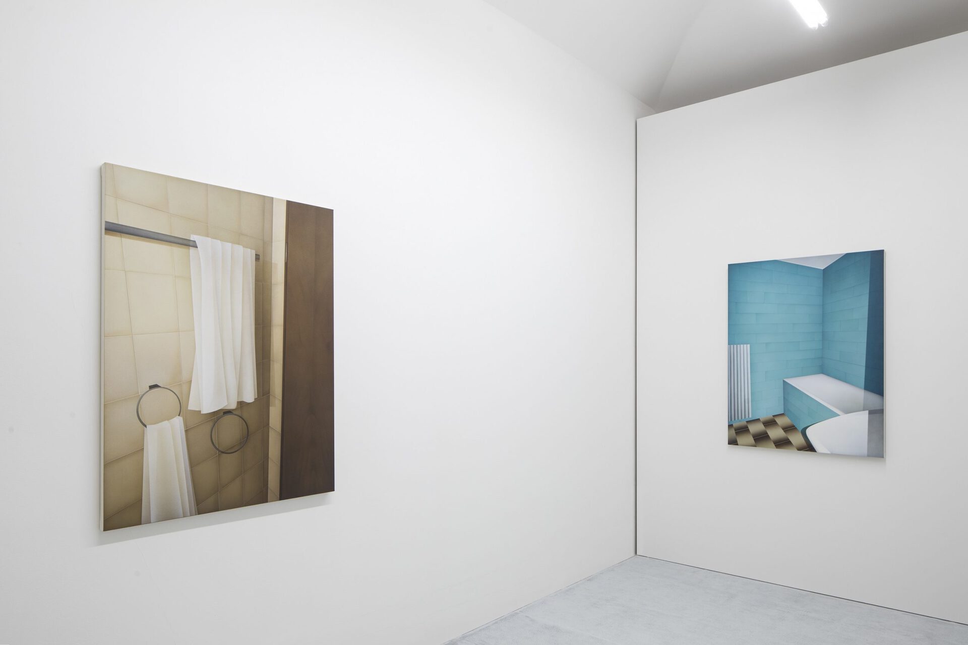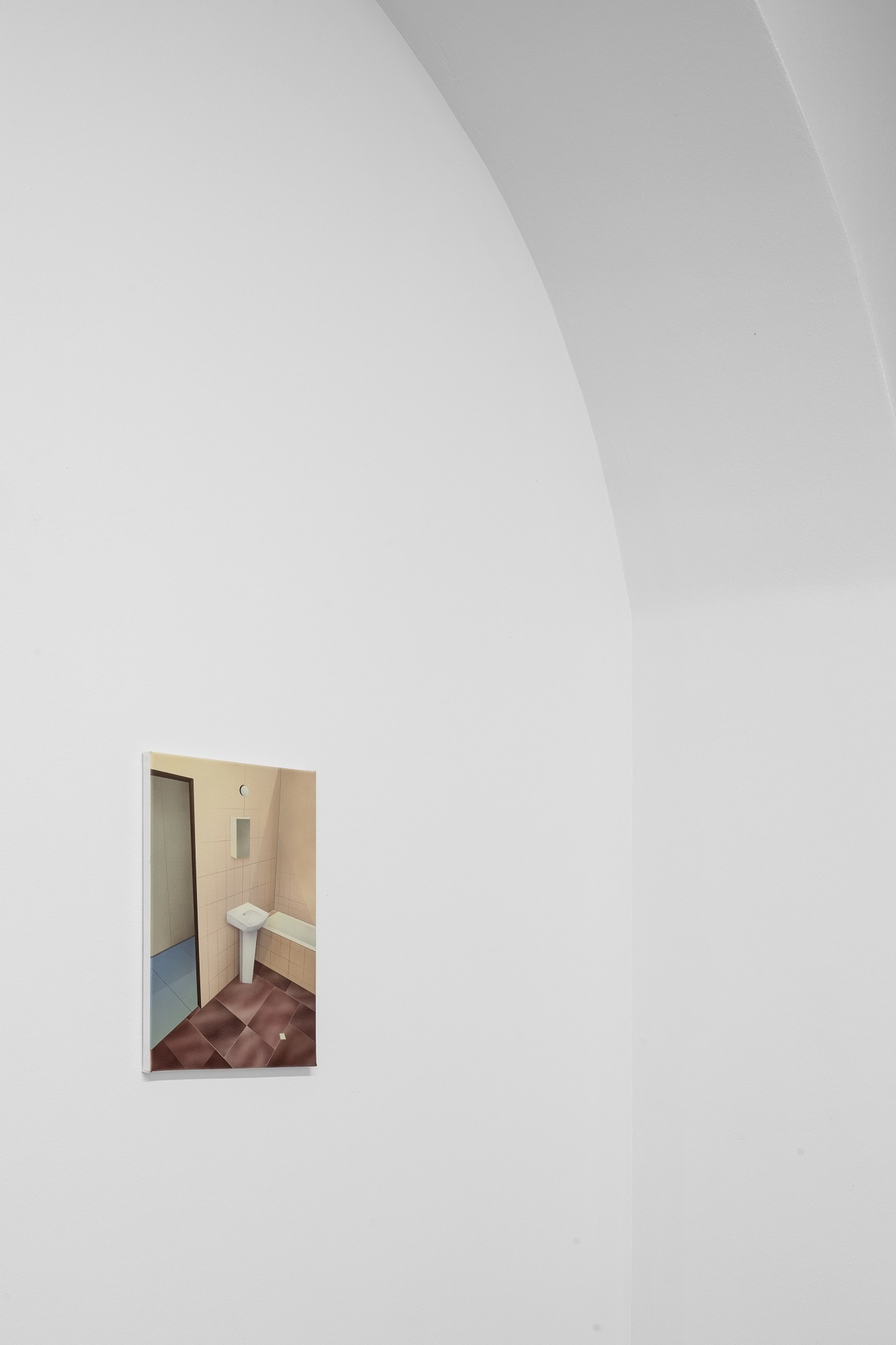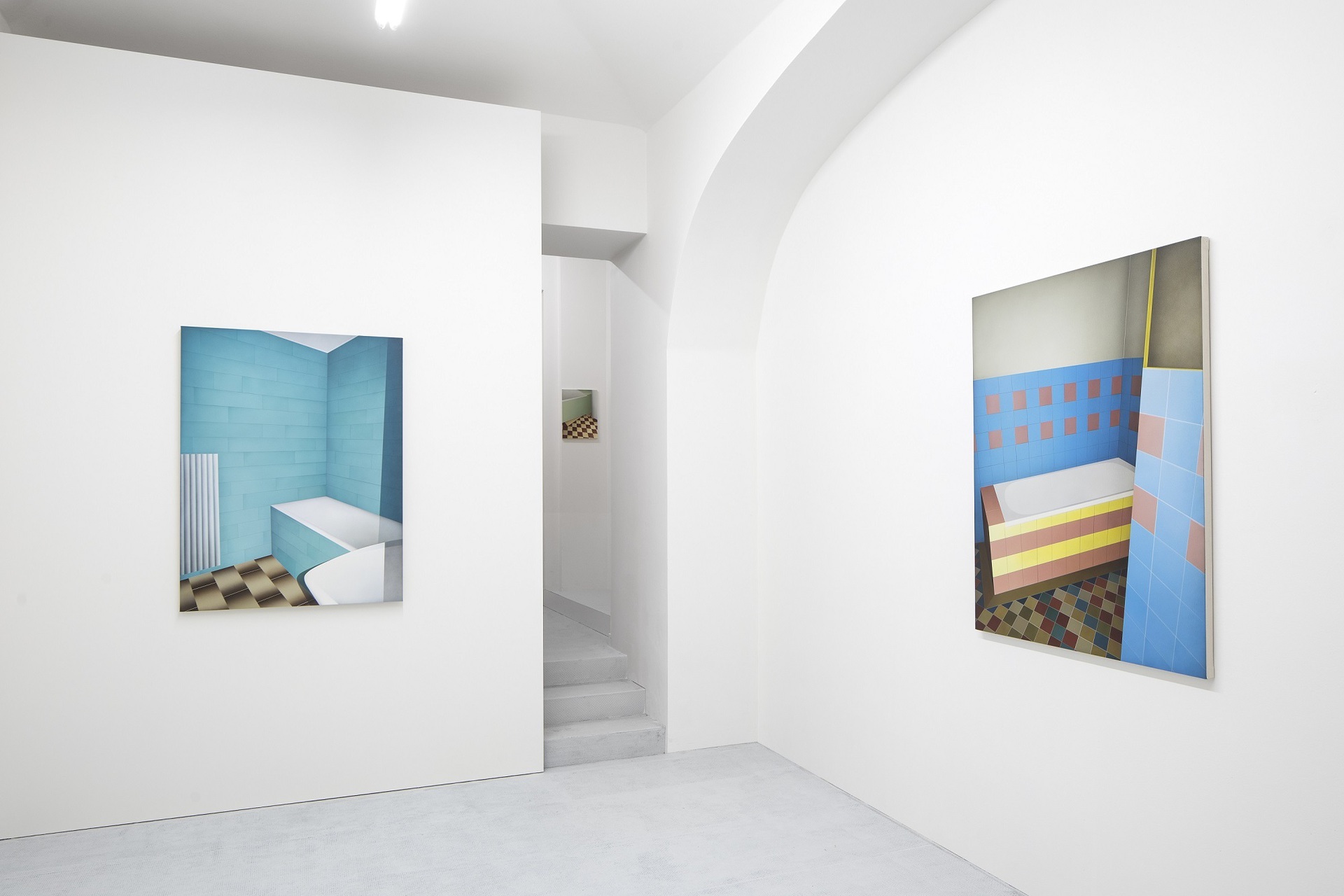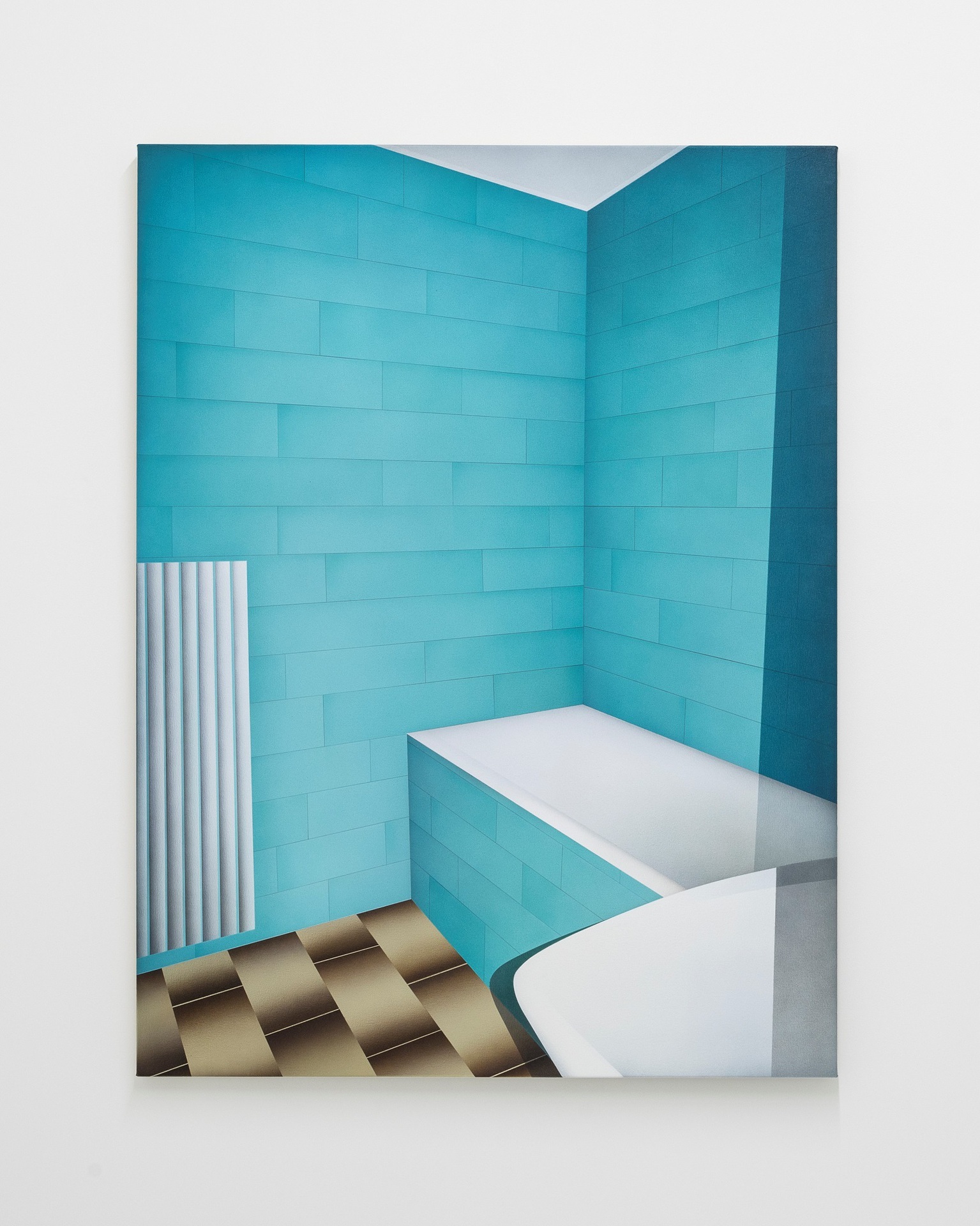 For instance, there’s a wet place in every one of Alexandra’s bathroom paintings, but always in a different spot (often appearing in the places of egress, diagonal or a small cut3): for example, Cerulean Blue Bath (2021) is completely dry, save the floor. That means: the presence of the fantasy of moisture does not take place at the same time as the perception of dryness, they represent different times and different situations when fantasies of the people are happening.