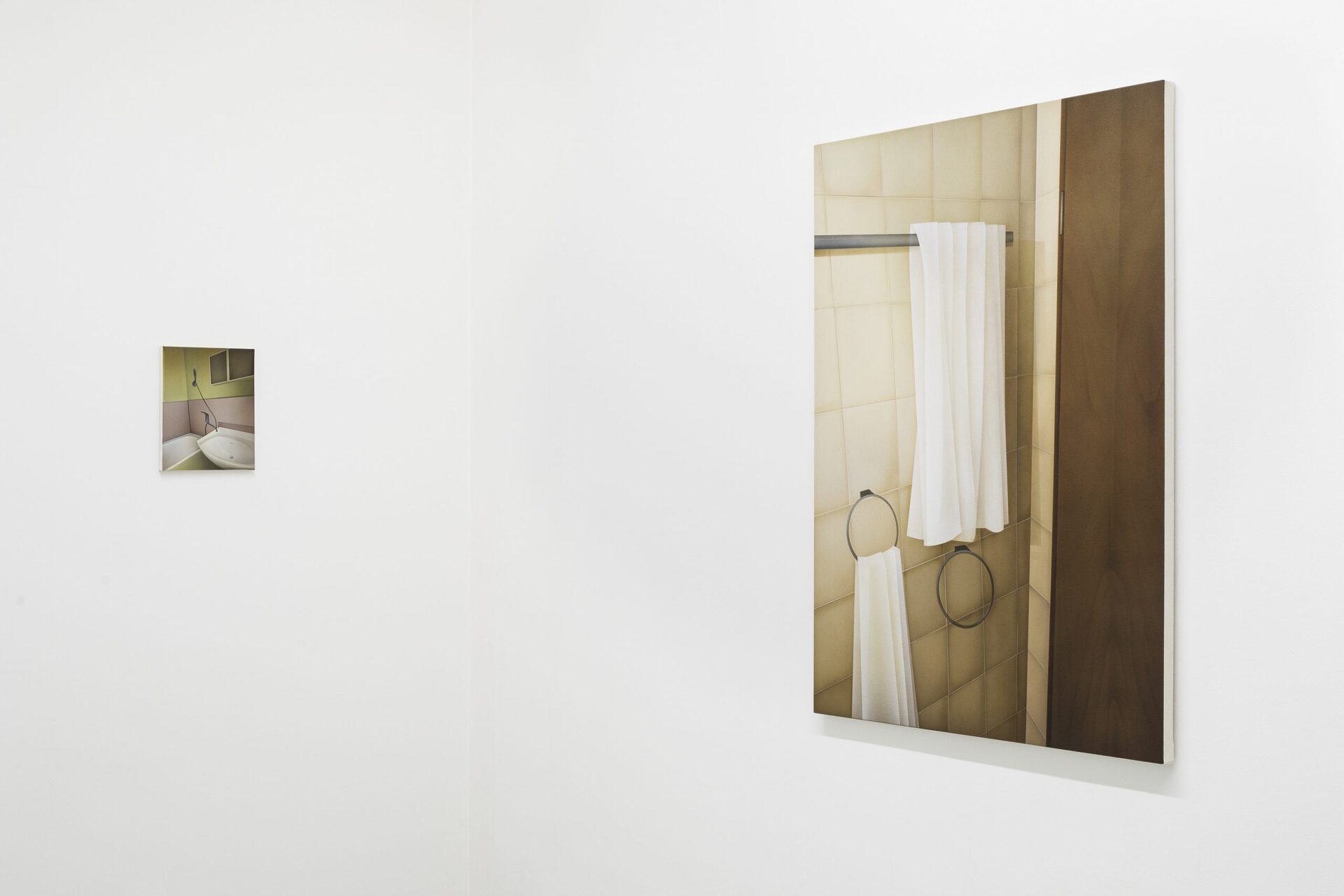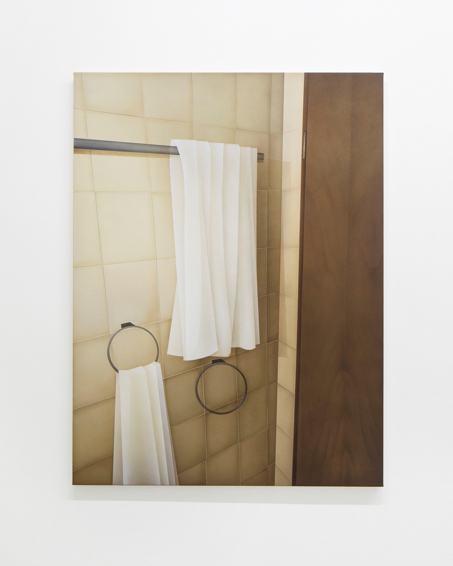 The most sensual thus far in Alexandra Barth’s oeuvre, with respect to Čepan and the male-female principle4, are hanging towels in the ‘Two Towels’ painting (2021). Both draperies are related to metal: one bulkier (OČ) looking towel hangs above the other one from a circular holder. The brown bathroom represents a double aporia: visually it seems dirty, but in terms of sensuality, if we had been there, we would have felt warmth. Taste separates from experience.