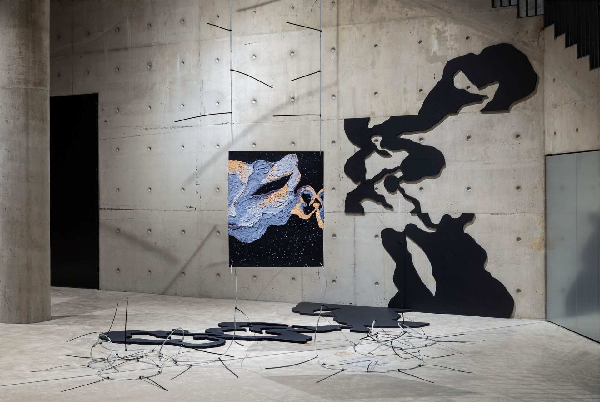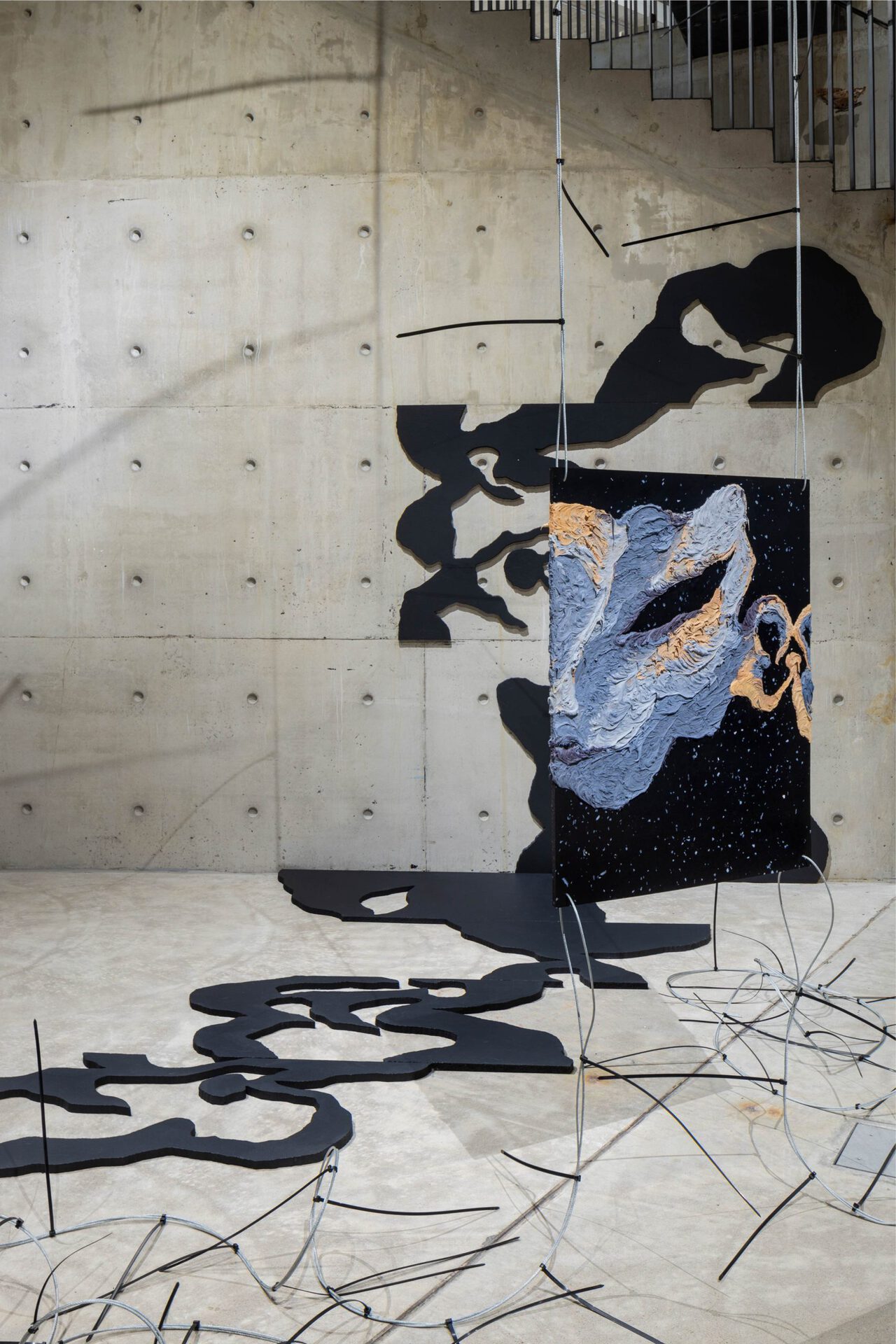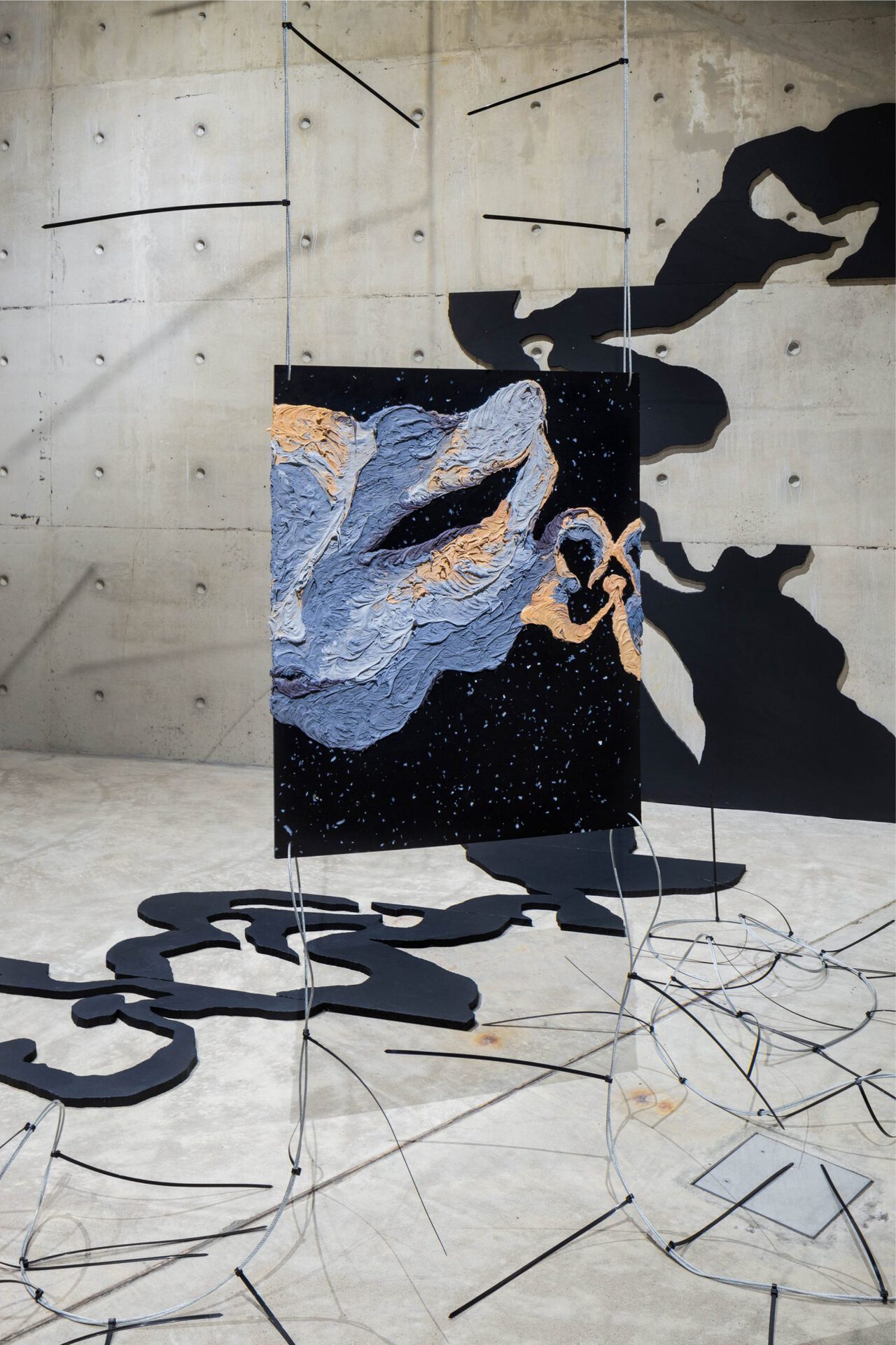 Taru Happonen An invasive species Painting installation 2021 Oil paint, recycled plastic panel, cable wire, cable tie, acrylate paint, linen panel Size variableText
