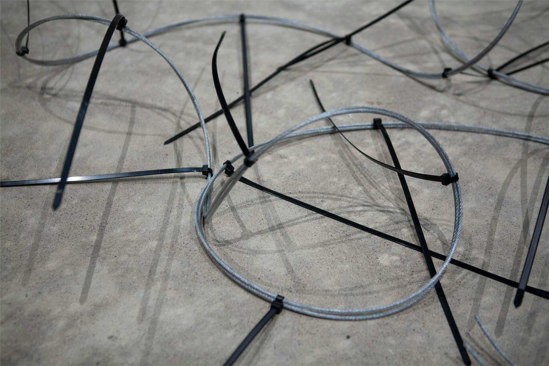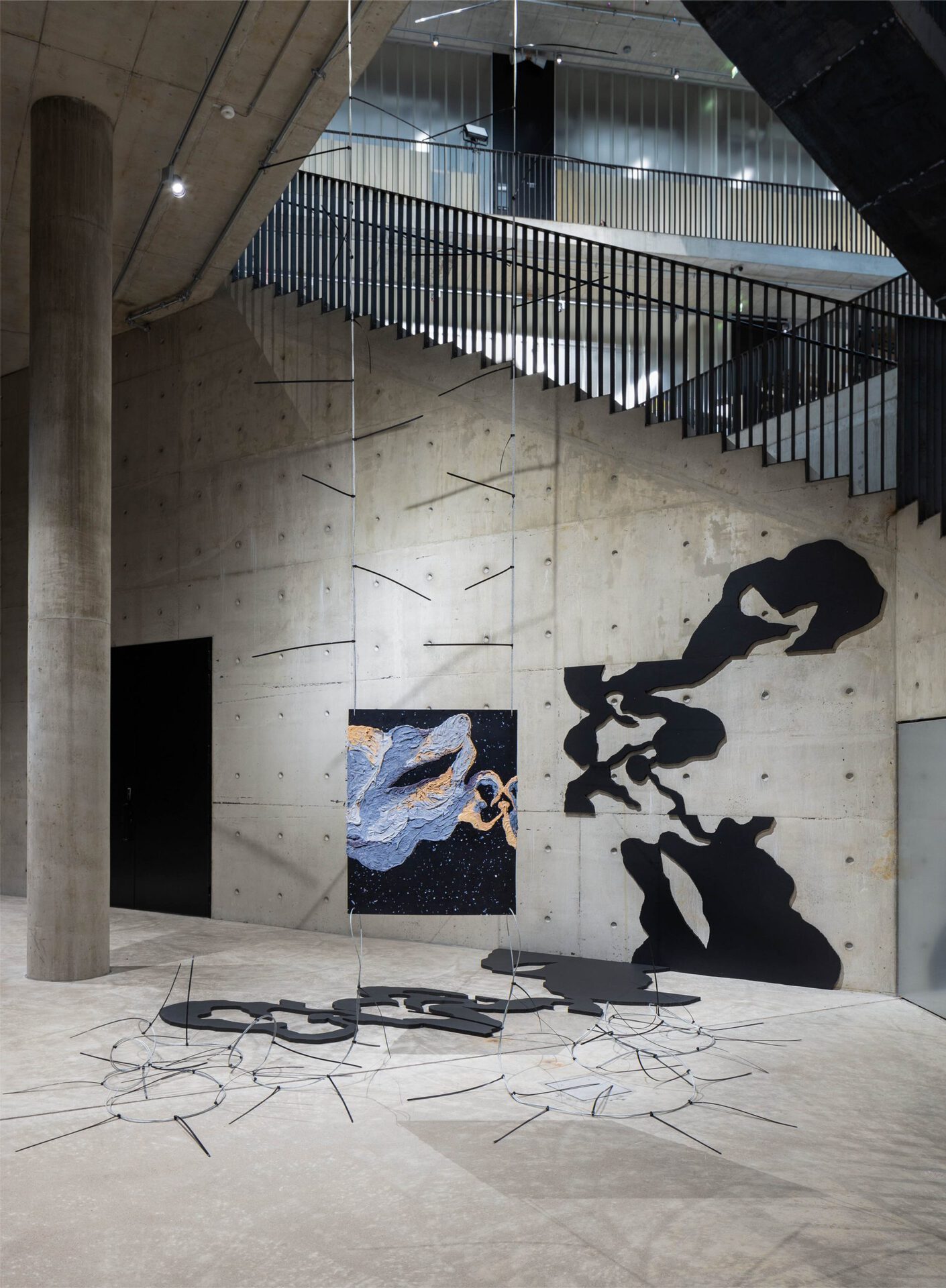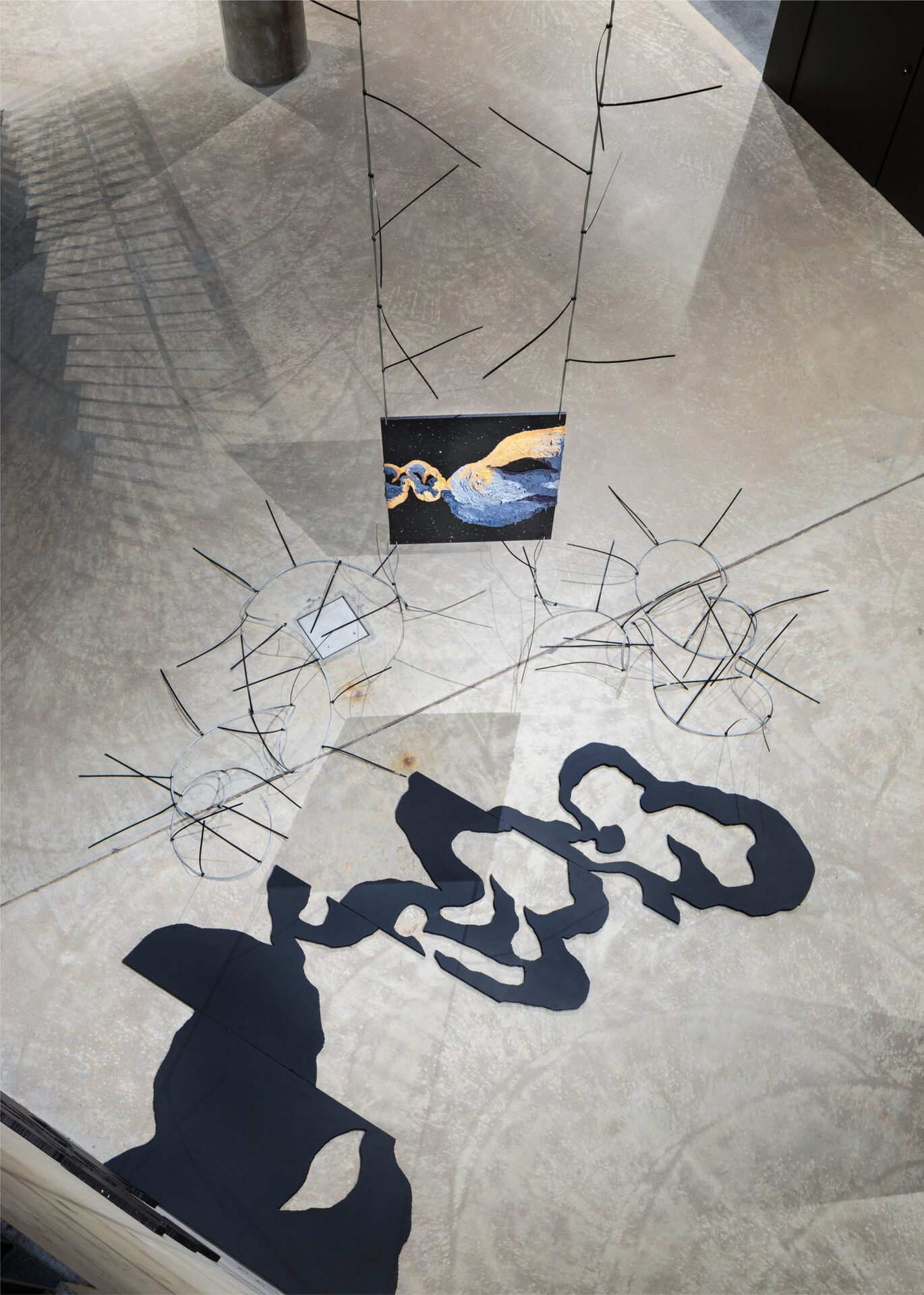 Taru Happonen An invasive species Painting installation 2021 Oil paint, recycled plastic panel, cable wire, cable tie, acrylate paint, linen panel Size variableText