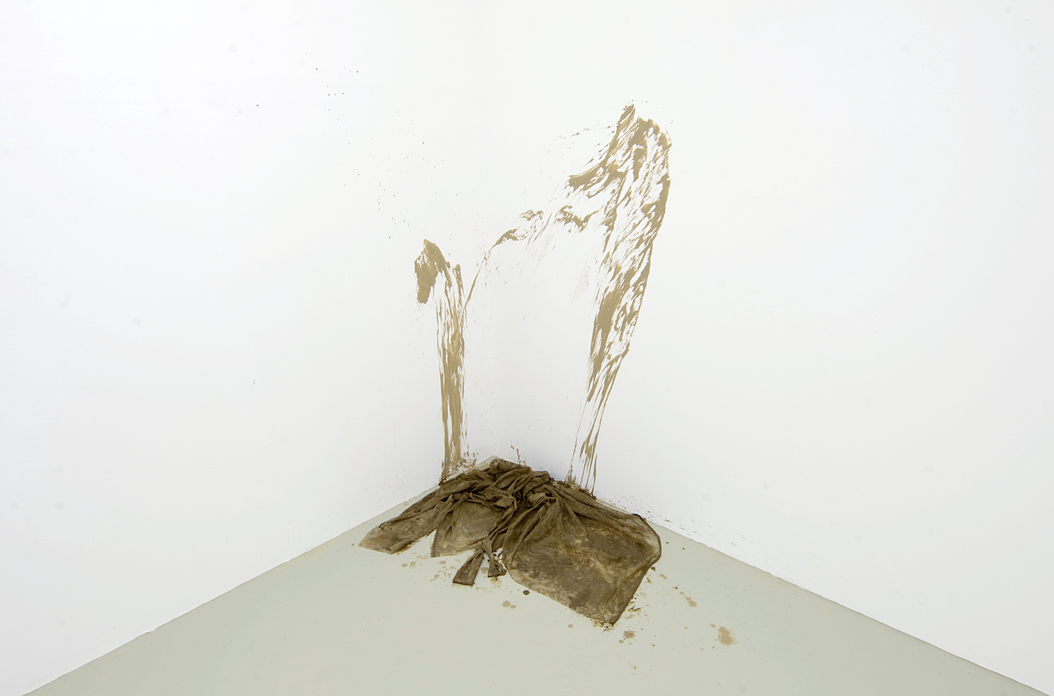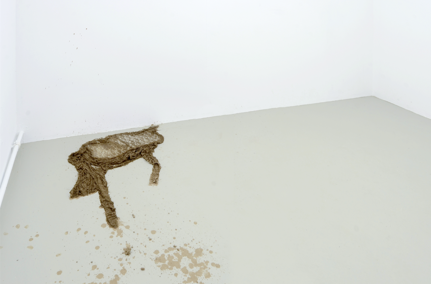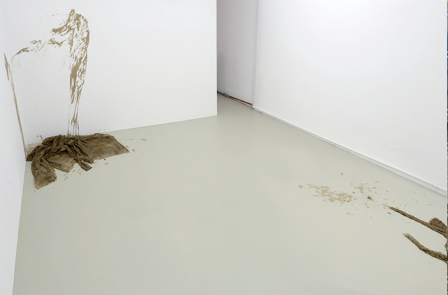 In Kontrast zu den scharfen und glatten digitalen Bildern des Videos stehen die zarten und fragilen Textilskulpturen, die Anna-Sophie Berger im Erdgeschoss präsentiert. Berger, die in Wien transmediale Kunst und Mode studiert hat, bedient sich der skulpturalen Qualität des Materials und schafft so Arbeiten, die zwischen Skulptur, Prozess und Malerei zu schweben scheinen. Aus Polyester-Spitze hat sie Malerkittel geschneidert, die nun in lehmige Erde getränkt, noch feucht auf dem Boden liegen. An den Wänden und neben den schmutzigen Stoffen sind Spuren zu sehen, malerische Referenzen, das Produkt eines performativen Vorgangs. Langsam trocknen diese feuchten, verletzlichen Gebilde, ändern ihre Farbe und Festigkeit. Eine ephemere Qualität, die den Bezug zum Prozess offenbart: Zu sehen sind die noch in Veränderung befindlichen Ergebnisse eines expressiven Prozesses, der eine gewisse Brutalität in sich trägt. Der Schmutz steht in direktem Kontrast zum artifiziellen Material, die Sensualität und Physikalität in Kontrast zum körperlosen Digitalen des Videos. Während Berger in den Videos noch passiver und interessierter Betrachter ist, steht bei den Skulpturen eine aktive, offene und direkte Auseinandersetzung in Zentrum. Die Kittel als Arbeitskleidung der Künstlerin werden zum haptischen Material und bleiben dennoch leere Hüllen, der arbeitende Körper, den sie umschließen sollen ist entschwunden. Dreck und Oberfläche, Arbeit und Müßiggang, Kunst und Mode, digitale Bilder und die Textur von Stoffen. Anna-Sophie Berger arbeitet nicht nur interdisziplinär und ohne eine Begrenzung der Ausdrucksmittel, sie kombiniert und löst Dualismen und Gegensätze, sie versucht Komplexitäten gerecht zu werden und Heterogenität anzunehmen. Zusätzlich zu den Räumen nutzt Anna-Sophie Berger auch die Pressemitteilung, die über die Mailinglisten und das Soziale-Web eine eigene Öffentlichkeit entwickelt, als bespielbare Fläche. Ihr poetisches Fragment liest sich dabei als artist’s statement und Ausgangspunkt für einen künstlerischen Versuch: