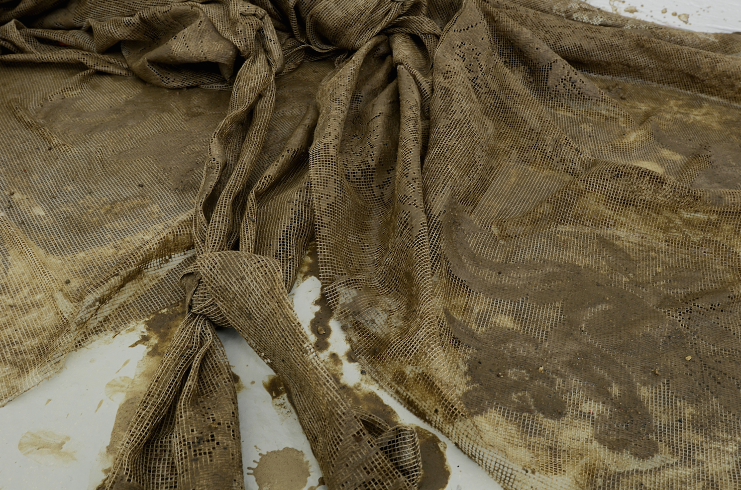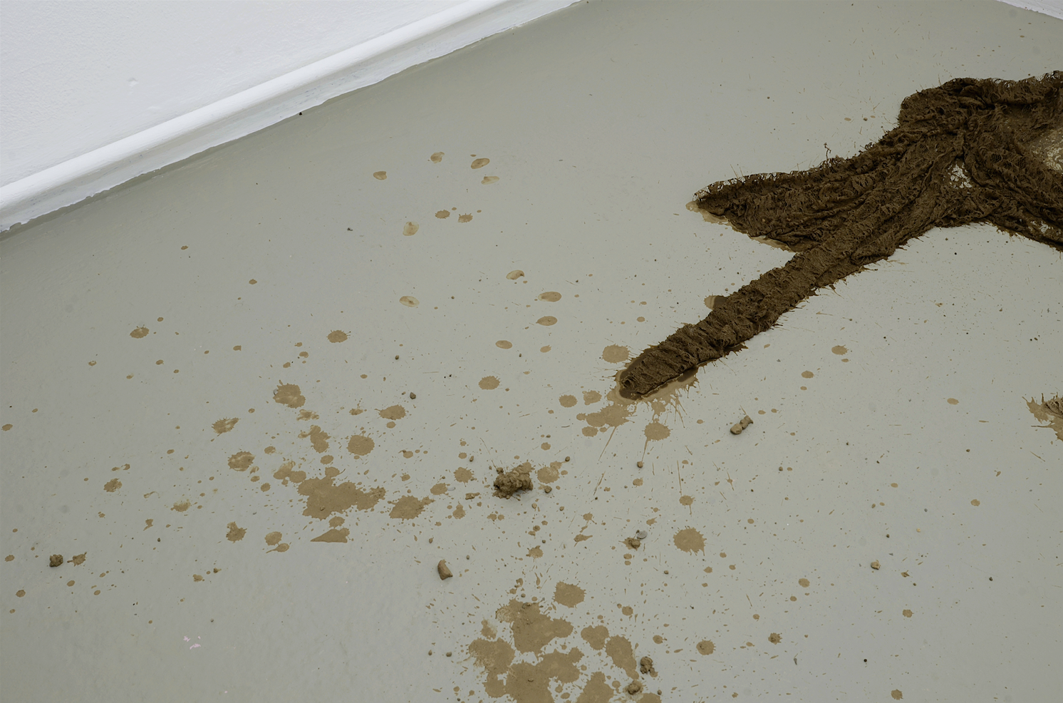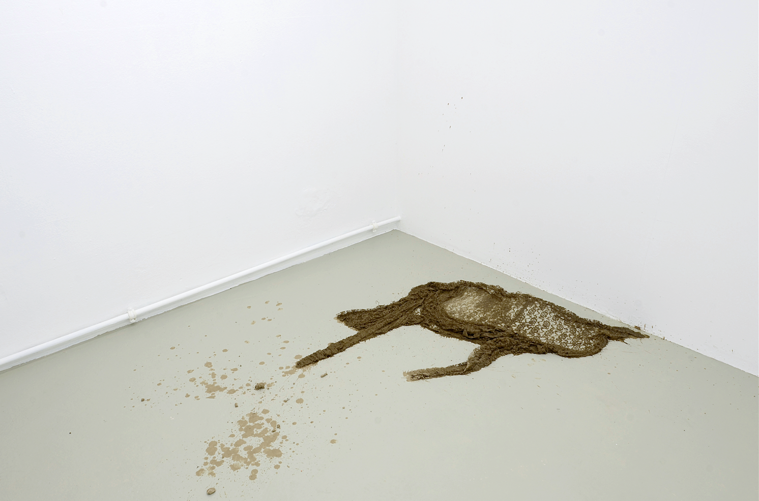 In Kontrast zu den scharfen und glatten digitalen Bildern des Videos stehen die zarten und fragilen Textilskulpturen, die Anna-Sophie Berger im Erdgeschoss präsentiert. Berger, die in Wien transmediale Kunst und Mode studiert hat, bedient sich der skulpturalen Qualität des Materials und schafft so Arbeiten, die zwischen Skulptur, Prozess und Malerei zu schweben scheinen. Aus Polyester-Spitze hat sie Malerkittel geschneidert, die nun in lehmige Erde getränkt, noch feucht auf dem Boden liegen. An den Wänden und neben den schmutzigen Stoffen sind Spuren zu sehen, malerische Referenzen, das Produkt eines performativen Vorgangs. Langsam trocknen diese feuchten, verletzlichen Gebilde, ändern ihre Farbe und Festigkeit. Eine ephemere Qualität, die den Bezug zum Prozess offenbart: Zu sehen sind die noch in Veränderung befindlichen Ergebnisse eines expressiven Prozesses, der eine gewisse Brutalität in sich trägt. Der Schmutz steht in direktem Kontrast zum artifiziellen Material, die Sensualität und Physikalität in Kontrast zum körperlosen Digitalen des Videos. Während Berger in den Videos noch passiver und interessierter Betrachter ist, steht bei den Skulpturen eine aktive, offene und direkte Auseinandersetzung in Zentrum. Die Kittel als Arbeitskleidung der Künstlerin werden zum haptischen Material und bleiben dennoch leere Hüllen, der arbeitende Körper, den sie umschließen sollen ist entschwunden. Dreck und Oberfläche, Arbeit und Müßiggang, Kunst und Mode, digitale Bilder und die Textur von Stoffen. Anna-Sophie Berger arbeitet nicht nur interdisziplinär und ohne eine Begrenzung der Ausdrucksmittel, sie kombiniert und löst Dualismen und Gegensätze, sie versucht Komplexitäten gerecht zu werden und Heterogenität anzunehmen. Zusätzlich zu den Räumen nutzt Anna-Sophie Berger auch die Pressemitteilung, die über die Mailinglisten und das Soziale-Web eine eigene Öffentlichkeit entwickelt, als bespielbare Fläche. Ihr poetisches Fragment liest sich dabei als artist’s statement und Ausgangspunkt für einen künstlerischen Versuch: