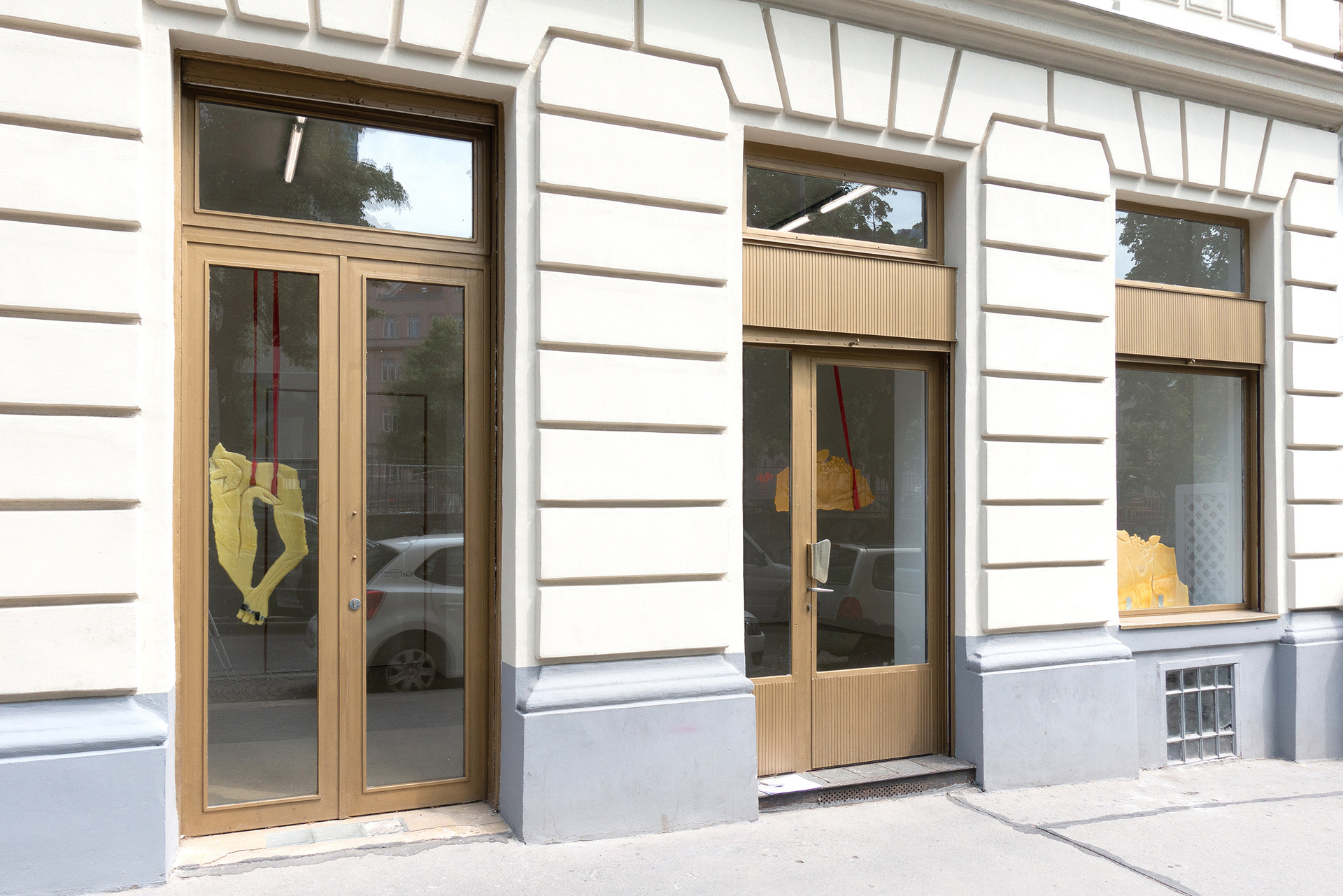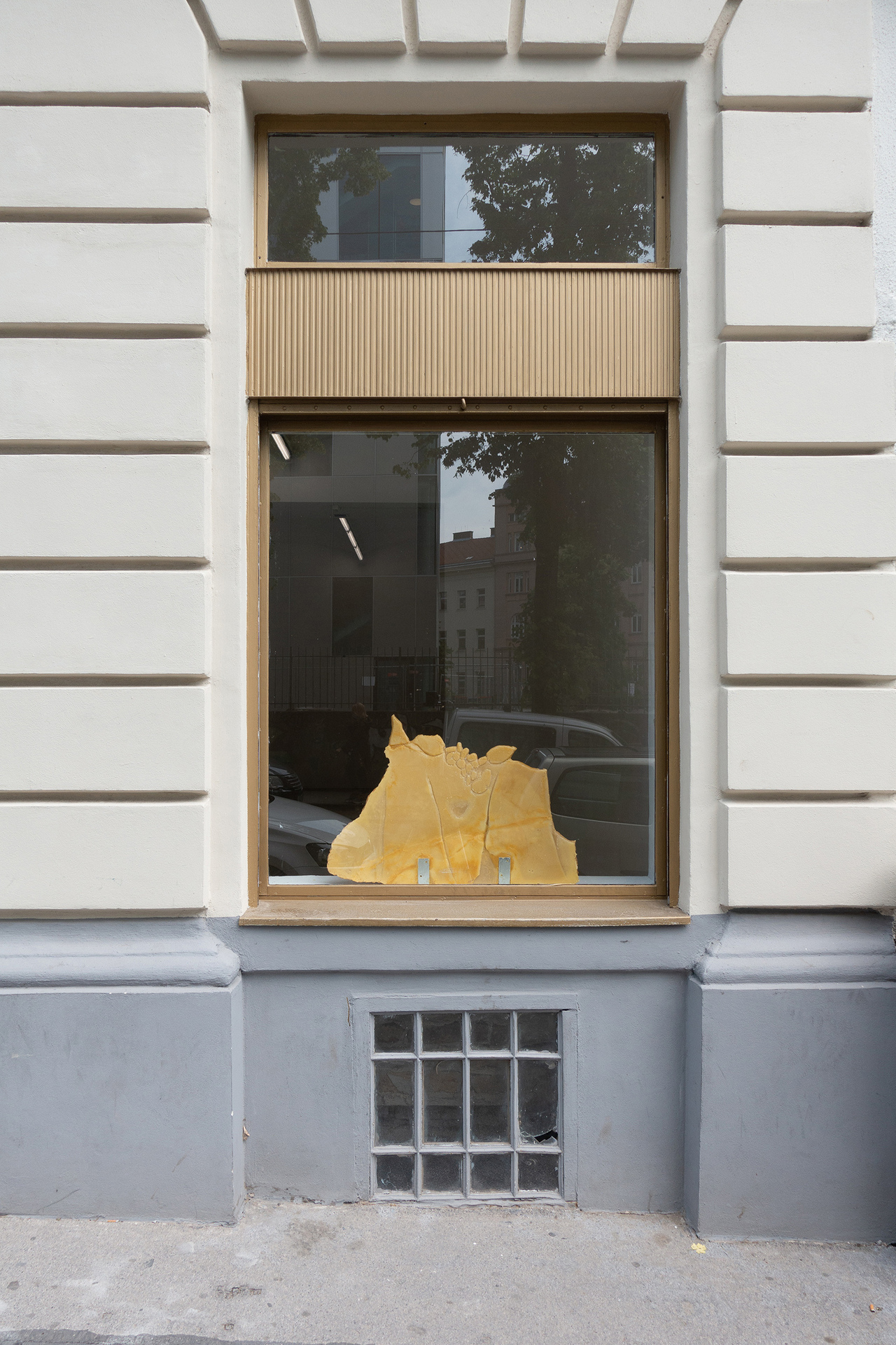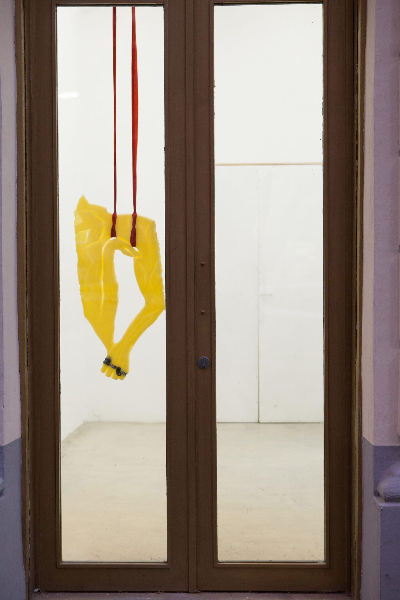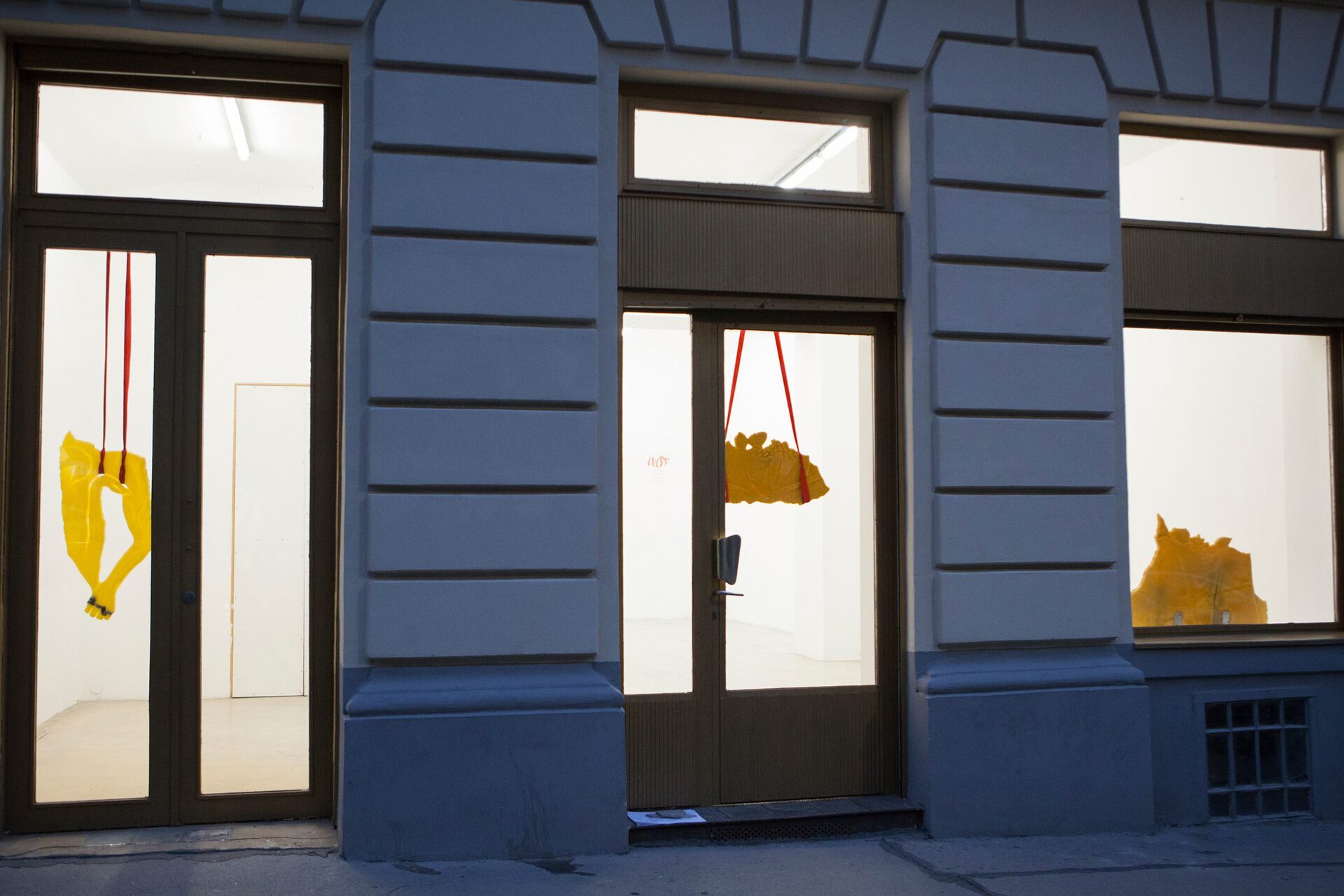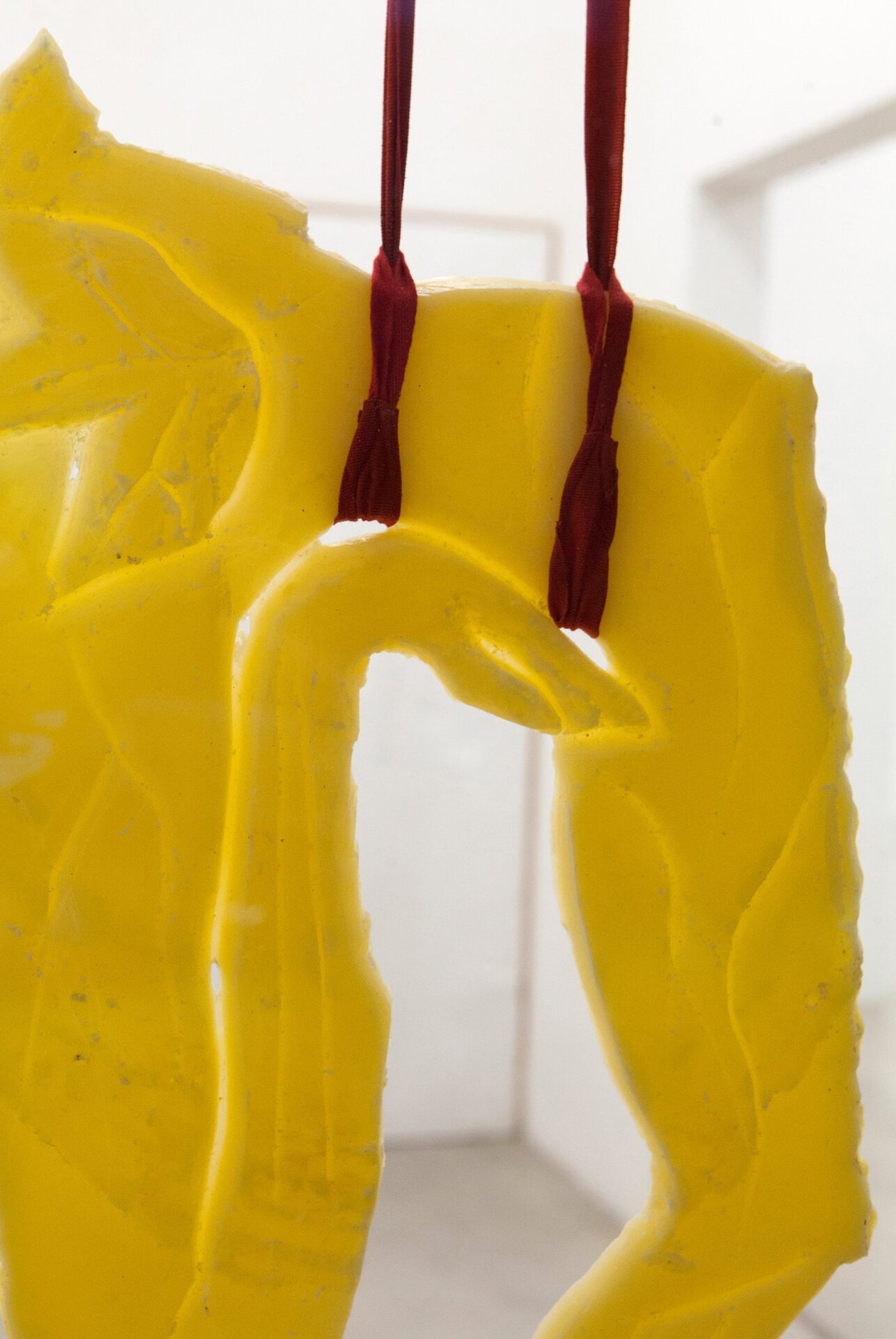 Juliana Lindenhofer, Boys Without Fruit Basket Die künstlerische Praxis von Juliana Lindenhofer (* 1987 in Graz, lebt und arbeitet in Wien) konzentriert Formen von respektvoller Aneignung, sensiblem Material-bewusstsein und einem architektonischen wie rhetorischen Raumgreifen und findet Ausdruck in Skulpturen und DJ-Sets. Die reziproke Beziehung beider ist frei von Zwang und perfektionistischer Restriktion: Beeinflusst u.a. von Techno und der Ballroom-Kultur, nutzt die Künstlerin den Club als Instrument für das Ausprobieren. Auch in ihren Skulpturen findet sich dieser Zugang von Unabhängigkeit und Vulnerabilität. Ihre bevorzugten Materialien Wachs und Metall tragen bewusst hinterlassene Spuren ihrer Hand und werden gegossen, geschmolzen, gehämmert und geschliffen um Ästhetiken des Weichen, Formbaren und Diaphanen zu erzeugen. Es entstehen Samples, die am Ort ihres Verweilens – sei es der Ausstellungsraum, der Club, oder in diesem Fall das Fenster – Raum und Aufmerksamkeit fordern, ohne machtvollen Gesten zu verfallen. Die abstrahierten Körperteile ihrer jüngsten Arbeiten „Boys Without Fruit Basket“ wirken wie Studien für eine überlebensgroße Effigie von Caravaggios „Jüngling mit dem Früchtekorb“ (ca. 1593), auf den der Titel referenziert. Aus pigmentiertem Paraffinwachs modelliert wurden sie – durch Enthauptung entmachtet – des verführerischen Blickes ihres Vorbildes beraubt und zugleich um Volumen und Geschlechtlichkeit reduziert. Flach wie Reliefs, androgyn in ihrer Gestalt und mit nur vereinzelten Frucht- und Blattsymbolen geschmückt, sind es jedoch weder explizit männlichen Skulpturen, noch haftet ihnen dieselbe Süße an wie Caravaggios Gemälde. Ihr Inkarnat changiert zwischen Ocker und Gelb, die Flora wirkt fahl und die gesamte an Körperflüssigkeiten erinnernde Tonalität erweckt ein latentes Gefühl von Ekel und Schauder. Die Betonung von Nacken und Schultern in den fragmentierten Skulpturen steht in Verbindung mit den Befestigungen der Arbeiten im Schaufenster: rote Boxbandagen, aus dem privaten Gebrauch der Künstlerin, dienen als Träger. Symbolisieren diese für gewöhnlich Stärke und Aggression, so halten sie hier unterstützend und beschützend an fragilen psychologischen wie physischen Konstruktionen fest, die Verletzung und Deformation einschließen, aber keinesfalls abwerten. „Boys Without Fruit Basket“ sind ein Sinnbild für das Verlangen nach hybrider Geschlechtlichkeit, der Auflösung von Machträumen und Formfreiheit. Durch sie gelingt es Juliana Lindenhofer uns für ihre Anliegen in einer Art zu sensibilisieren, die Stärken und Schwächen, Härte und Nachgiebigkeit sowie Einheit und Fragment gleichberechtigt koexistieren lässt.