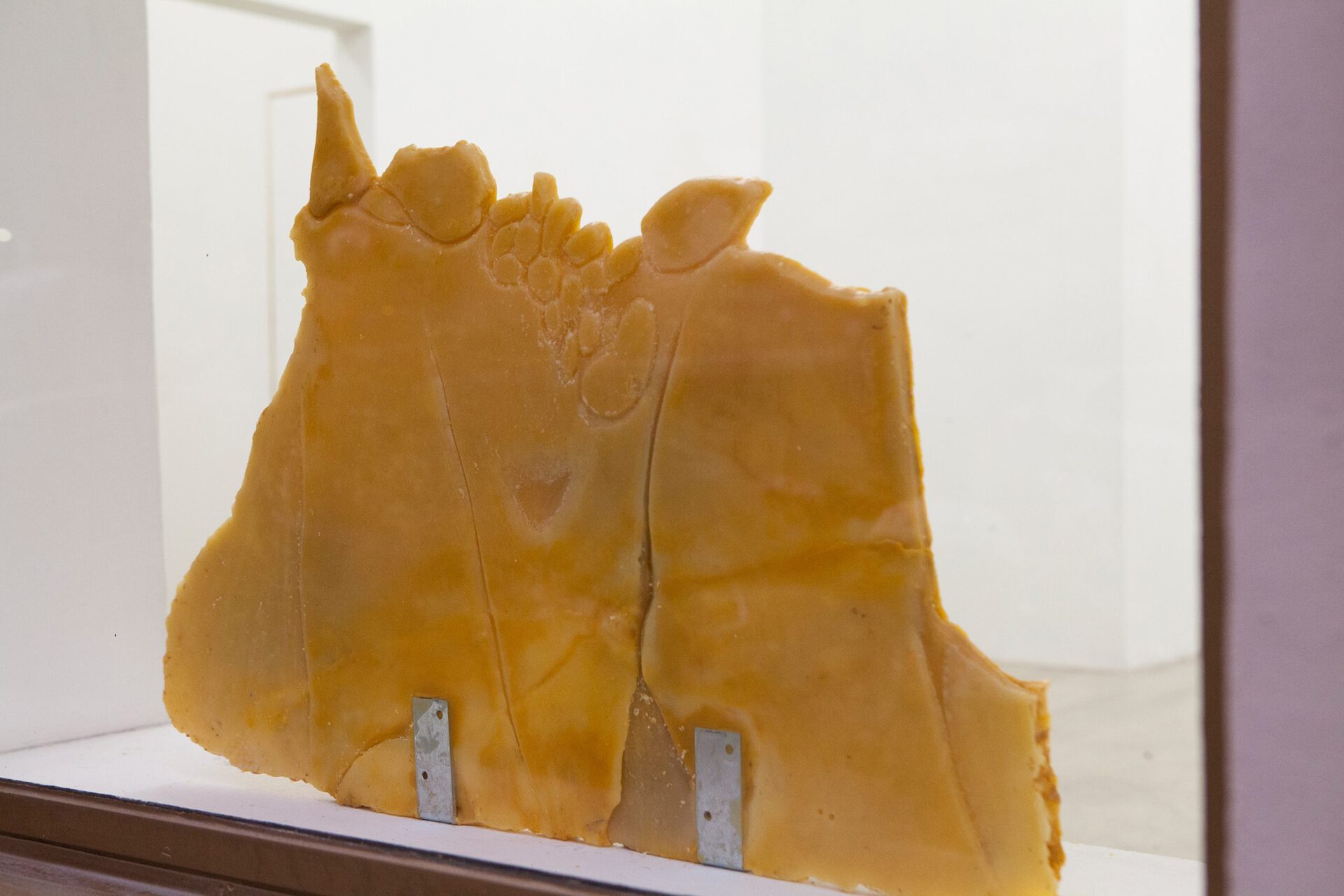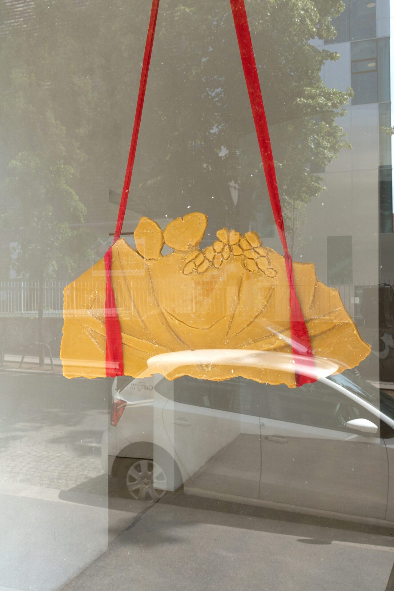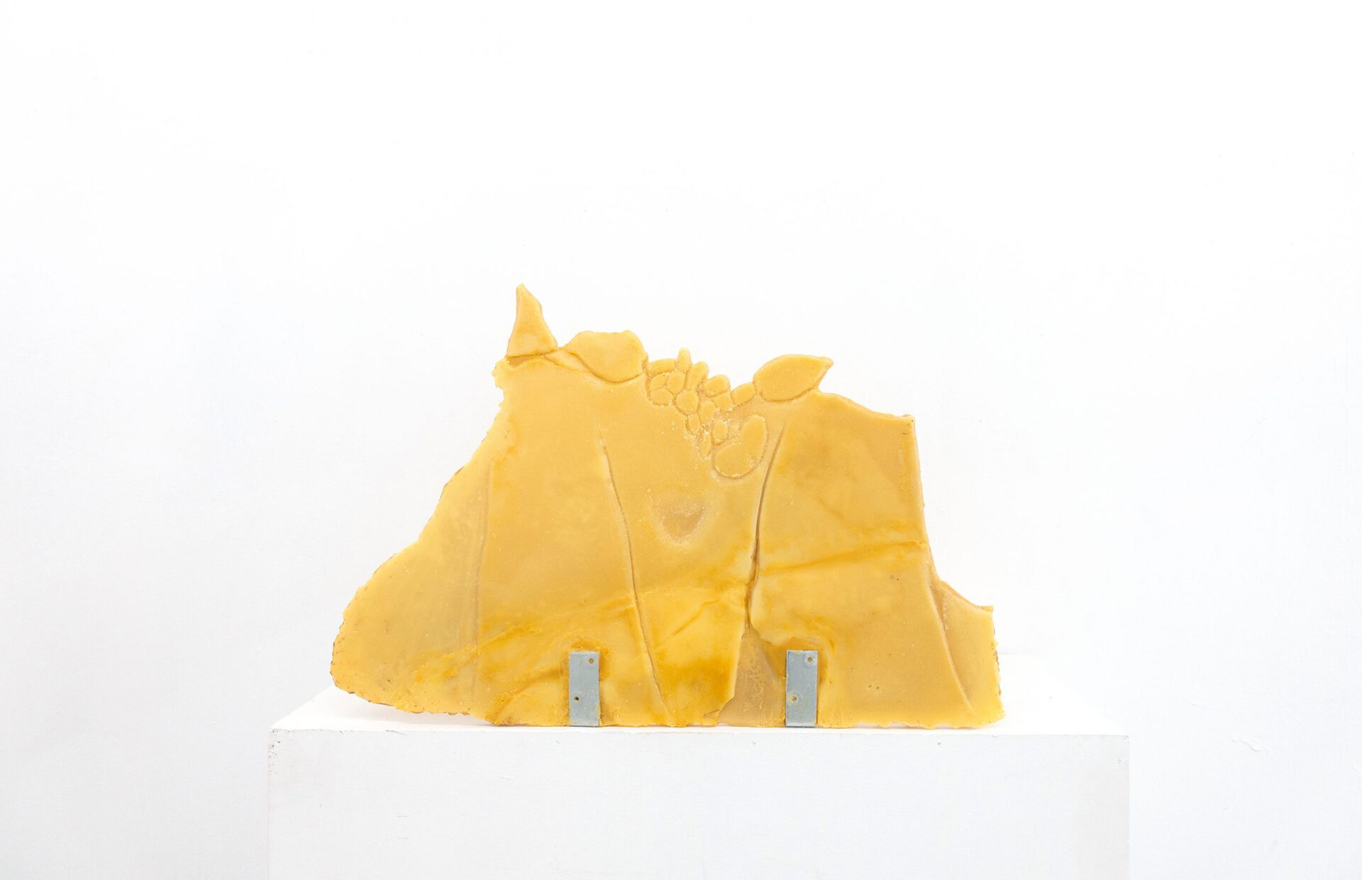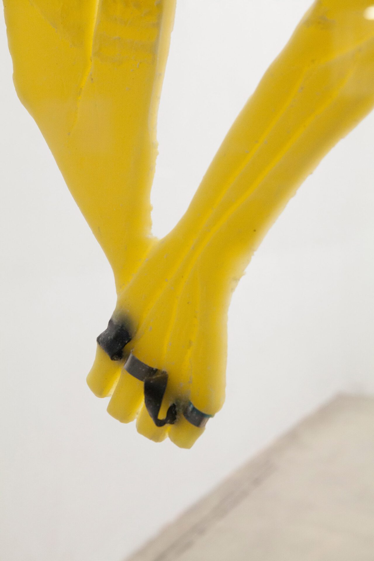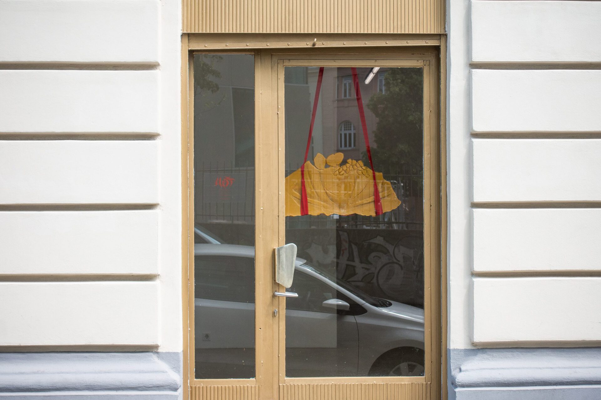 Juliana Lindenhofer, Boys Without Fruit Basket Die künstlerische Praxis von Juliana Lindenhofer (* 1987 in Graz, lebt und arbeitet in Wien) konzentriert Formen von respektvoller Aneignung, sensiblem Material-bewusstsein und einem architektonischen wie rhetorischen Raumgreifen und findet Ausdruck in Skulpturen und DJ-Sets. Die reziproke Beziehung beider ist frei von Zwang und perfektionistischer Restriktion: Beeinflusst u.a. von Techno und der Ballroom-Kultur, nutzt die Künstlerin den Club als Instrument für das Ausprobieren. Auch in ihren Skulpturen findet sich dieser Zugang von Unabhängigkeit und Vulnerabilität. Ihre bevorzugten Materialien Wachs und Metall tragen bewusst hinterlassene Spuren ihrer Hand und werden gegossen, geschmolzen, gehämmert und geschliffen um Ästhetiken des Weichen, Formbaren und Diaphanen zu erzeugen. Es entstehen Samples, die am Ort ihres Verweilens – sei es der Ausstellungsraum, der Club, oder in diesem Fall das Fenster – Raum und Aufmerksamkeit fordern, ohne machtvollen Gesten zu verfallen. Die abstrahierten Körperteile ihrer jüngsten Arbeiten „Boys Without Fruit Basket“ wirken wie Studien für eine überlebensgroße Effigie von Caravaggios „Jüngling mit dem Früchtekorb“ (ca. 1593), auf den der Titel referenziert. Aus pigmentiertem Paraffinwachs modelliert wurden sie – durch Enthauptung entmachtet – des verführerischen Blickes ihres Vorbildes beraubt und zugleich um Volumen und Geschlechtlichkeit reduziert. Flach wie Reliefs, androgyn in ihrer Gestalt und mit nur vereinzelten Frucht- und Blattsymbolen geschmückt, sind es jedoch weder explizit männlichen Skulpturen, noch haftet ihnen dieselbe Süße an wie Caravaggios Gemälde. Ihr Inkarnat changiert zwischen Ocker und Gelb, die Flora wirkt fahl und die gesamte an Körperflüssigkeiten erinnernde Tonalität erweckt ein latentes Gefühl von Ekel und Schauder. Die Betonung von Nacken und Schultern in den fragmentierten Skulpturen steht in Verbindung mit den Befestigungen der Arbeiten im Schaufenster: rote Boxbandagen, aus dem privaten Gebrauch der Künstlerin, dienen als Träger. Symbolisieren diese für gewöhnlich Stärke und Aggression, so halten sie hier unterstützend und beschützend an fragilen psychologischen wie physischen Konstruktionen fest, die Verletzung und Deformation einschließen, aber keinesfalls abwerten. „Boys Without Fruit Basket“ sind ein Sinnbild für das Verlangen nach hybrider Geschlechtlichkeit, der Auflösung von Machträumen und Formfreiheit. Durch sie gelingt es Juliana Lindenhofer uns für ihre Anliegen in einer Art zu sensibilisieren, die Stärken und Schwächen, Härte und Nachgiebigkeit sowie Einheit und Fragment gleichberechtigt koexistieren lässt.