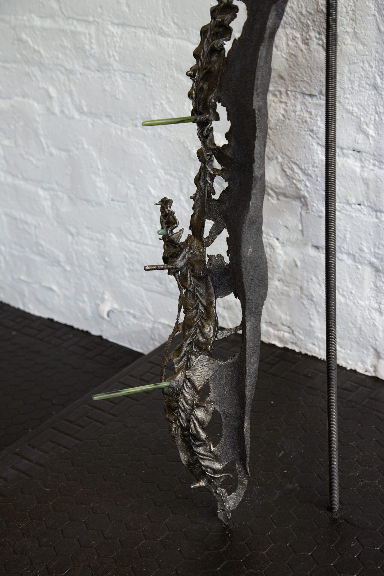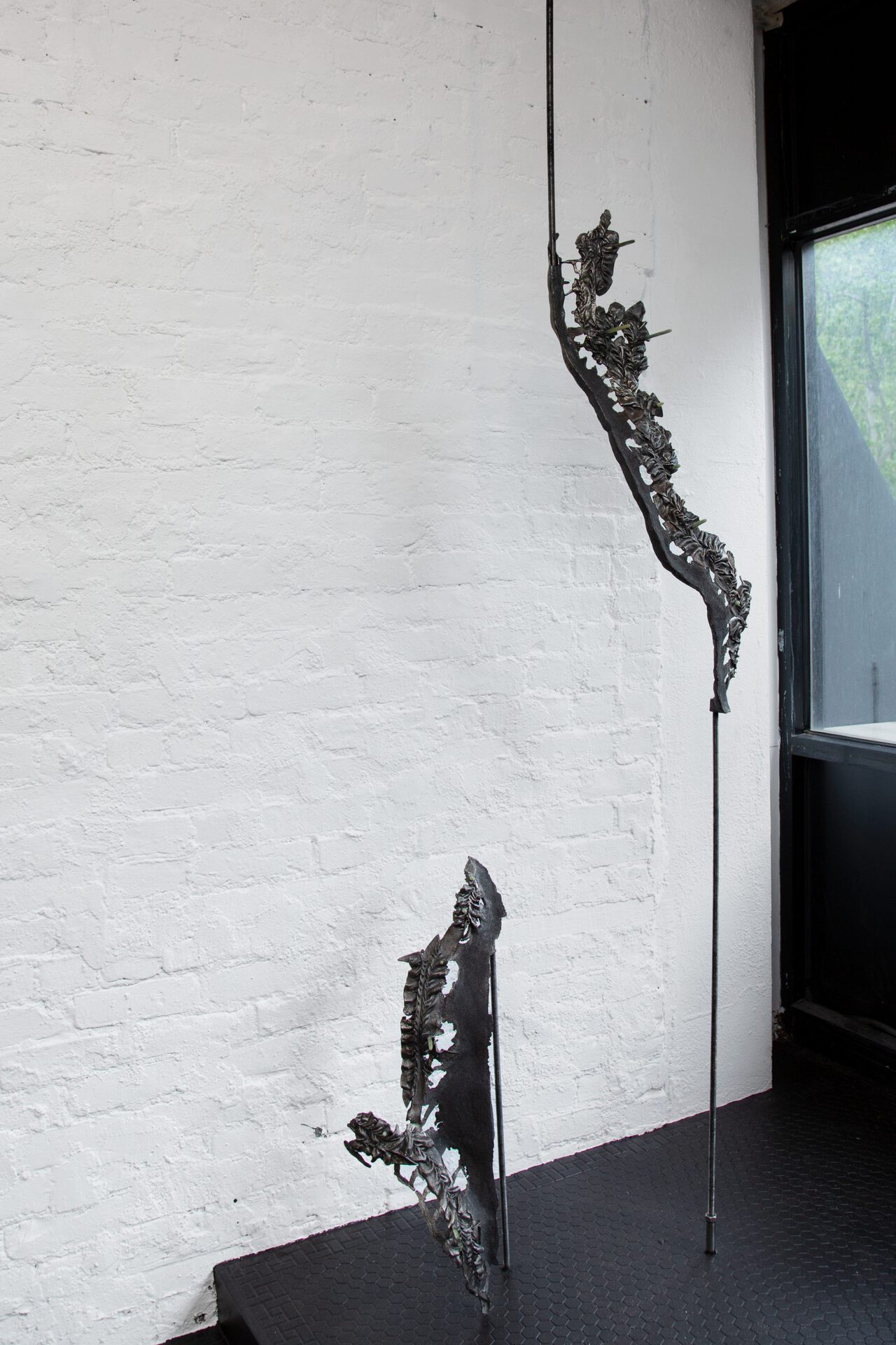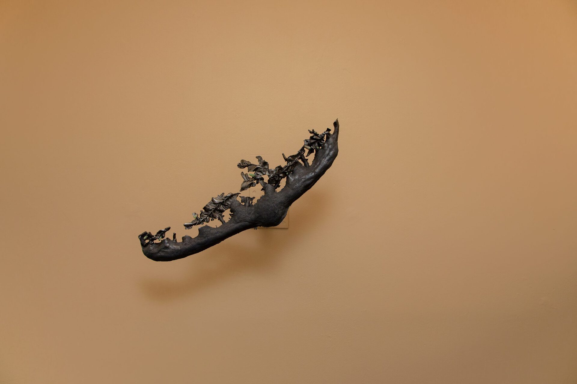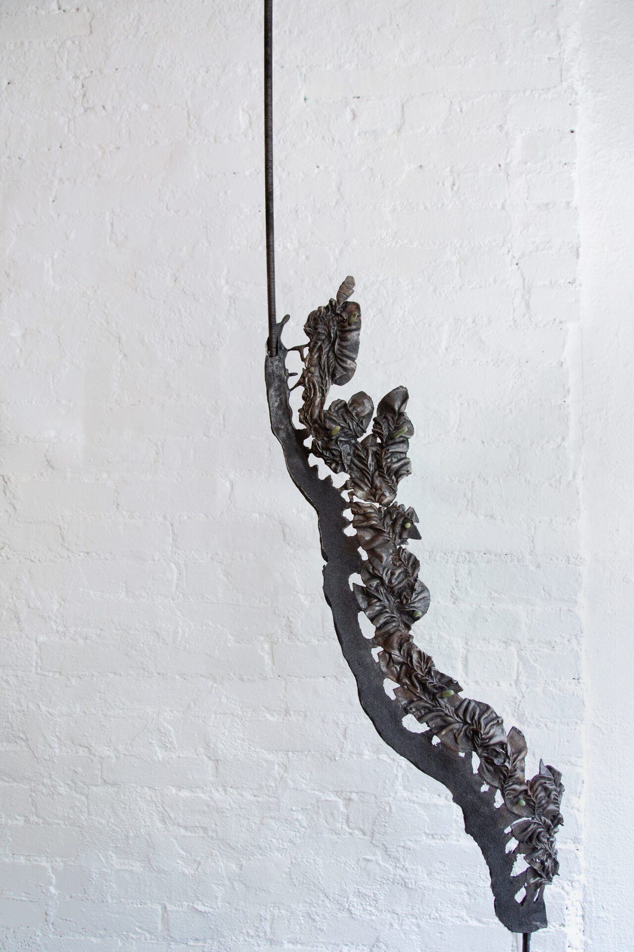 For Alice Gong Xiaowen, translation is both method and subject. The ephemeral becomes solid. Light becomes heft. The lowly hallowed. Memory becomes matter. The familiar becomes alien and the domestic industrial. Bodies become texts. She casts dough, pinched with the seams of the dumpling wrappers her grandmother taught her to make, into steel, itself made from pig iron through a process of chemical translation—literalizing the ingots they symbolize. And she does so in the American mills where men once manufactured steel for the railroads before the production was offshored to China—two nations she is from but neither to which she belongs. The resulting figures emerge like entrails freshly excised—the kind that used to be steamed and read—their pinches now sutures straining to hold the impossible together.