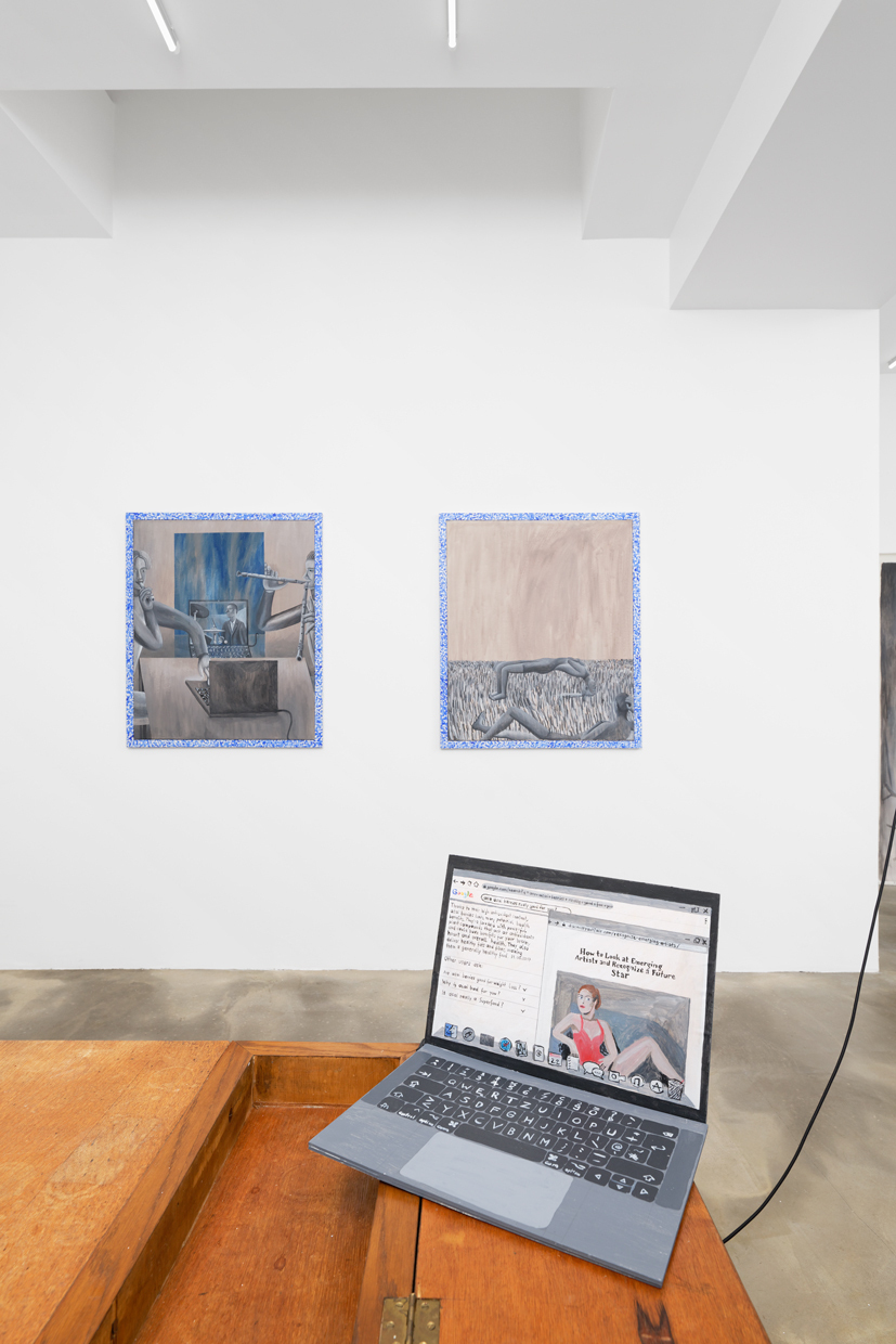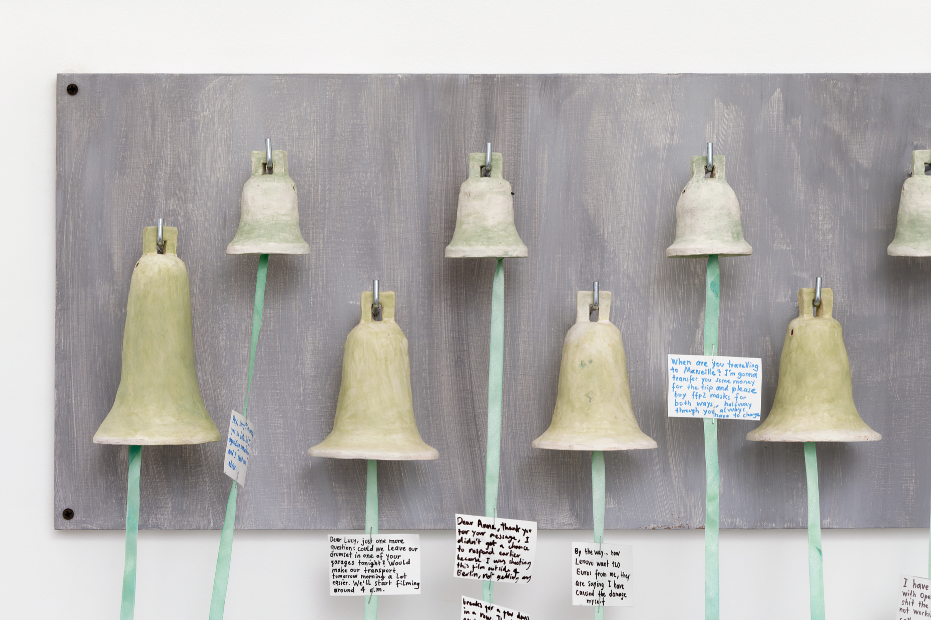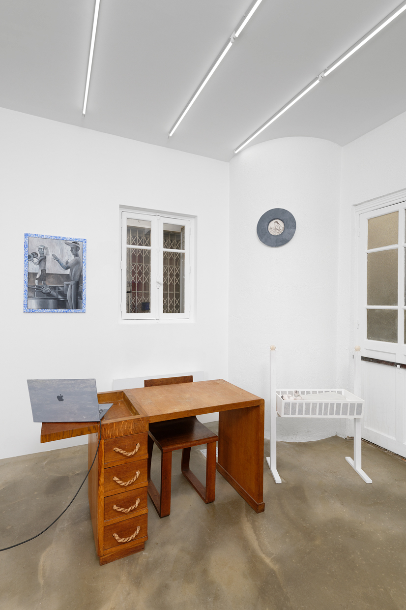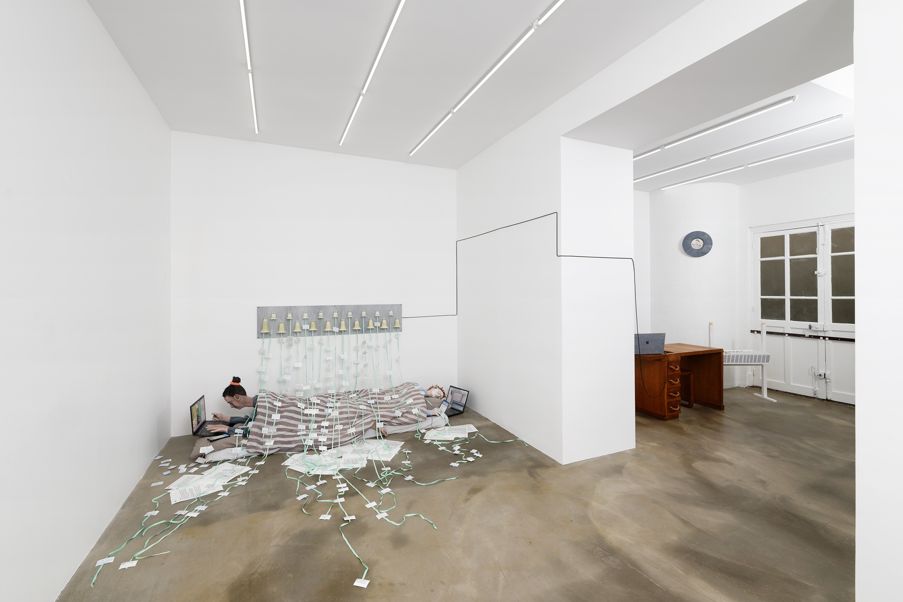 Occupying the entire gallery space, Scherer’s installation leads us along the preca- rious realities of life in the culture industry. The modern maid-of-all-work is permanently available and communicates all the time. Scattered all over the gallery’s floor one finds (painted) prints of e-mails written to and by employers, gallerists, collaborators and the job centre. The centrepiece of the exhibition is a long bell board: an antiquated call sys- tem, the cables of which connect the gallerist’s desk in the antechamber with the exhi- bition space in the back. There, beneath these servants‘ bells, a sculptural arrangement represents two women lying on a mattress, working with laptops and mobile phones. We recognise them as revenants of the artist herself. Their contradictory state between rest and hounded productivity conveys a form of existence in which the boundary between the private and the professional is completely blurred: life becomes a 24/7-job.