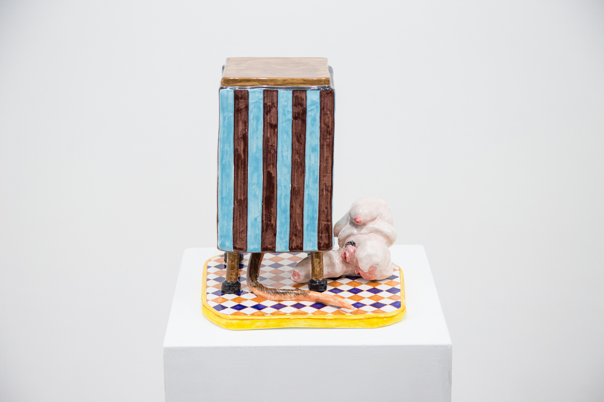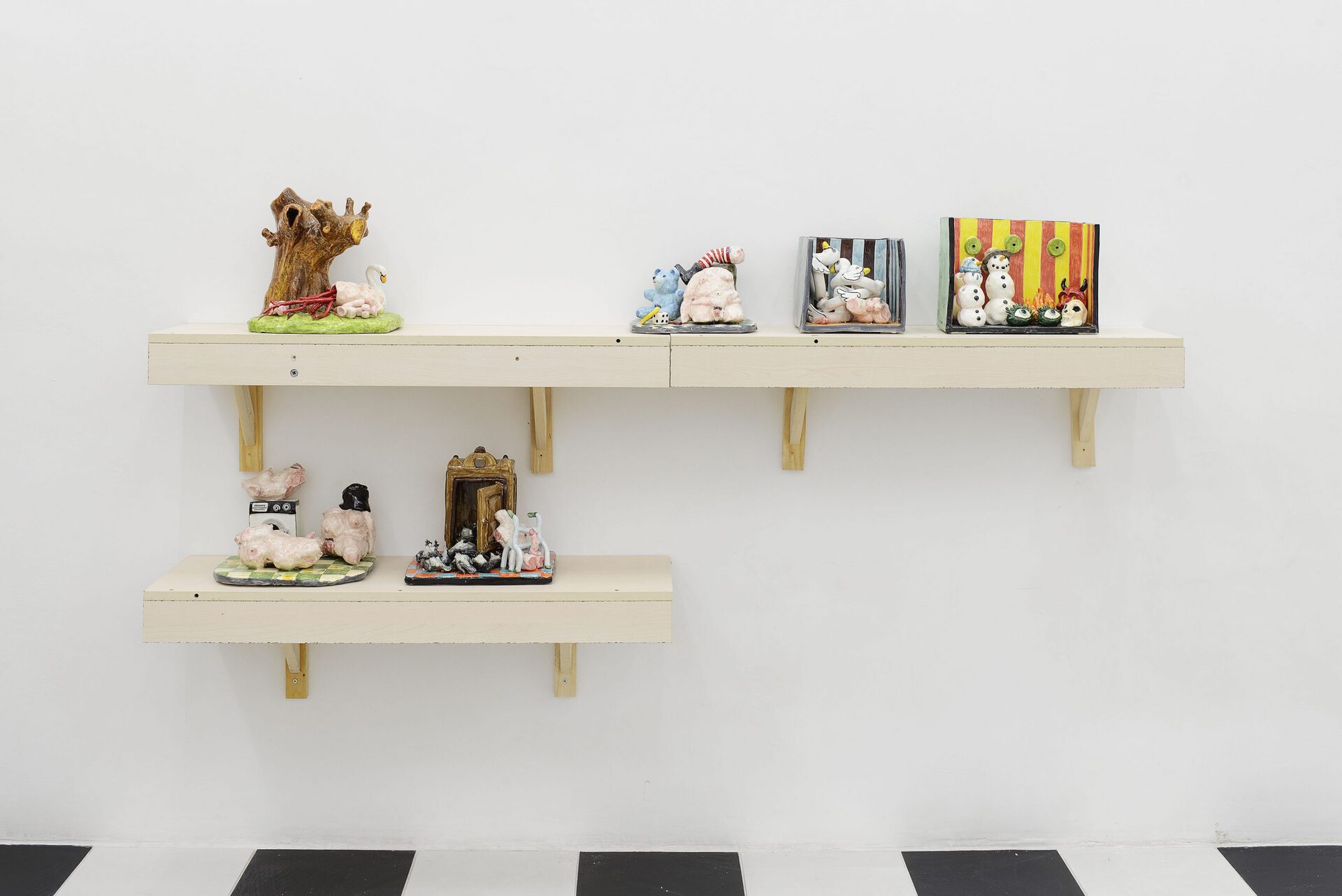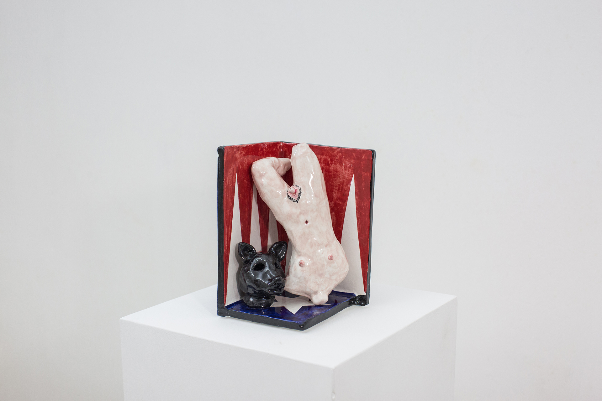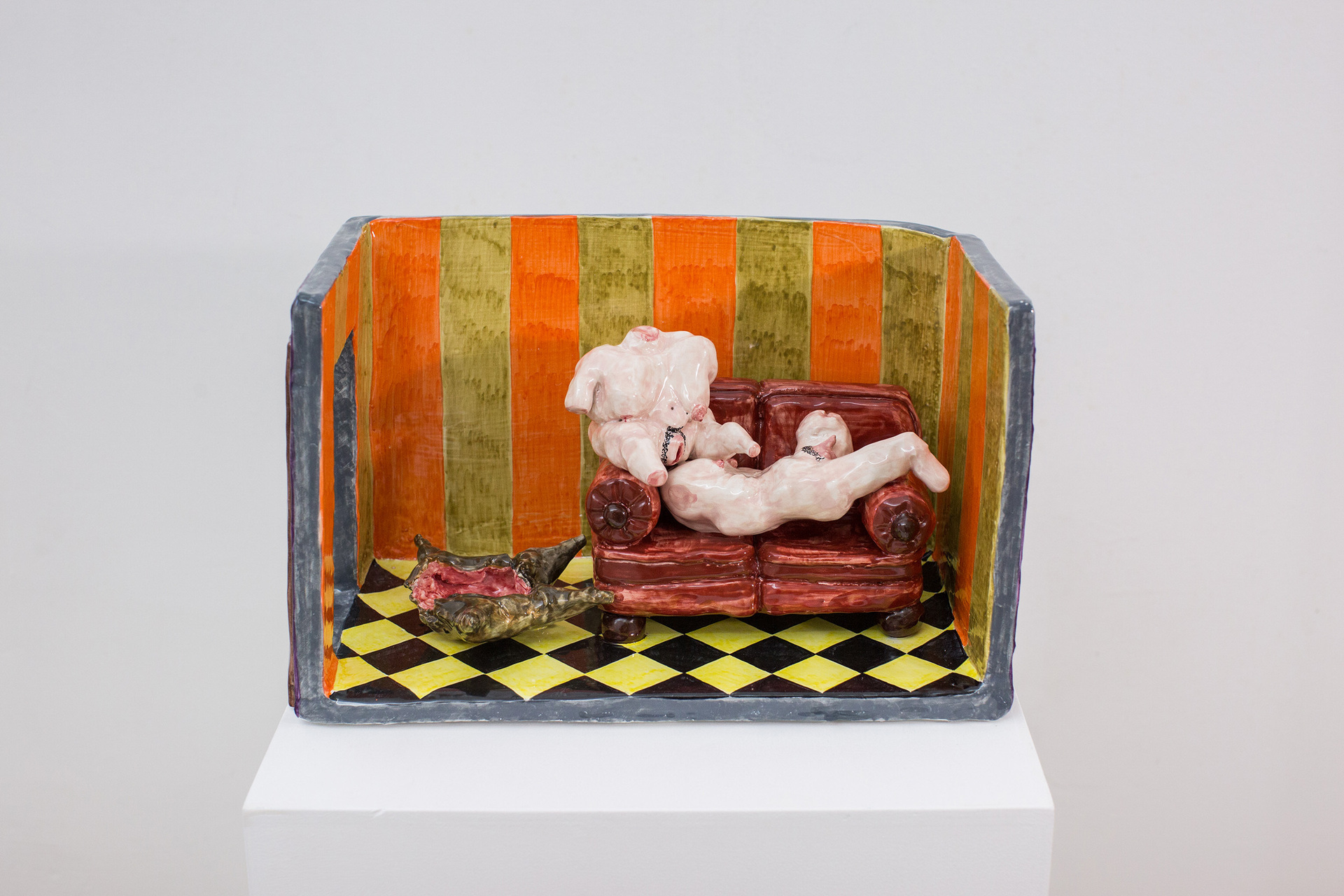Eva Hide is a duo composed by Leonardo Moscogiuri and Mario Suglia. The exhibition is composed by a selection of 25 small sculptures in painted majolica, produced by the duo, born in Puglia and based in London, between the 2018 and 2019. The indissoluble bond between death and sexuality, loneliness and diversity steeped in Eva Hide’s work is narrated in each scene depicted by the artwork, which reveals itself as plastic still frame, a “frozen” instant extracted from a long movie. In Eva Hide’s practise the objective depiction of reality leaves its place to a more perceptive dimension transfigured by corruption and degradation, where the exposed and caricatural sex gives life to a deliberated pornography that alludes to the need of love and to constant danger burdening on ingenuity of human nature.Text
