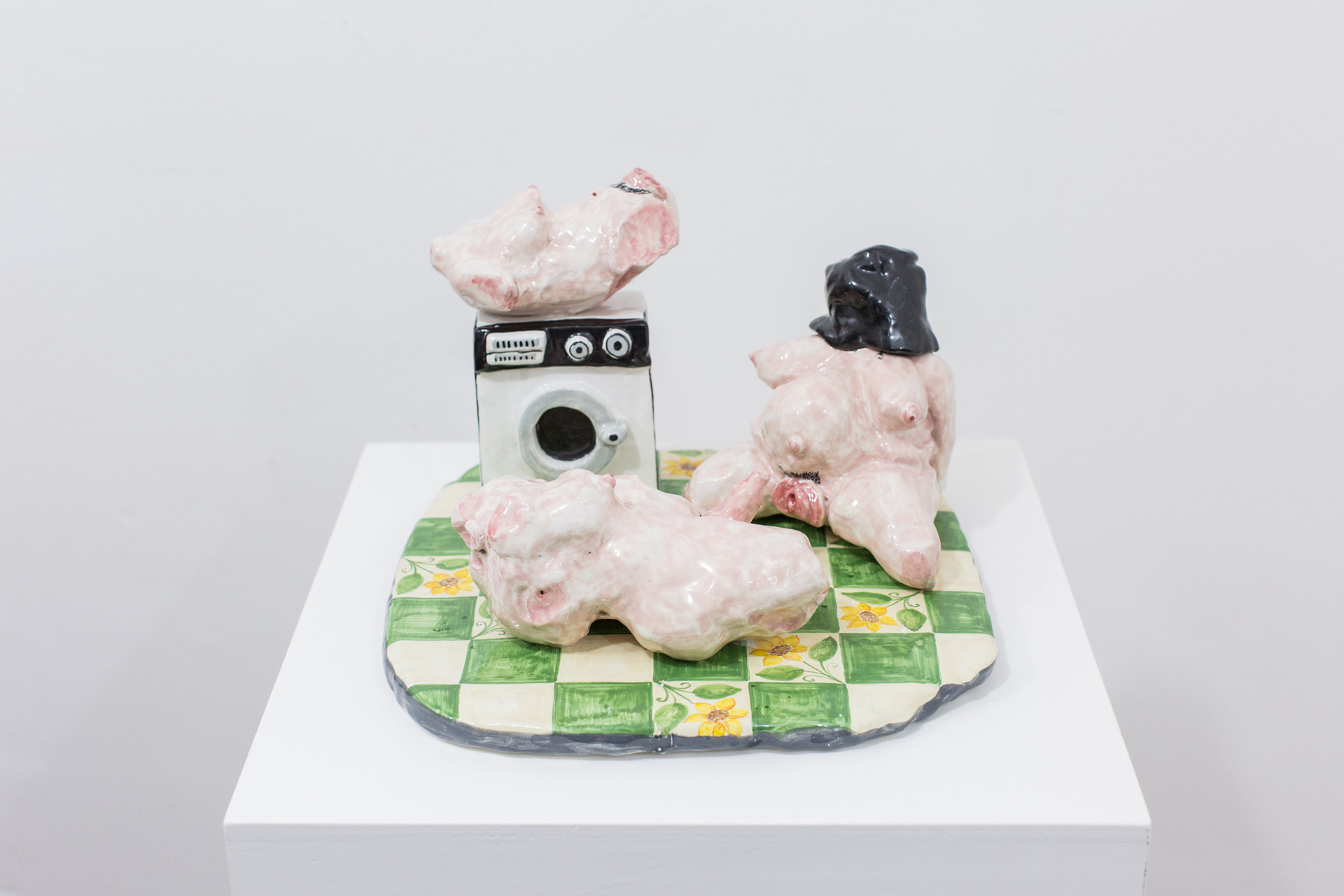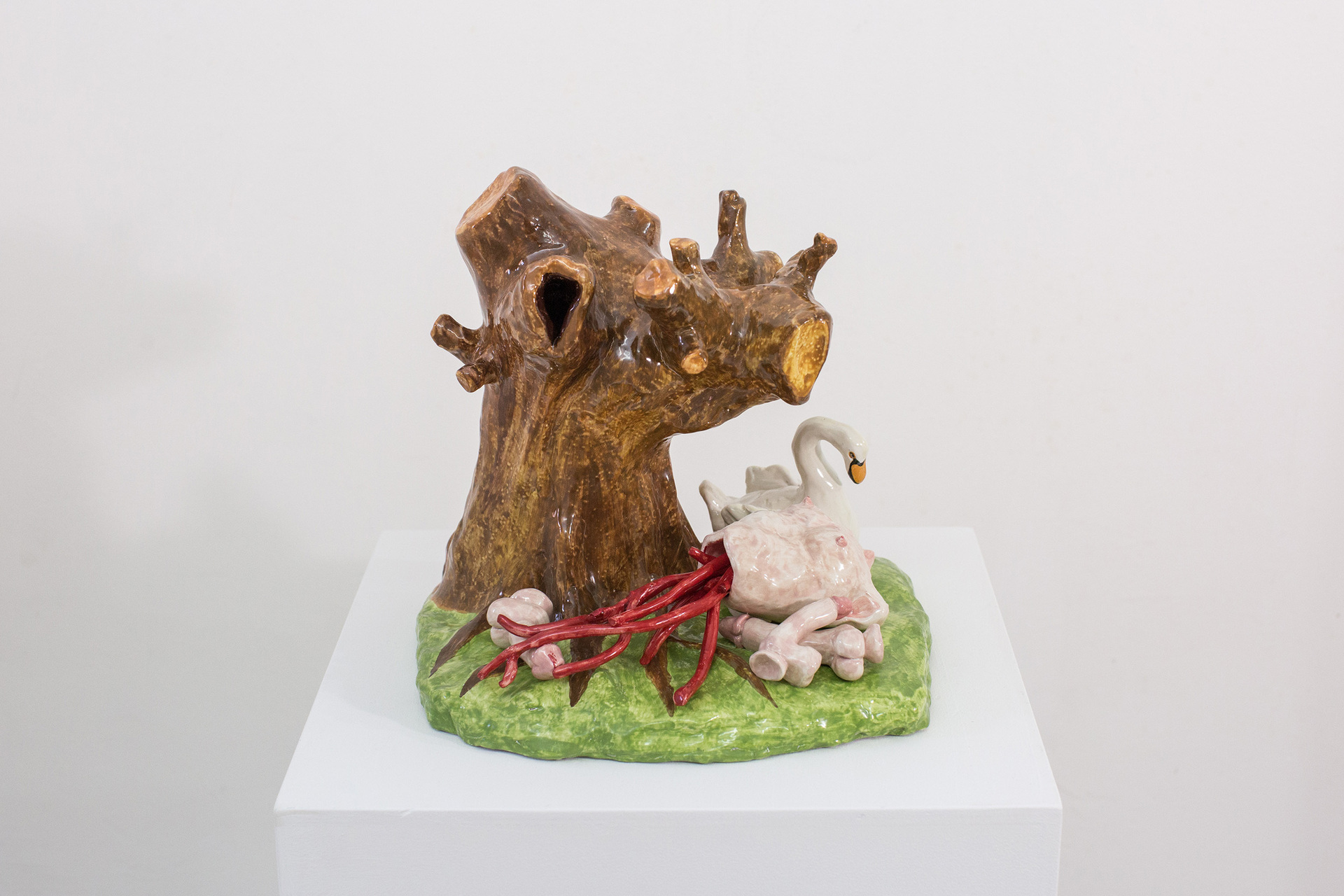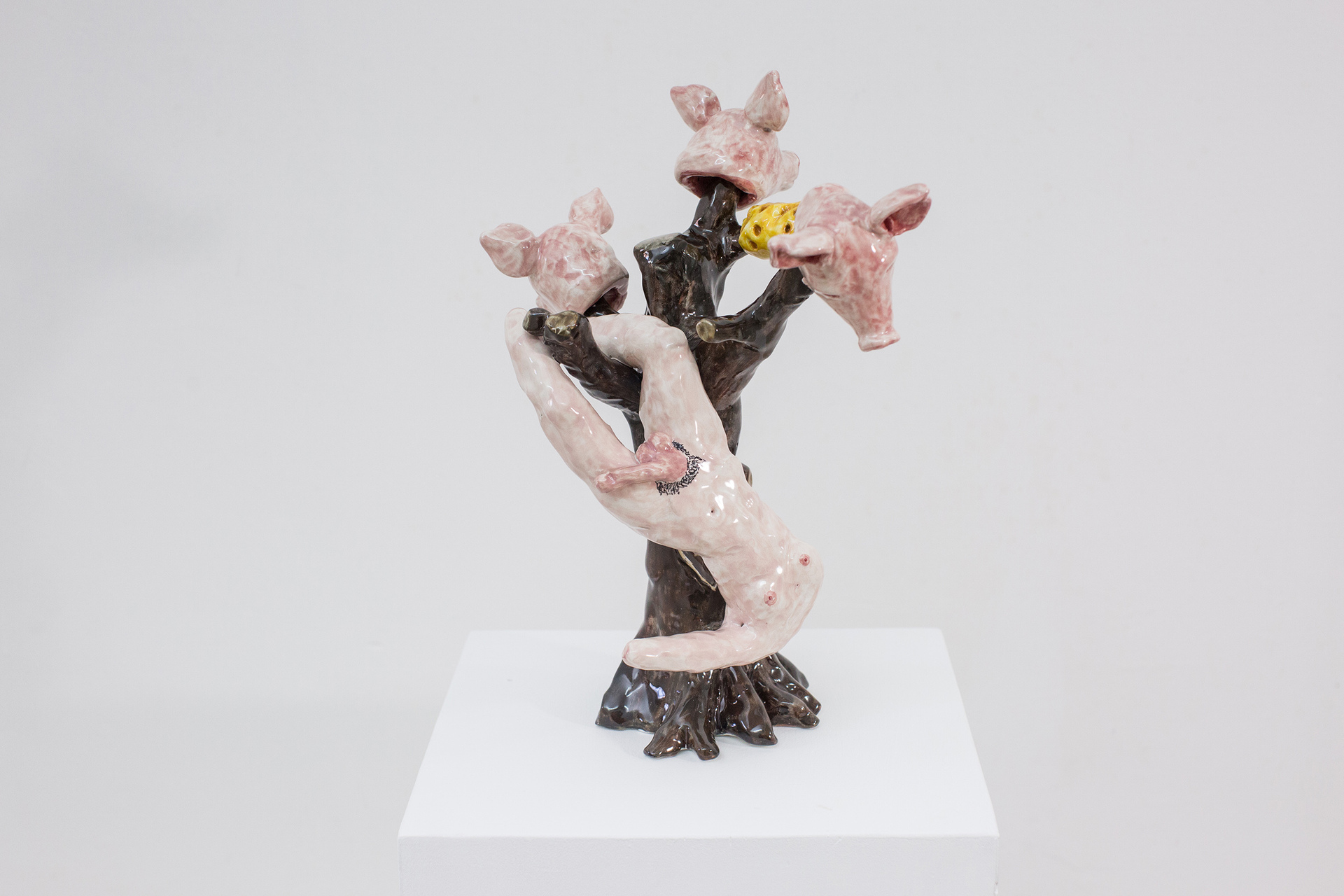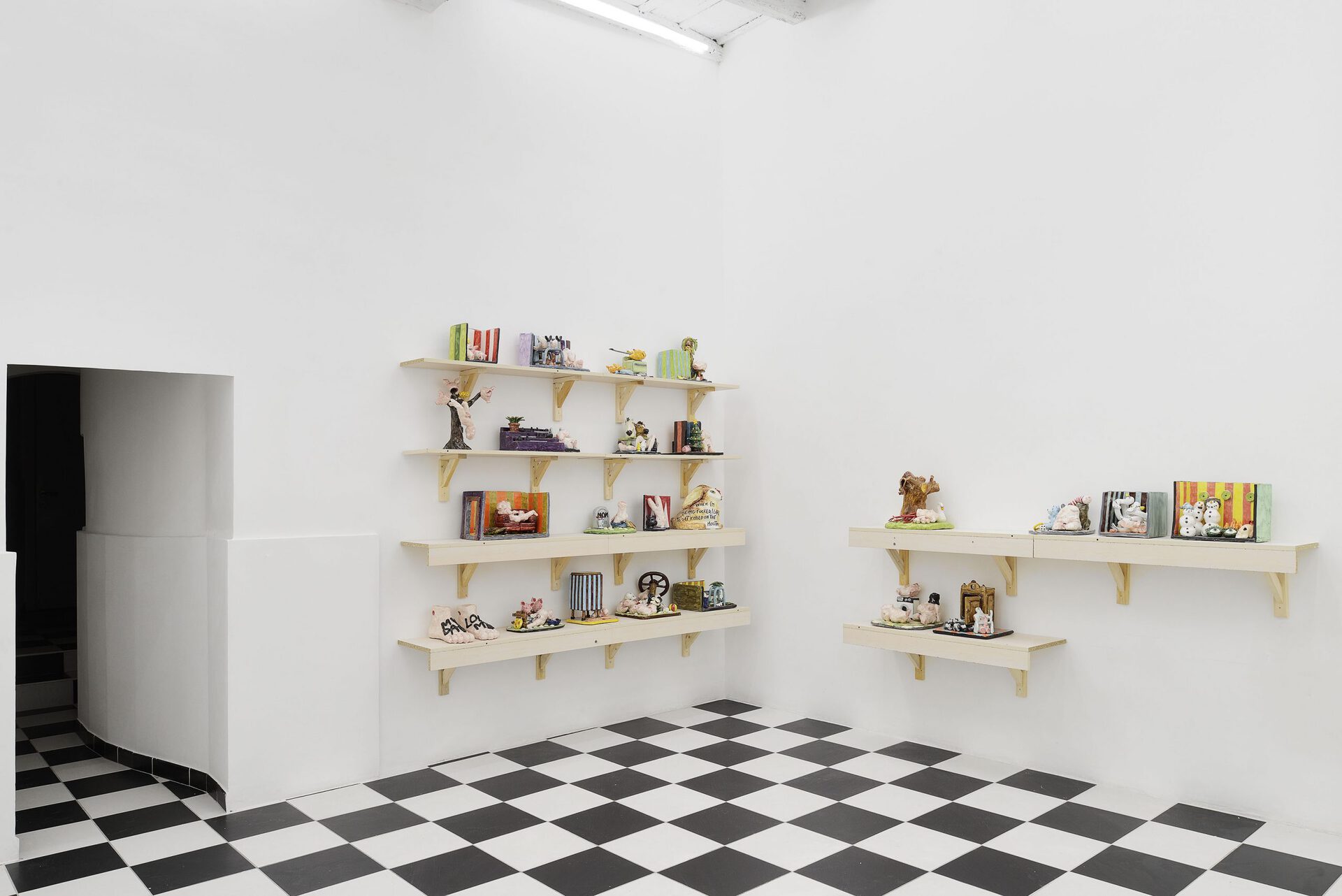 Eva Hide is a duo composed by Leonardo Moscogiuri and Mario Suglia. The exhibition is composed by a selection of 25 small sculptures in painted majolica, produced by the duo, born in Puglia and based in London, between the 2018 and 2019. The indissoluble bond between death and sexuality, loneliness and diversity steeped in Eva Hide’s work is narrated in each scene depicted by the artwork, which reveals itself as plastic still frame, a “frozen” instant extracted from a long movie. In Eva Hide’s practise the objective depiction of reality leaves its place to a more perceptive dimension transfigured by corruption and degradation, where the exposed and caricatural sex gives life to a deliberated pornography that alludes to the need of love and to constant danger burdening on ingenuity of human nature.Text