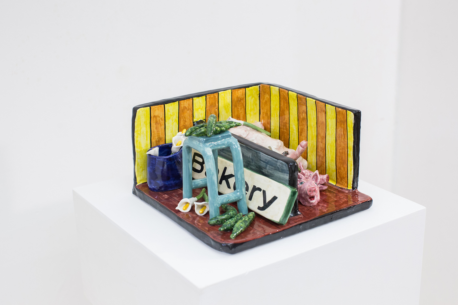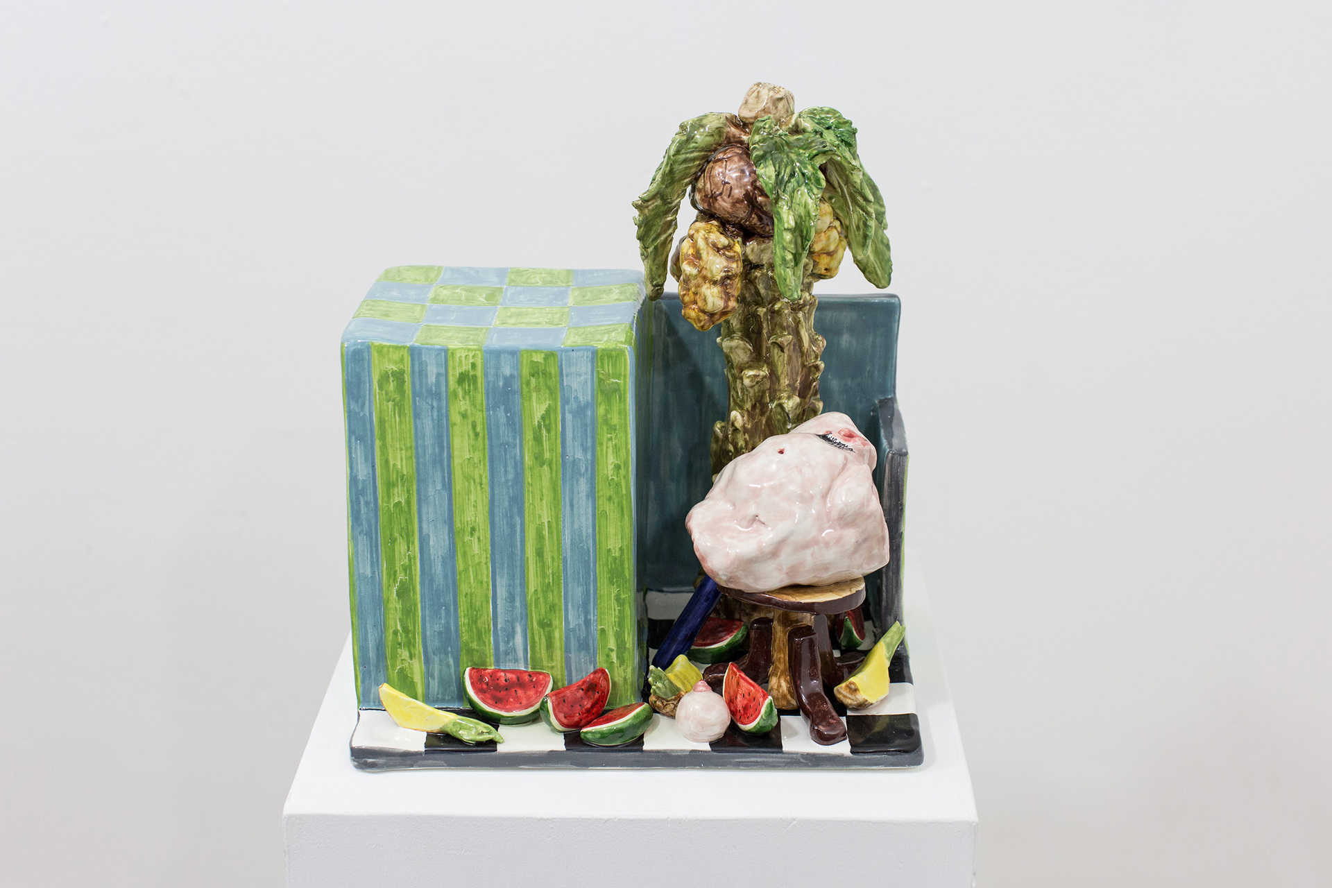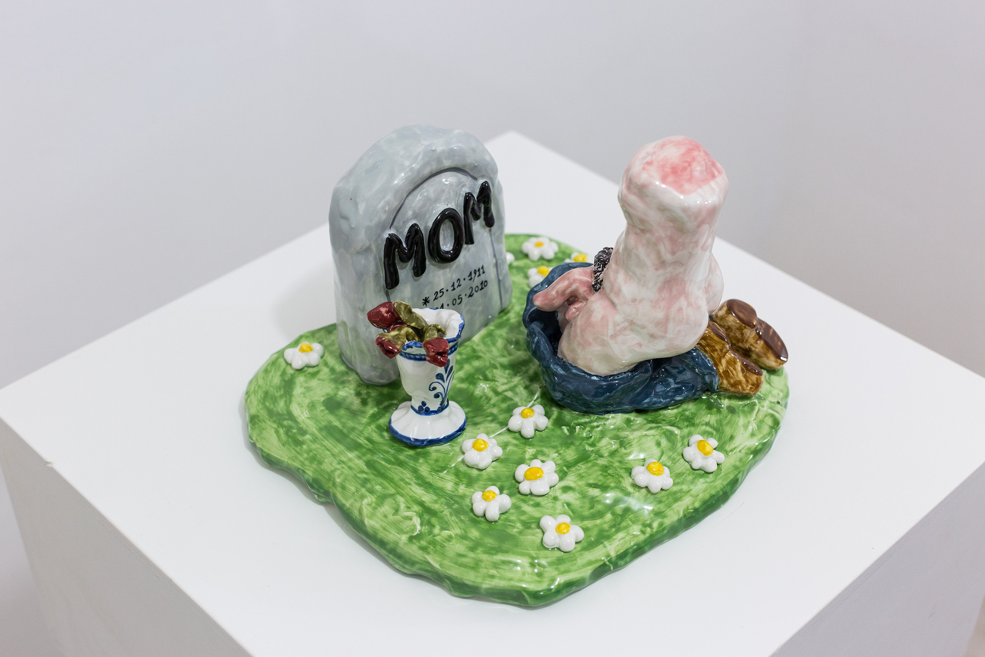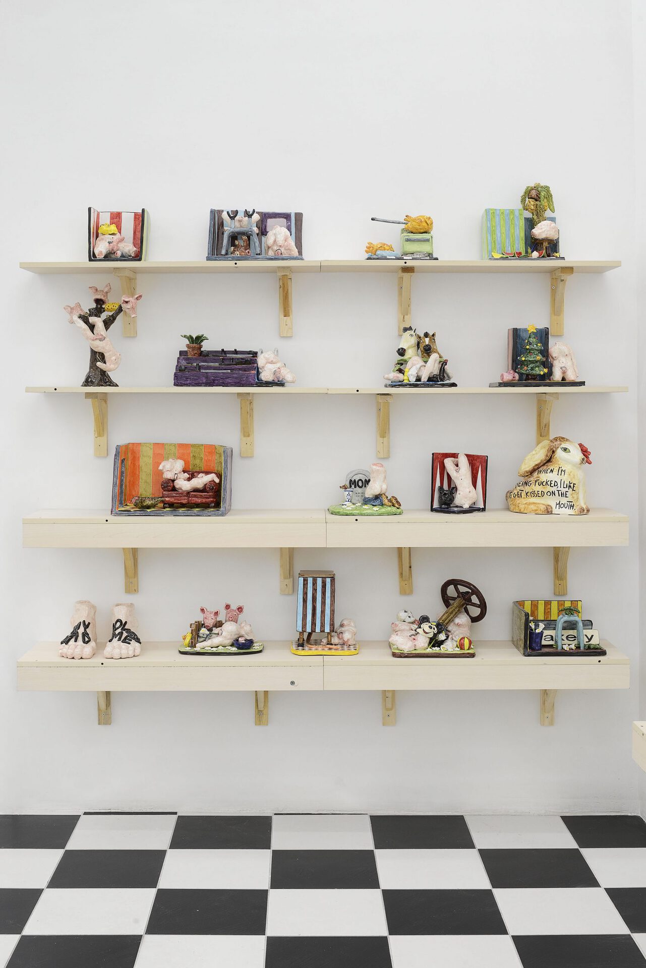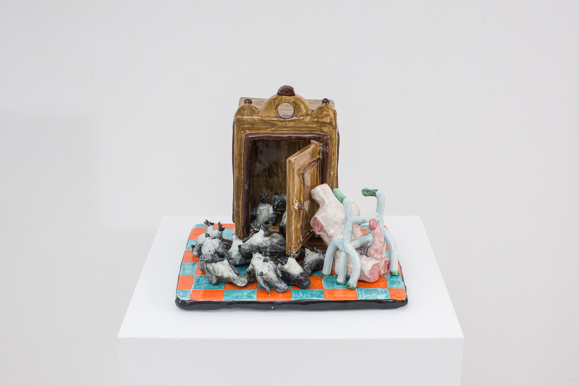 Eva Hide is a duo composed by Leonardo Moscogiuri and Mario Suglia. The exhibition is composed by a selection of 25 small sculptures in painted majolica, produced by the duo, born in Puglia and based in London, between the 2018 and 2019. The indissoluble bond between death and sexuality, loneliness and diversity steeped in Eva Hide’s work is narrated in each scene depicted by the artwork, which reveals itself as plastic still frame, a “frozen” instant extracted from a long movie. In Eva Hide’s practise the objective depiction of reality leaves its place to a more perceptive dimension transfigured by corruption and degradation, where the exposed and caricatural sex gives life to a deliberated pornography that alludes to the need of love and to constant danger burdening on ingenuity of human nature.Text