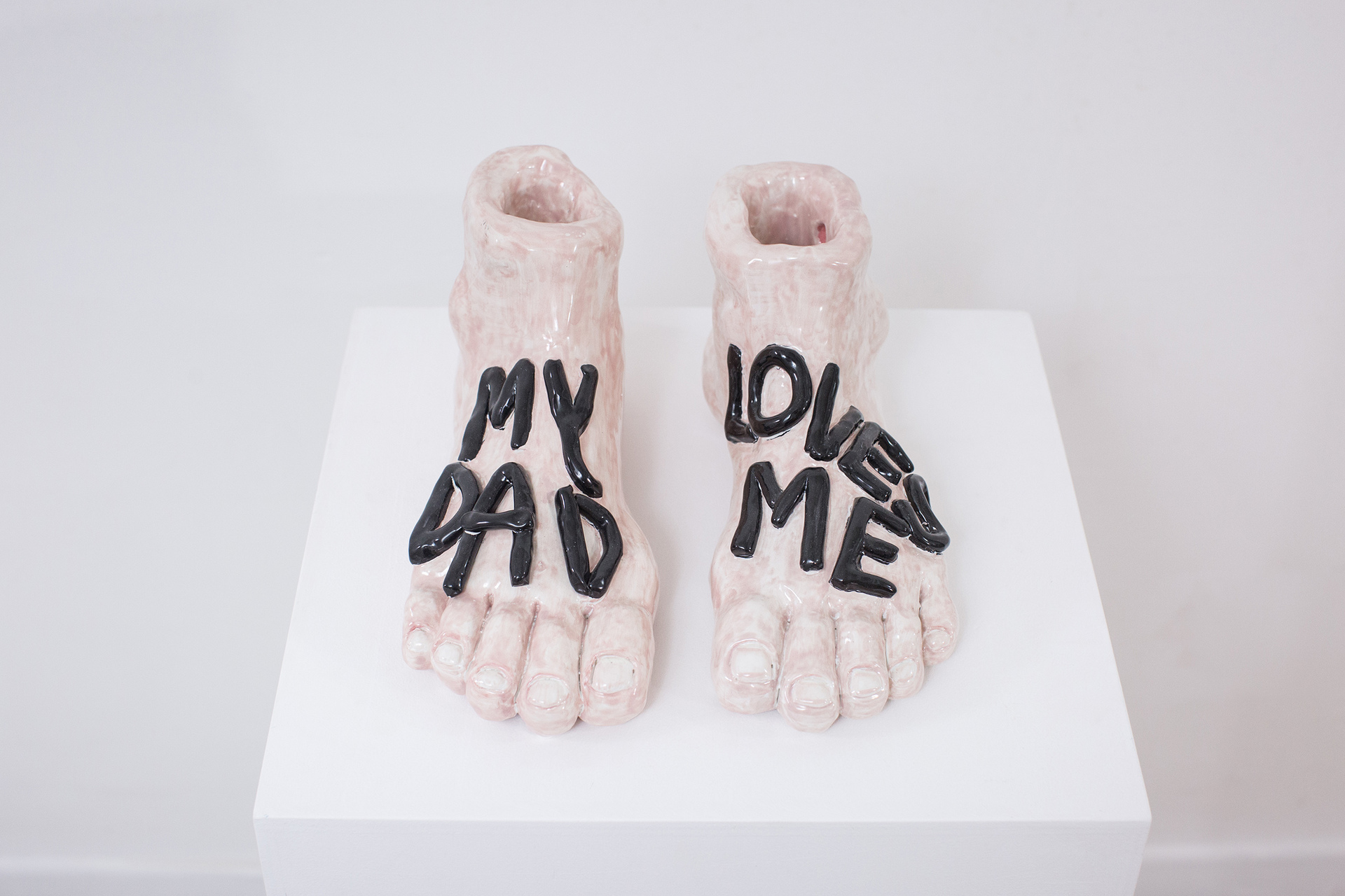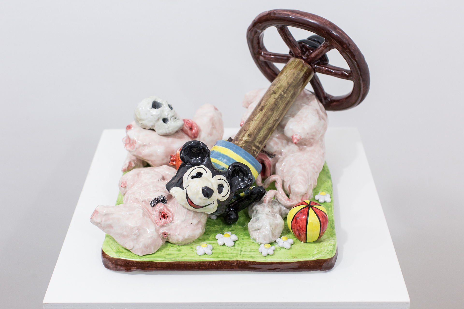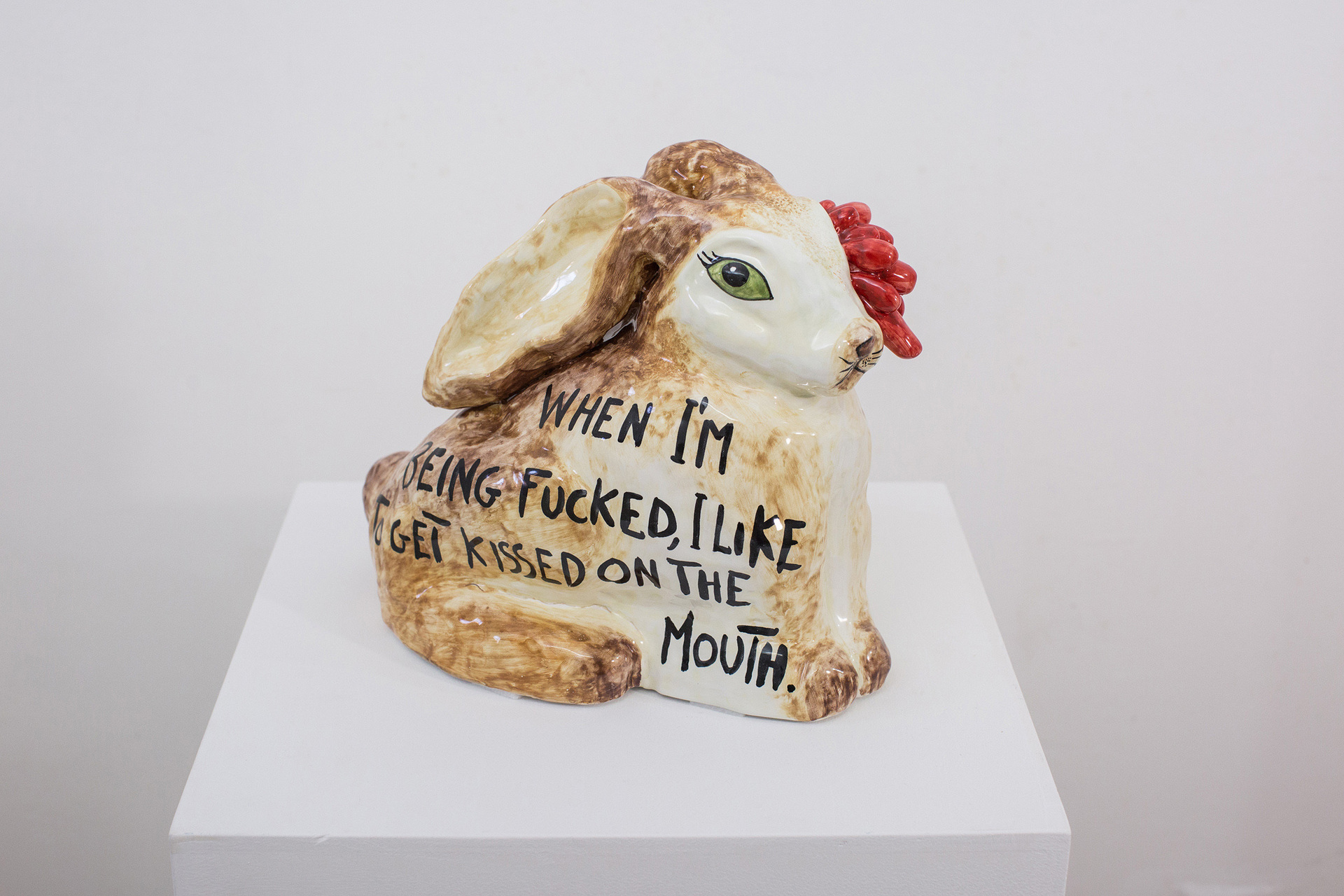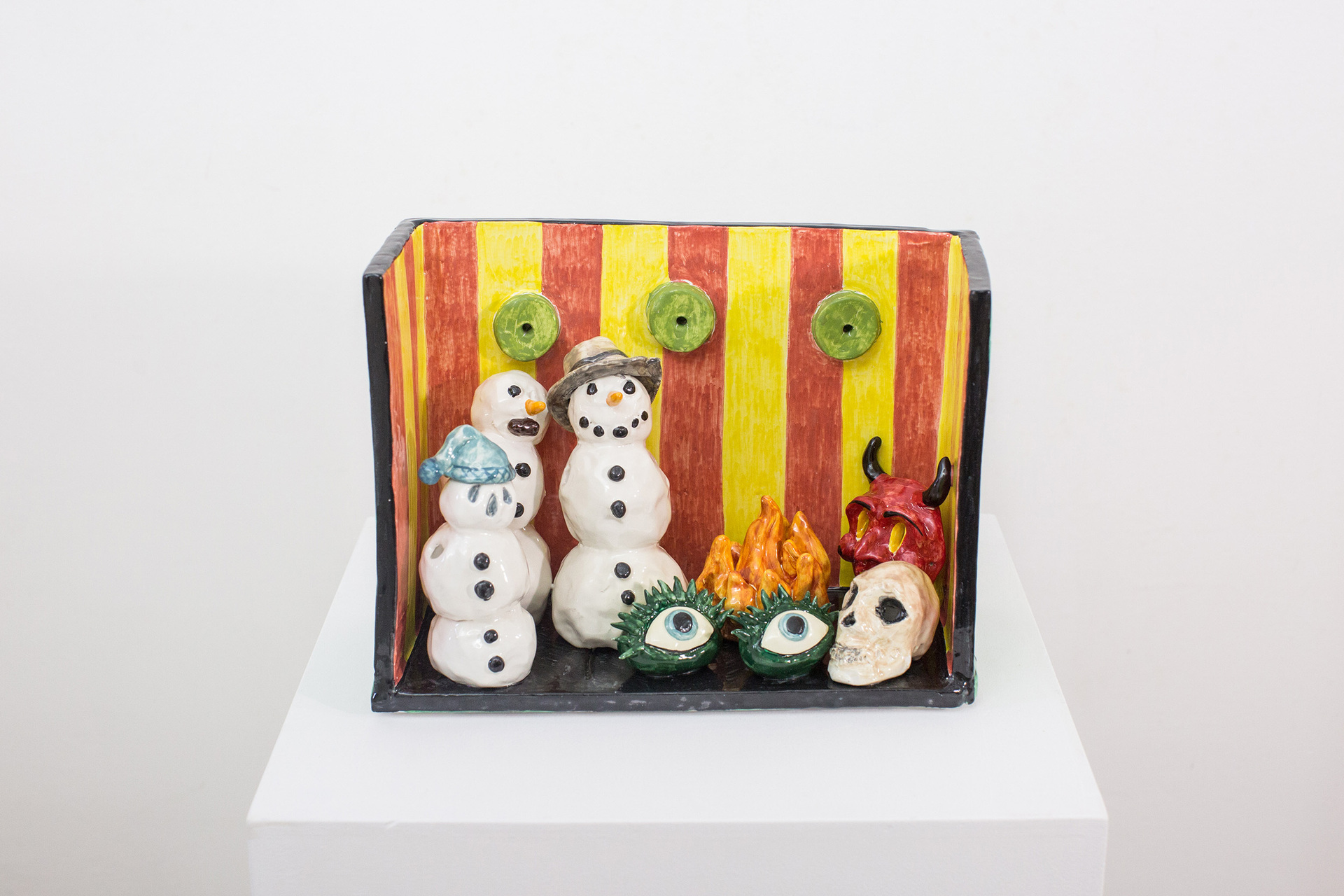 Eva Hide is a duo composed by Leonardo Moscogiuri and Mario Suglia. The exhibition is composed by a selection of 25 small sculptures in painted majolica, produced by the duo, born in Puglia and based in London, between the 2018 and 2019. The indissoluble bond between death and sexuality, loneliness and diversity steeped in Eva Hide’s work is narrated in each scene depicted by the artwork, which reveals itself as plastic still frame, a “frozen” instant extracted from a long movie. In Eva Hide’s practise the objective depiction of reality leaves its place to a more perceptive dimension transfigured by corruption and degradation, where the exposed and caricatural sex gives life to a deliberated pornography that alludes to the need of love and to constant danger burdening on ingenuity of human nature.Text