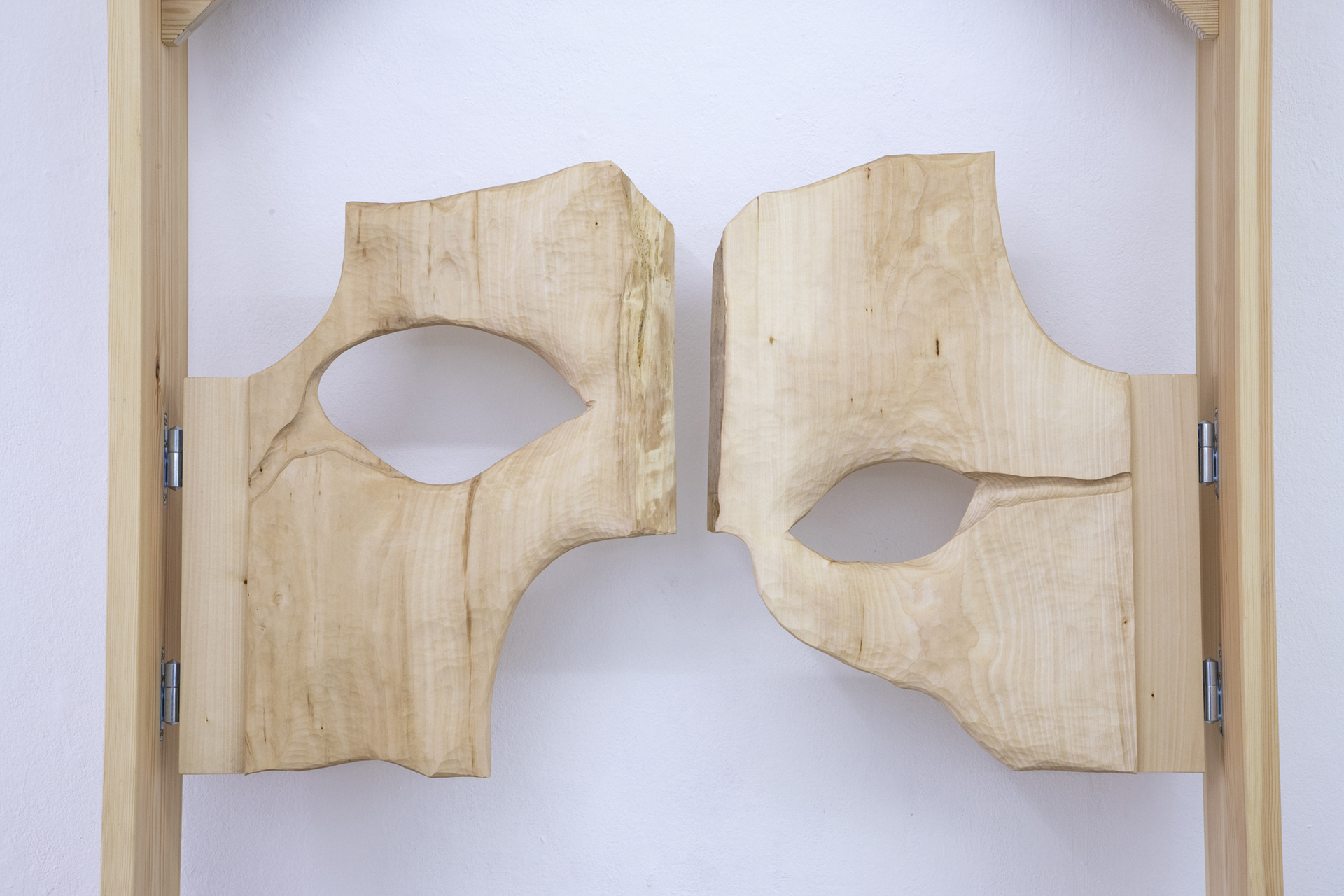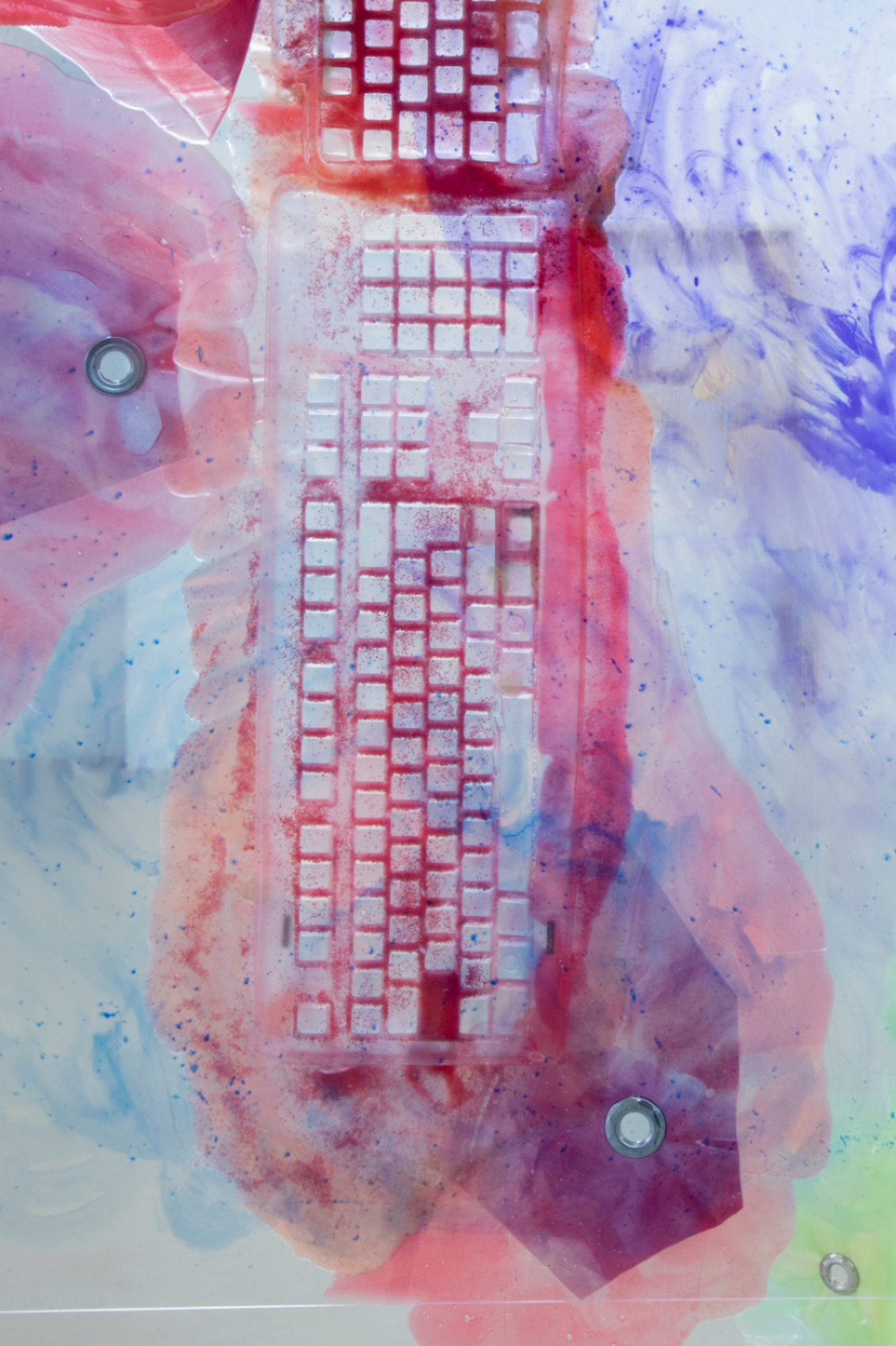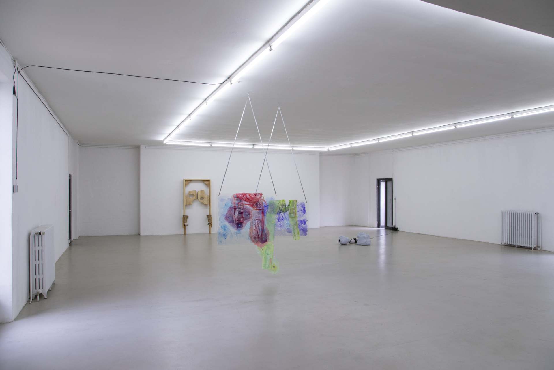 Am Ende des Raums, schräg gegenüber von den beiden Schaufensterpuppen lehnt Nicl Barbros Skulptur „swing-high“ an der Wand. Sie sieht aus wie eine Saloontür: zwei Schwingblätter, die nur einen Teil der Öffnung verdecken. Diese Türblätter sind geschnitzt und blicken in den Raum wie zwei Augen. Der Türrahmen, in dem sie hängen, ist eigentlich ein verbundenes Stelzenpaar. Die Holzpantoletten und die papiernen Beinstulpen suggerieren ihre Benutzung und eine genau fest-gelegte menschliche Präsenz, nutzbar sind sie aber natürlich nicht, schon deshalb, weil sie in der Doppel-funktion als Türrahmen statisch sind. Auch die Saloontür öffnet sich nicht, in beiden liegt eher die Potenz einer Dynamik, die ins Ungewisse führt und auf Widerstände trifft: auf Material, auf Wände, auf Ängste. Diese ambivalente Latenz ist auch Teil von Gesa Trochs „Hold On - Let Go (Ambivalent Feelings)“. Die Silikonabformungen von Computer-tastaturen, die über zwei Plexischeiben drapiert sind, legen nahe, diese als Screens zu verstehen. Sie sind mit Glasfarbe blurry und in repetitiven Schleifen bemalt. Informationen, sind hier keine zu finden, eher auf Hanne Darboven und Andere verweisende Referenzen, die wiederholende Bürotätigkeiten von Frauen in den 1960er und 70er Jahren in ihren Arbeiten aufgegriffen haben. Konkrete Spuren