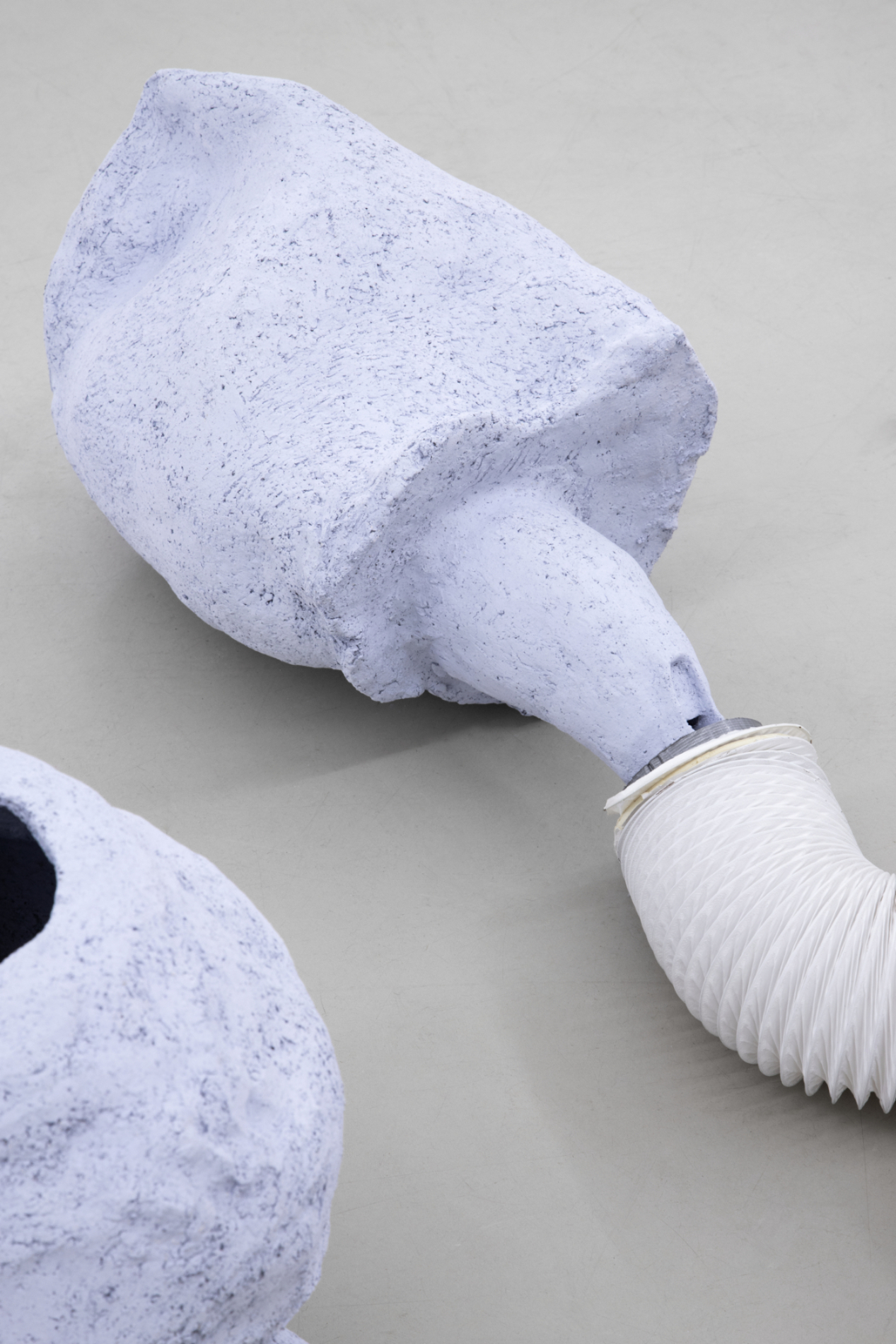 Die „Jet / Lag“ betitelten Schaufensterpuppen von Saskia Senge tragen Schlafmasken und das, was Saskia horizontale Kleidung nennt. Um die Hälse liegen Nackenhörnchen, damit es sich auch im Vertikalen ohne Nackenstarre schlafen lässt. Ihre Beinhaltung ist eigentlich auf Bewegung aus-gelegt. Schaufensterpuppen repräsentieren in der Regel stillgestellte Belebtheit, die hier durch Keile, Türstopper und die fragile Standsituation in eine unsichere Stasis gerückt wird. Die beiden Puppen sind anwesend und abwesend zugleich. Ihrer Umgebung durch die Schlafmasken entrückt sind es vor allen Dingen die Accessoires, die sie zu Protagonistinnen werden lassen. „Jet / Lag“ verweist auf Eingriffe in die inneren Rhythmen des Körpers und verschobene Zeitlichkeiten - durch Energy Drinks und durch das Warten auf Ankunft an einem anderen Ort, um aus der Distanz oder aus dem Vergessen eine neue Nähe im Erinnern zu finden, wie Blanchot beschreibt. Noch aber stehen die Zeichen auf Schlaf. Obwohl die Skulptur „Ventilation“ von Angela Anzi erneut zu pfeifen beginnt. Zwei keramische Körper erzählen von einer rhythmisch wiederkeh-renden Potenz. Ist es oft Anzis eigener Körper, der ihre Objekte aktiviert, ist es hier gerade der automatisierte Prozess und das unerwartete los Tönen, in dem sie sich realisiert. Die Objekte liegen im Raum wie Steine. Der Schlauch und seine pulsierenden Bewegungen steht im vermeintlichen Widerspruch zu ihrer Statik. Das eine Objekt regelmäßig tönend, das andere still und wartend.