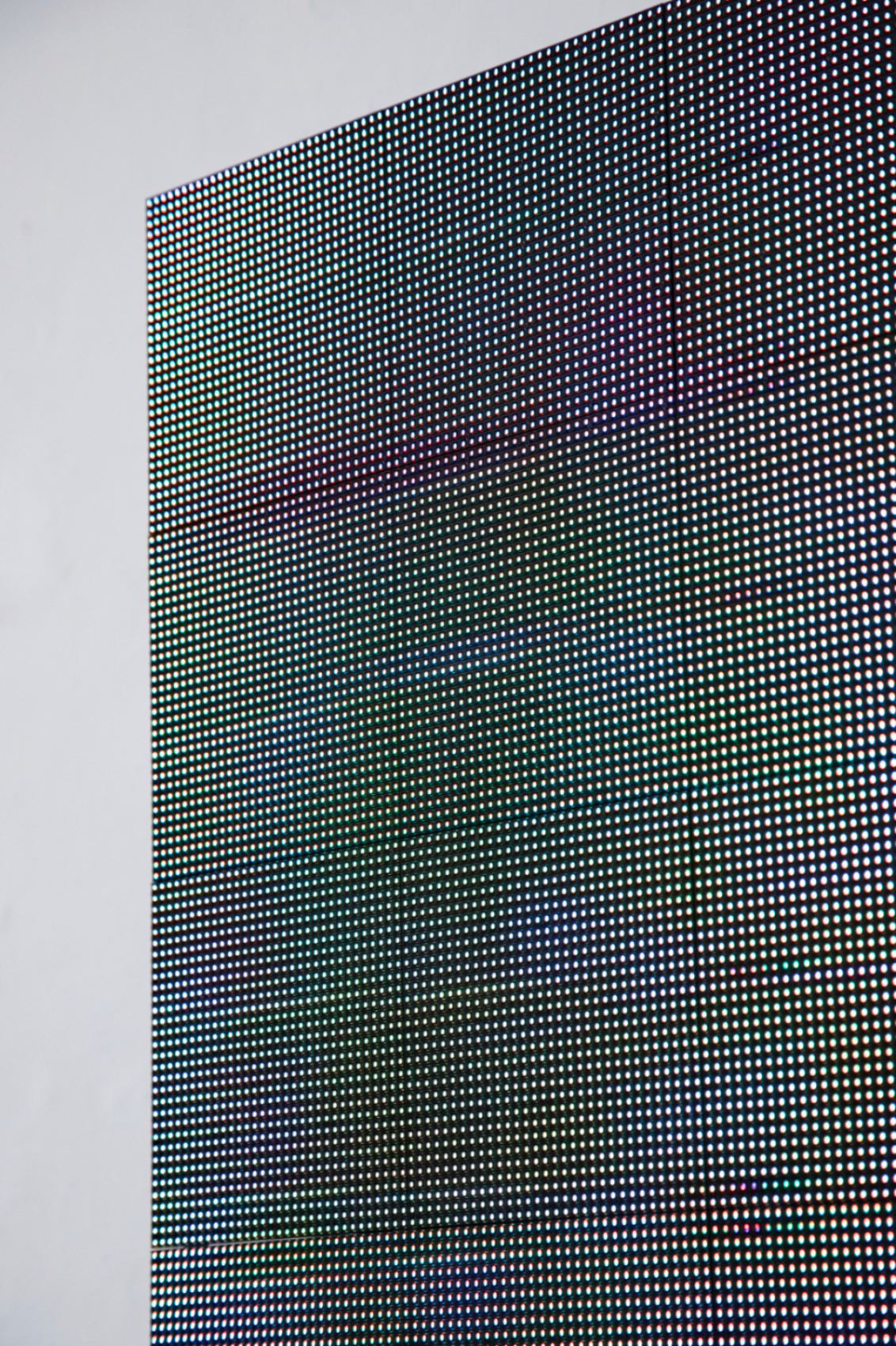 von Zeichen finden sich nur auf den Tastaturabformungen, die Gesa Troch als potentielle Endlos-schlange ebenfalls aneinander gereiht hat. Einerseits weil diese klar als Gegenstand zu erkennen sind, andererseits aber auch, weil sich Buchstaben, Zahlen etc. auf einigen zumindest deutlich zeigen. Im Verlauf der Abformungsarbeit aber sind sie nach und nach unsichtbar geworden und die Tastaturen um ihr kommunikatives Beziehungspotential entleert. Die Plexiscreens hängen statisch an Metallbändern von der Decke. Das wirkt auch vielleicht deshalb so eindrücklich, weil die Silikontastaturen so erschlafft sind. Das Gewicht des Silikons und implizit das Gewicht von Arbeit, digitaler Kommunikation, Isolation und Körpernegation drücken einen Screen in Schieflage.