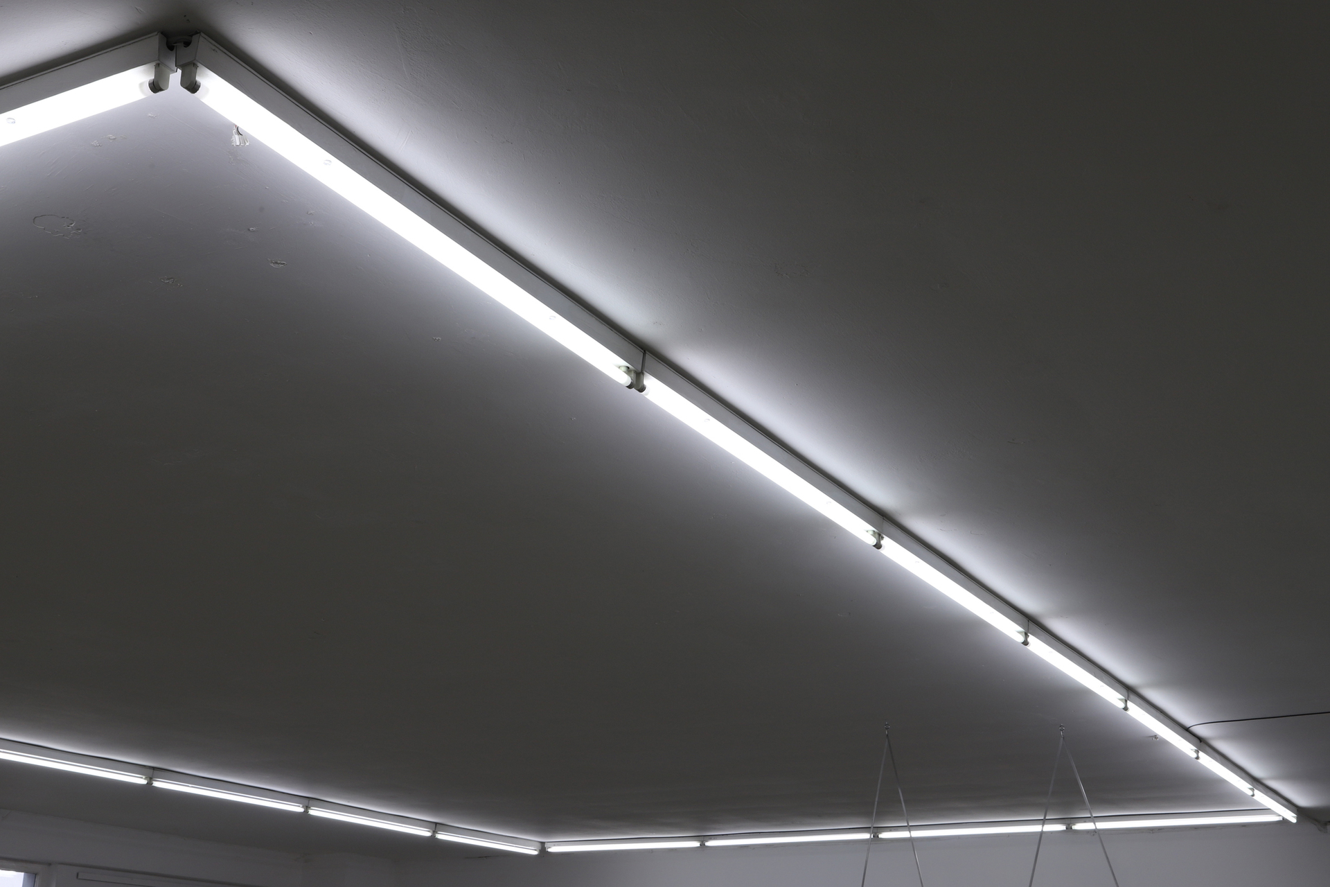 sie ein Buch von Maurice Blanchot mit dem Titel „Warten / Vergessen“. Rechts daneben flackern Farbfelder über LED-Panels. Geht man an ihnen vorbei, ist kaum etwas Konkretes zu erkennen. Die Hauptinformation der Videoarbeit von Torben Wessel mit dem Titel „hneba“ ist zunächst, dass etwas geschieht bzw. in Bewegung ist, sich Einzelteile zu etwas zusammenzufinden versuchen. Dann beginnt Angela Anzis Keramik zu flöten. Laut, rhythmisch. Elektronisch gesteuert spielt der angeschlossene Lüfter alle 8 Minuten verlässlich die immer gleichen Töne. Dazwischen klackert die Schaltung des Lüfters wie ein Herzschlag, durch das Flexrohr wird Luft gepumpt und es be-wegt sich im selben Rhythmus, technisch und organisch zugleich. Wobei organisch hier auch an das Menschen-Innere denken lässt. Weder Soundtrack noch Magenknurren sind jetzt zu hören. Dann wird es wieder still und die anderen Geräusche werden wieder hörbar. Der andere Rhythmus der Ausstellung ist der Wechsel zwischen hell und dunkel. Die Arbeit „Latency“ ist eine Kooperation zwischen Saskia Senge und Stefan Hübner. Wenn ein Flugzeug auf der benach-barten Startbahn abhebt, spätestens aber alle 10 Minuten, wird das Licht hochgefahren. Danach wird es über einen Zeitraum von sieben Minuten wieder mehr oder weniger kontinuierlich abge-dimmt. Der Moment der Helligkeit ist plötzlich. Das Dimmen ist weniger abrupt. Eine Zeit lang fällt das Rückfallen in den Dämmerzustand kaum auf, dann wird es wieder merklich evident. Latency ist die Zeit, die zwischen einem Ereignis und einer Reaktion eintritt. Ich bin versucht hier weniger die Reaktionszeit des Lichts als meine eigene gemeint zu sehen. Das Licht wird aufgeweckt, ich aber auch. Meine Betrachtungsrhythmen und meine Aufmerksamkeit wandeln sich.