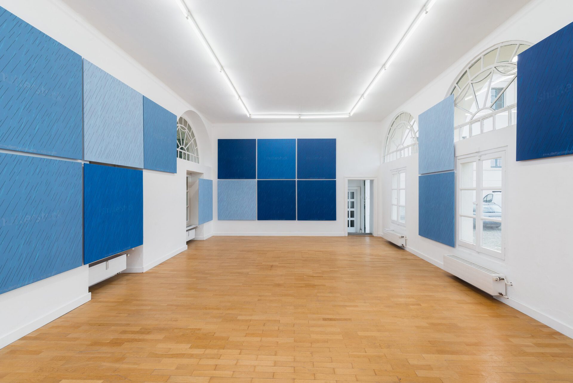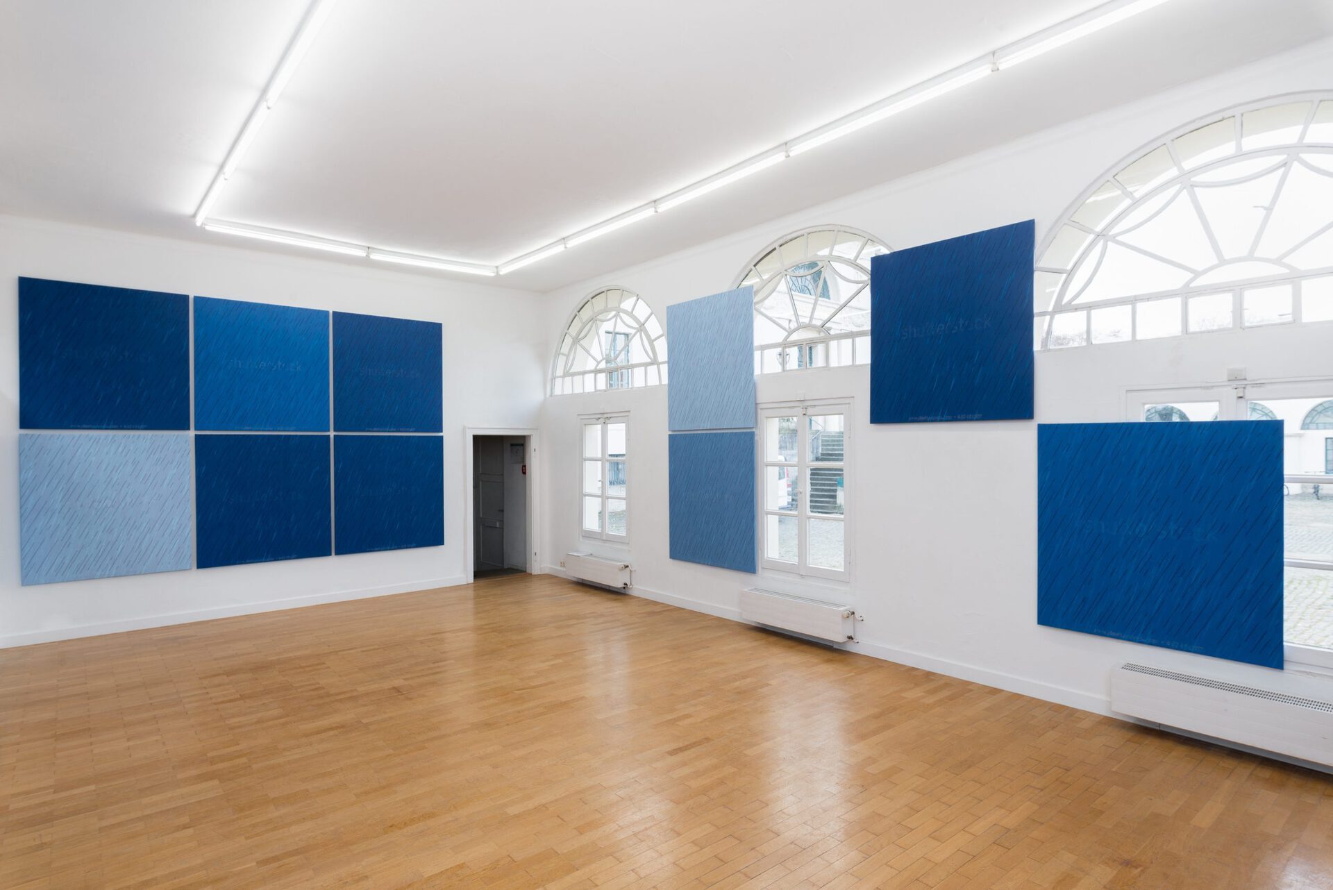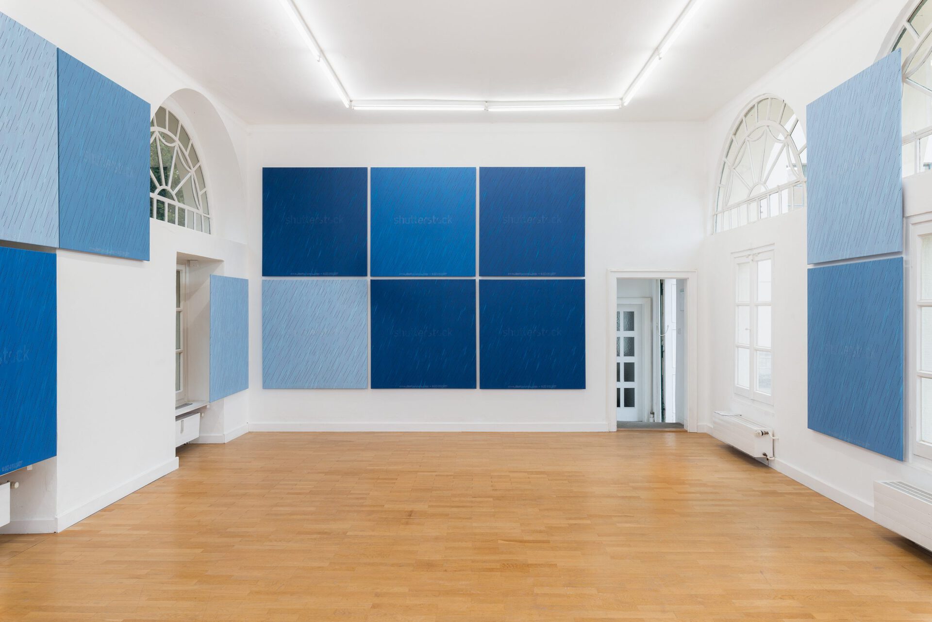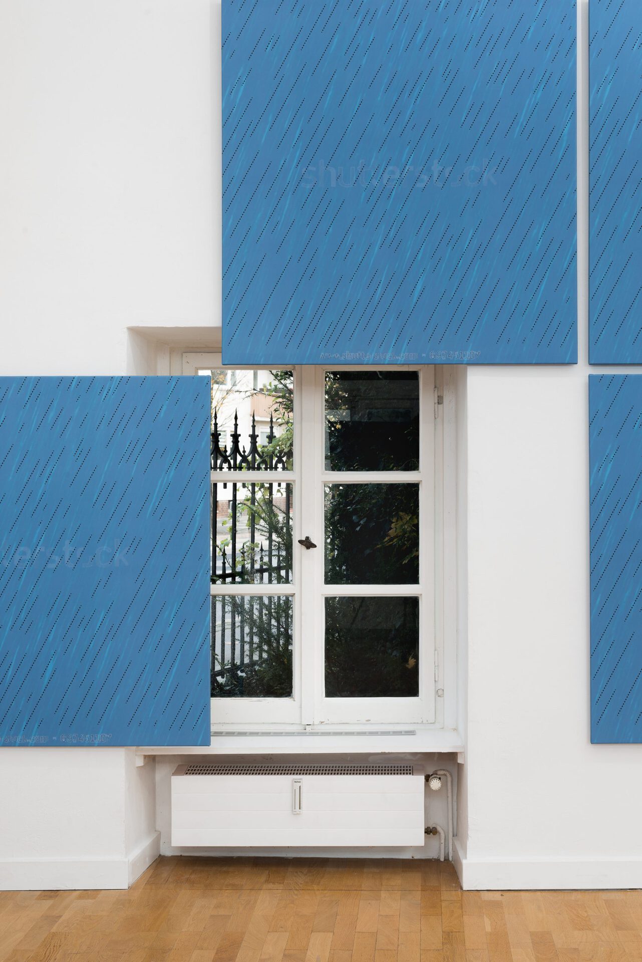 Tal‘s The Cascades consists of a series of digital prints on canvas effectively ‘cladding’ the inside of the Remise in an irregular chequer-board pattern. Titled Windows (Rainscreen Wash), they feature a repeated motif simulating rain and drawn in the style of stock image graphics. Rendered in shades of blue and featuring a literally washed out ‘Shutterstock’ watermark, the pictures pertain to the appearance of new builds as seen from the ground, and the perceived effects of light, water and shadow on glass – an effect itself referenced by the aluminium cladding styles of numerous contemporary facades. As such the hang unfolds in disregard to the space’s features, the pictures gliding over and in front of them instead. That this layering effect also recalls a series of browser windows left open, and their suspension at the front of a screen, returns the work in part to the digital space where it, or indeed building facades, might be dreamt up. It asks how simulated images, and their relationship to the generic, exert an influence on both the material construction and subjective experience of the analogue world, and vice versa, and which takes primacy.