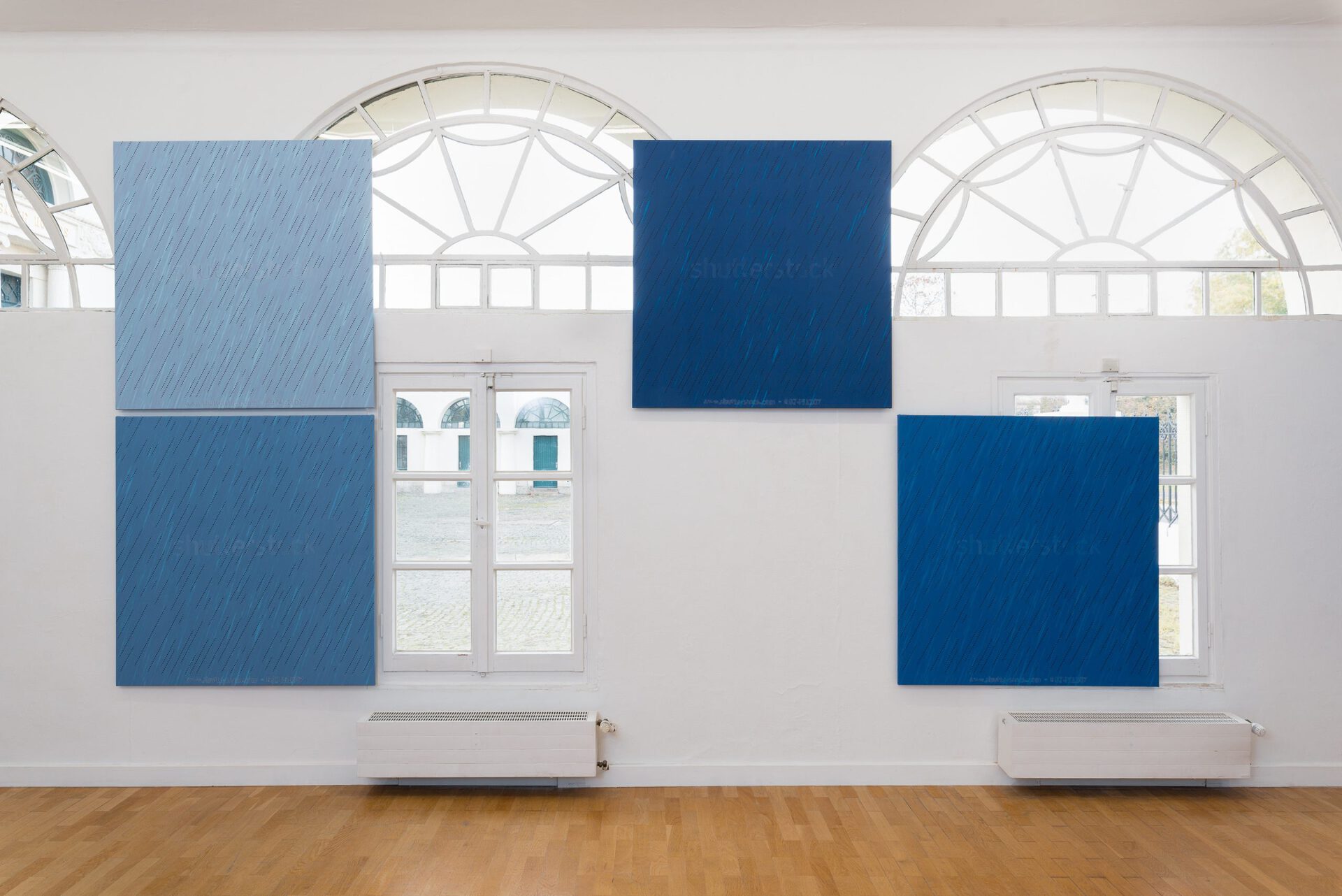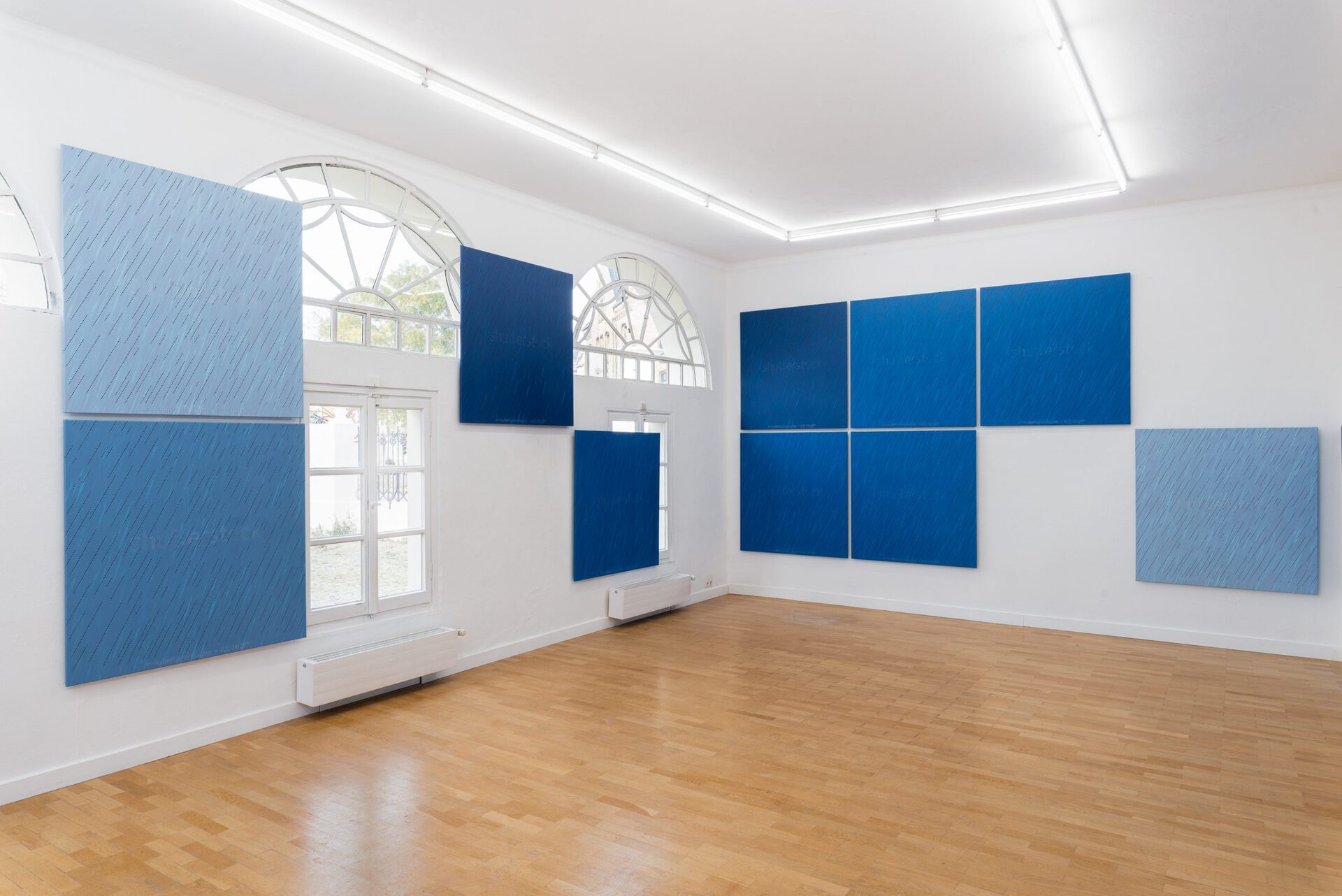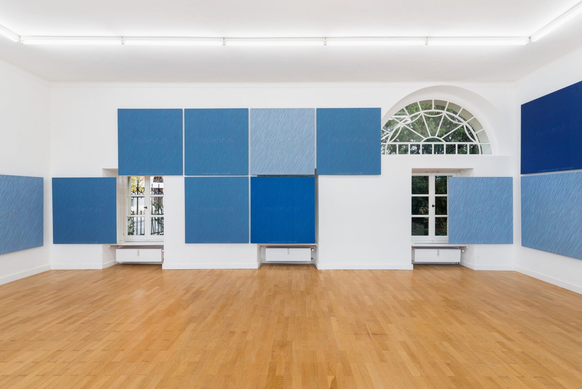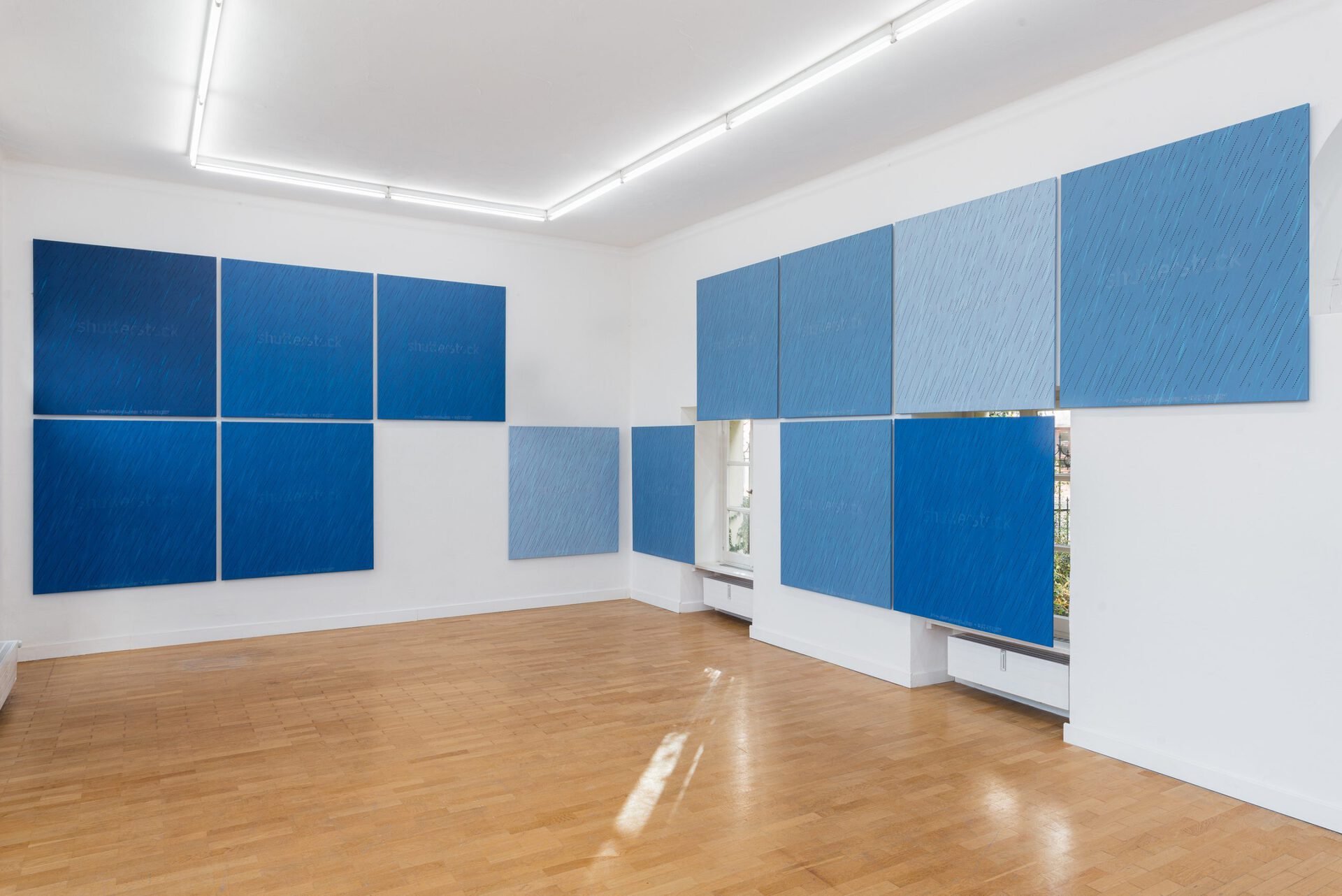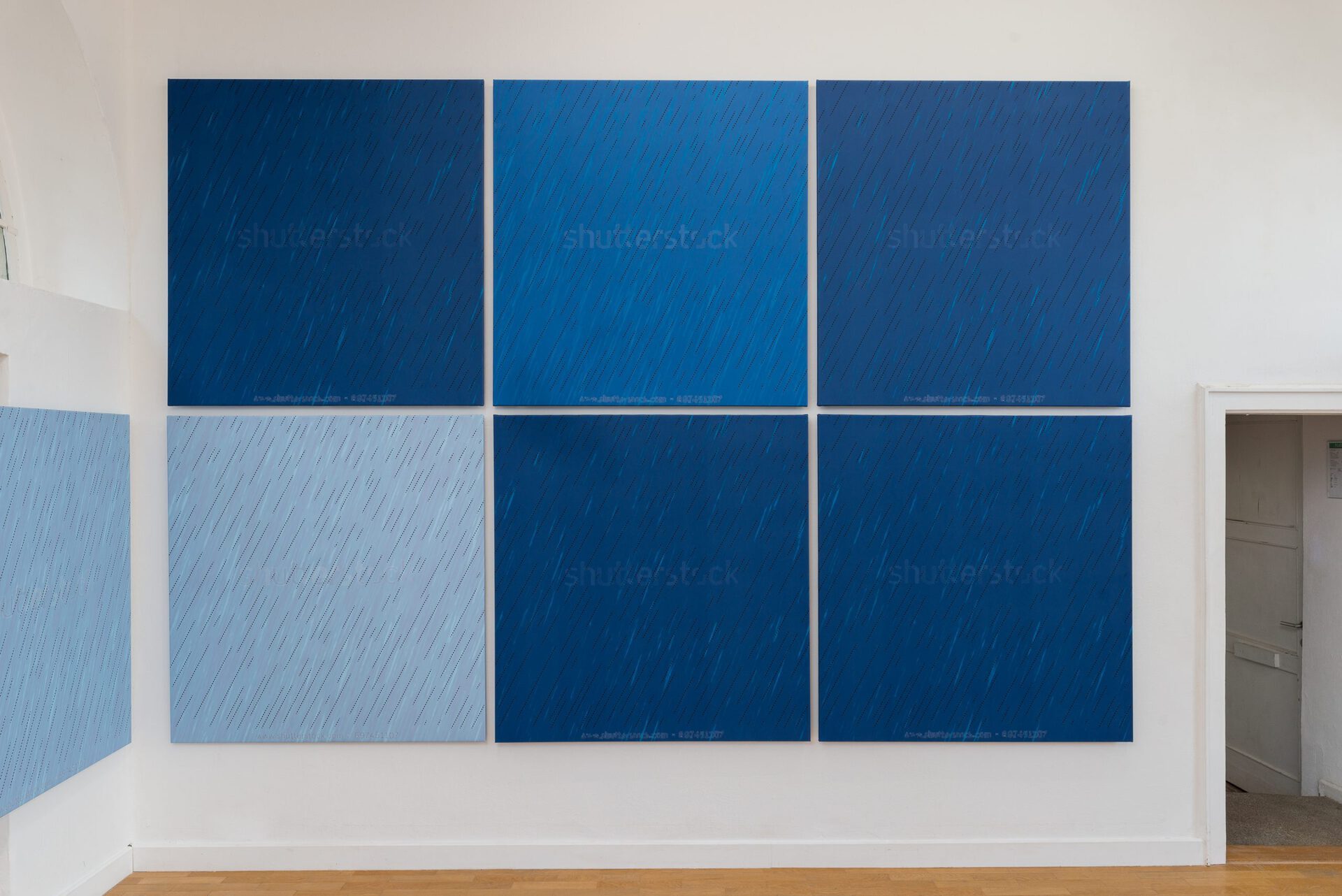 Tal‘s The Cascades consists of a series of digital prints on canvas effectively ‘cladding’ the inside of the Remise in an irregular chequer-board pattern. Titled Windows (Rainscreen Wash), they feature a repeated motif simulating rain and drawn in the style of stock image graphics. Rendered in shades of blue and featuring a literally washed out ‘Shutterstock’ watermark, the pictures pertain to the appearance of new builds as seen from the ground, and the perceived effects of light, water and shadow on glass – an effect itself referenced by the aluminium cladding styles of numerous contemporary facades. As such the hang unfolds in disregard to the space’s features, the pictures gliding over and in front of them instead. That this layering effect also recalls a series of browser windows left open, and their suspension at the front of a screen, returns the work in part to the digital space where it, or indeed building facades, might be dreamt up. It asks how simulated images, and their relationship to the generic, exert an influence on both the material construction and subjective experience of the analogue world, and vice versa, and which takes primacy.