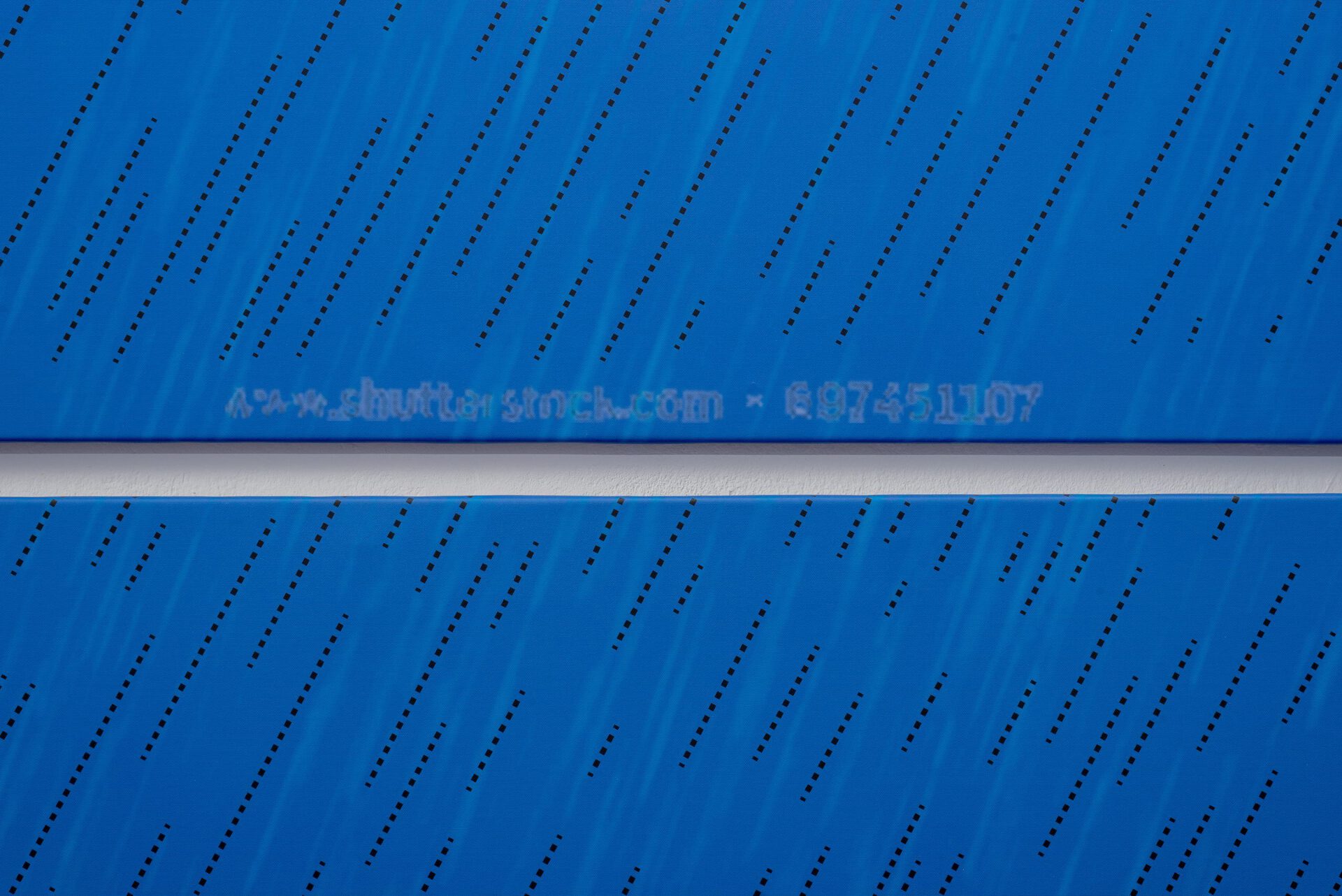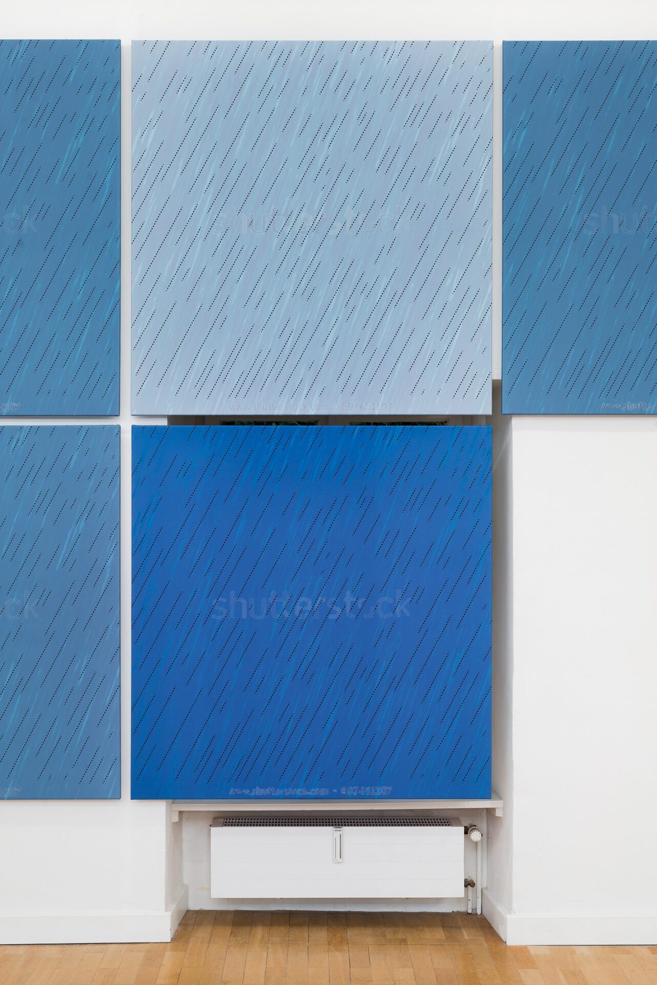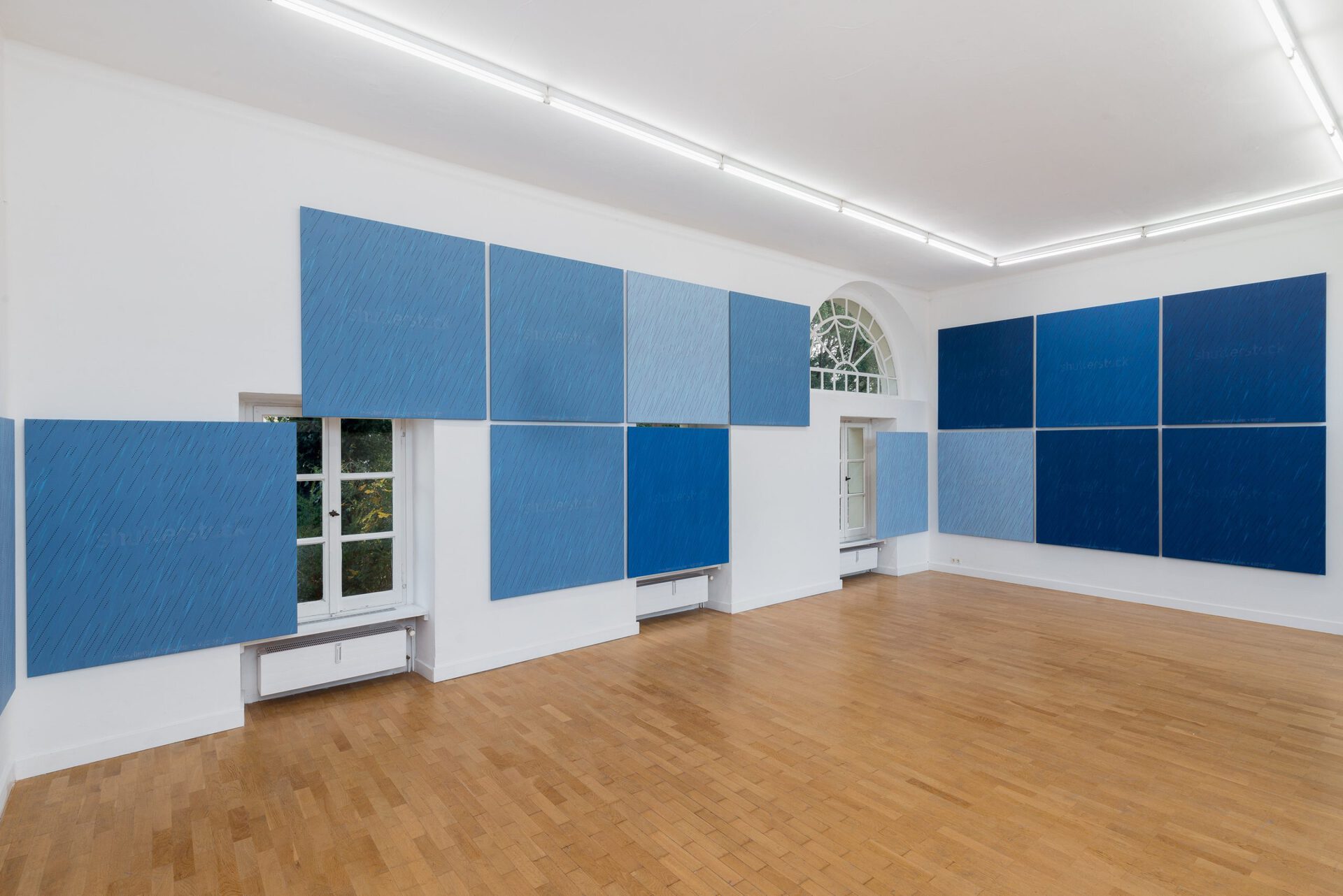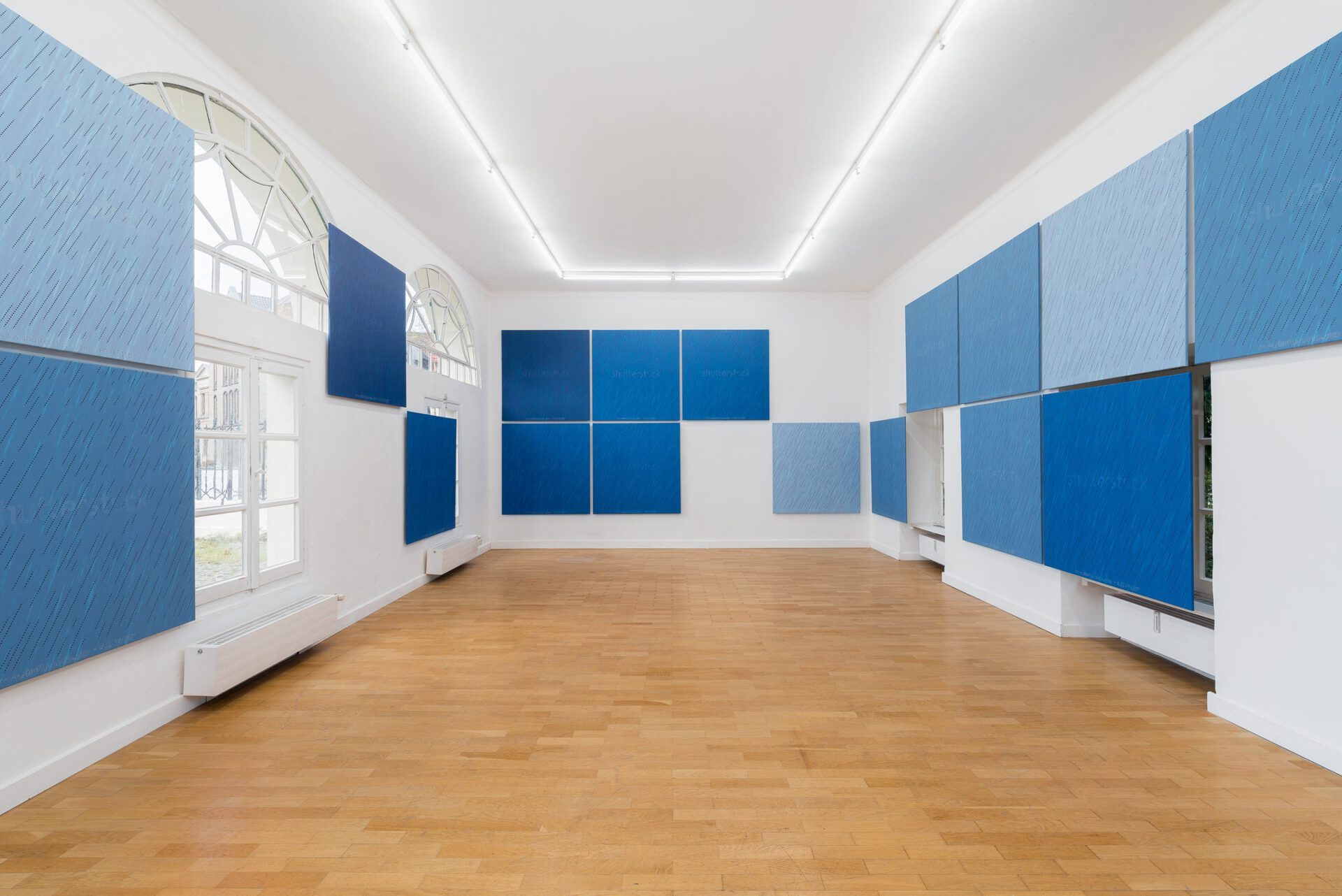 Tal‘s The Cascades consists of a series of digital prints on canvas effectively ‘cladding’ the inside of the Remise in an irregular chequer-board pattern. Titled Windows (Rainscreen Wash), they feature a repeated motif simulating rain and drawn in the style of stock image graphics. Rendered in shades of blue and featuring a literally washed out ‘Shutterstock’ watermark, the pictures pertain to the appearance of new builds as seen from the ground, and the perceived effects of light, water and shadow on glass – an effect itself referenced by the aluminium cladding styles of numerous contemporary facades. As such the hang unfolds in disregard to the space’s features, the pictures gliding over and in front of them instead. That this layering effect also recalls a series of browser windows left open, and their suspension at the front of a screen, returns the work in part to the digital space where it, or indeed building facades, might be dreamt up. It asks how simulated images, and their relationship to the generic, exert an influence on both the material construction and subjective experience of the analogue world, and vice versa, and which takes primacy.