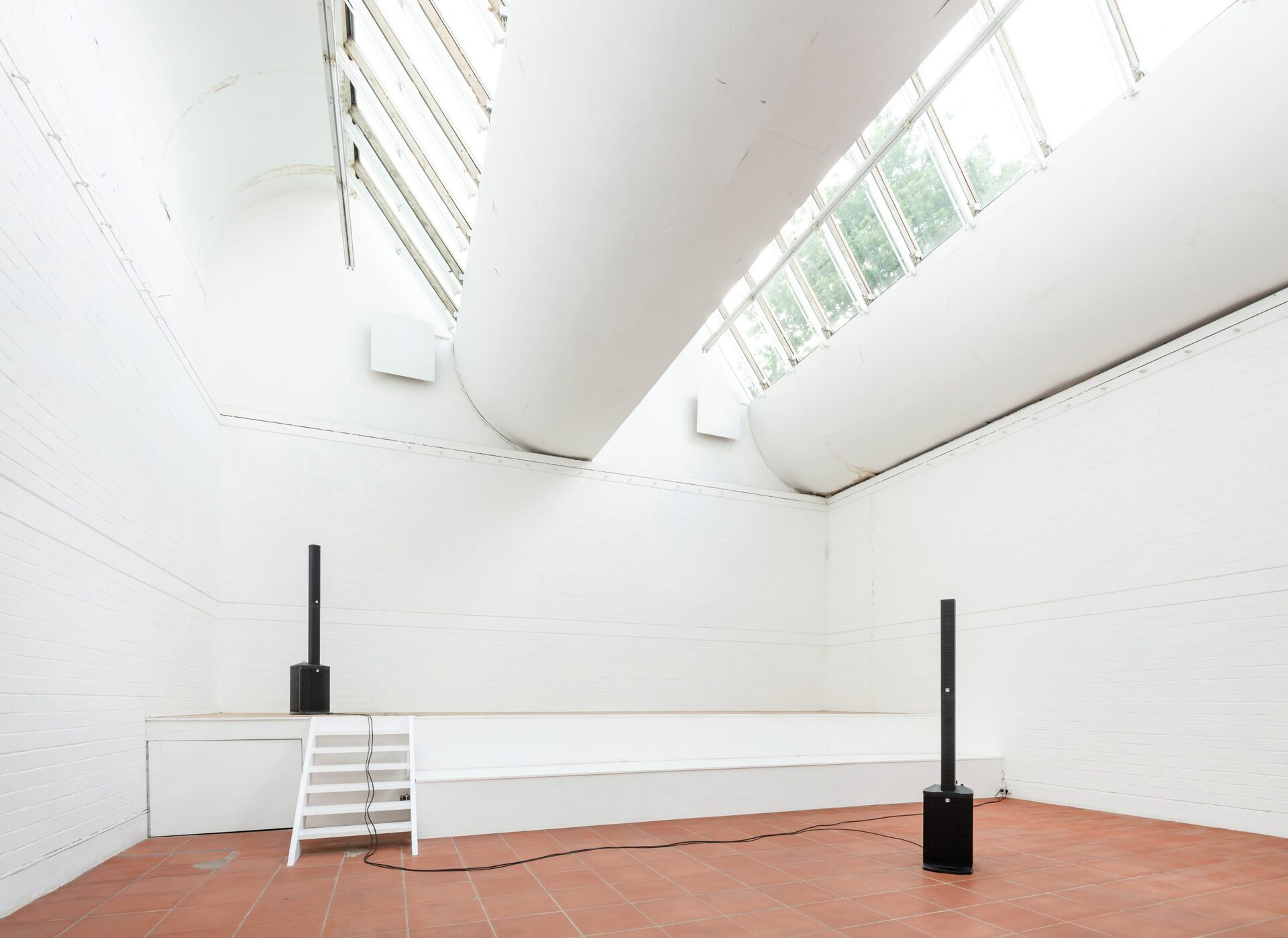 Gleichzeitigkeiten refers to the respective other location, since it is never possible for the recipients to perceive the entire work in both buildings at the same time. As viewers of the microphones, visitors to the museum inevitably contribute to the sound transmission through their acoustic presence in the space. Or they become observers of an acoustic space within a space when they hear the sound of the Museum Ludwig in the Simultanhalle. Since the Simultanhalle is in disrepair and currently closed, the singing on the loudspeakers enlivens the interior of the Simultanhalle, while for the visitors it is transported to the outside via the thin walls as a membrane, thus picking up on the simultaneous but opposing development of both places.