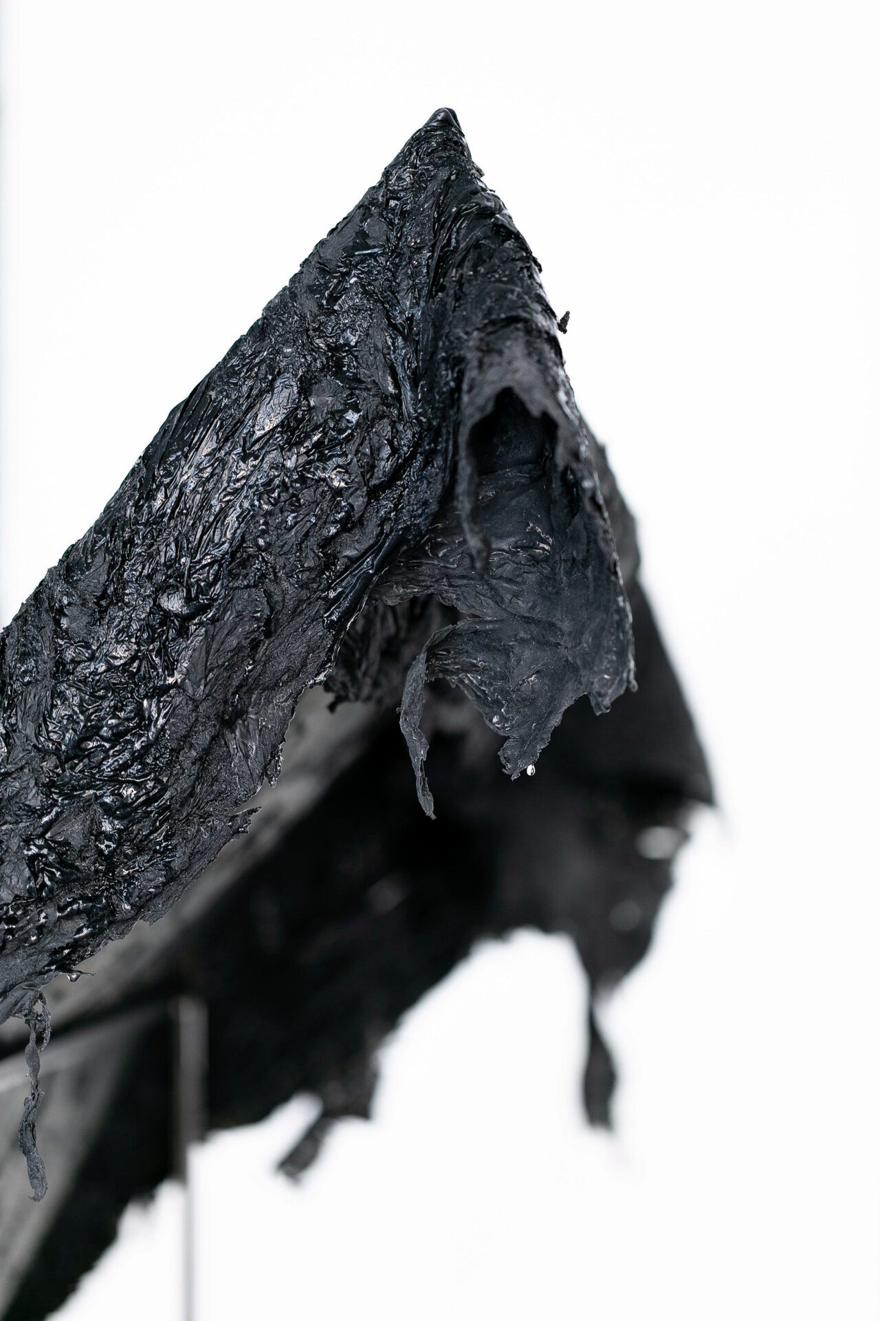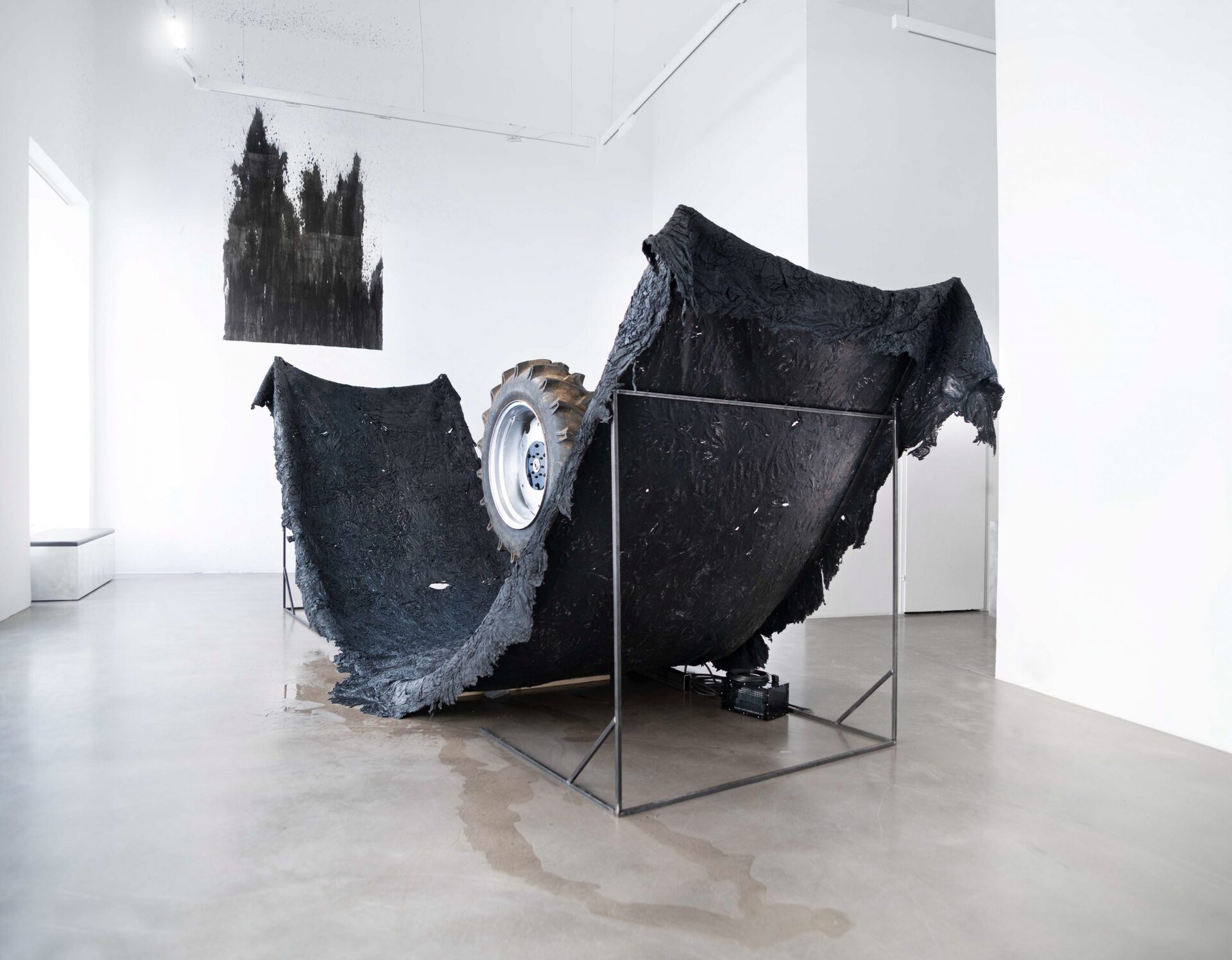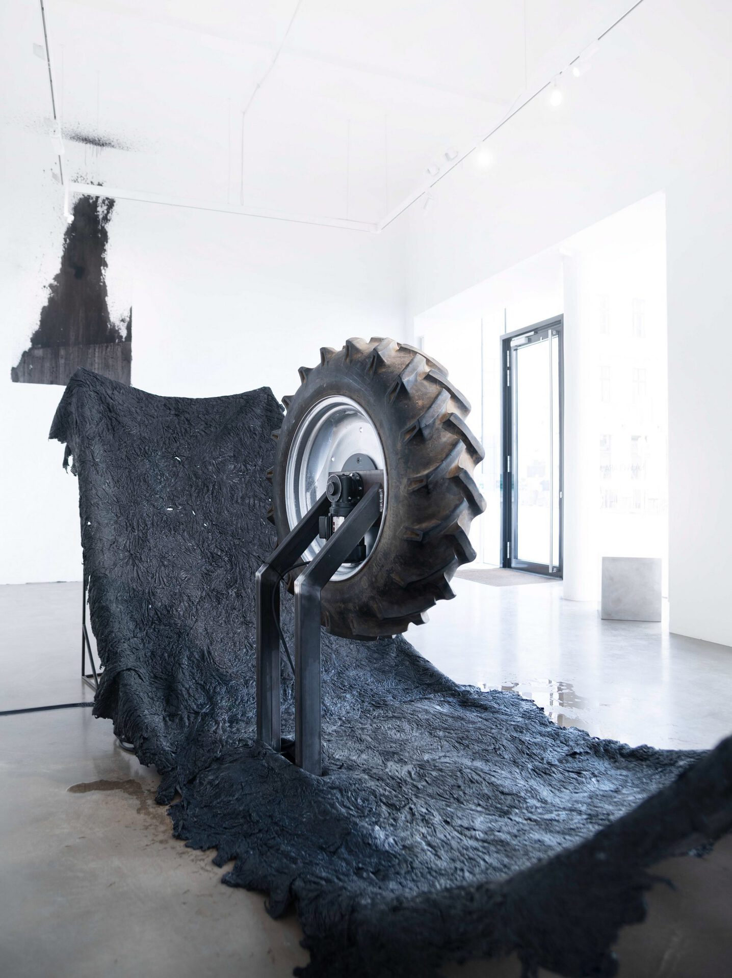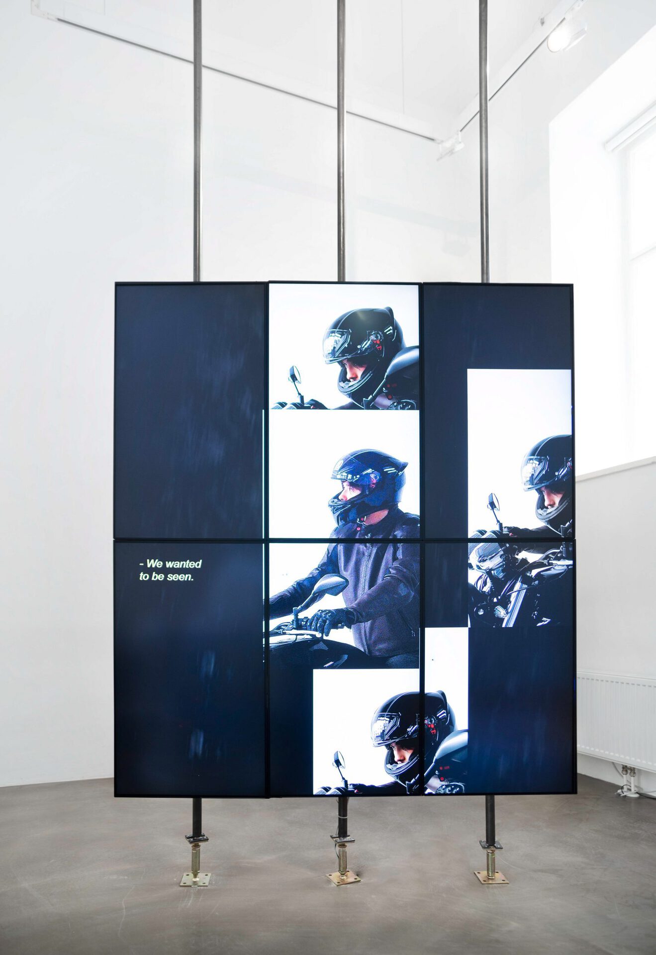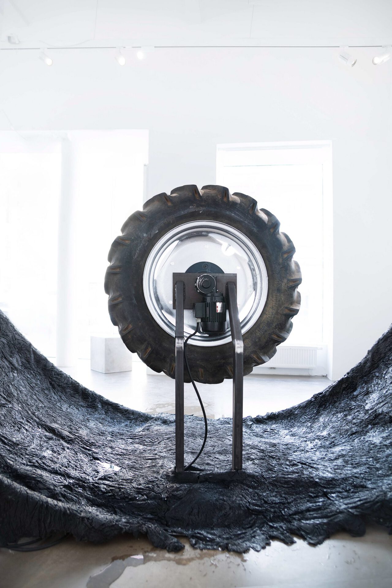The exhibition was created in close artistic and technical collaboration with Christoph Freidhöfer from Kunst- und Räderwerk. The objects in the show deliberately stage organic and collapsing latex, massive, industrial-looking steel constructions, kinetic engines and a seemingly never-ending journey into the pictorial unknown. Fast-paced film cuts that pass by the viewer and scenes of a falling twilight throw the observer back onto himself: in the dark one listens to the jokes and anecdotes of a young motorcyclist.