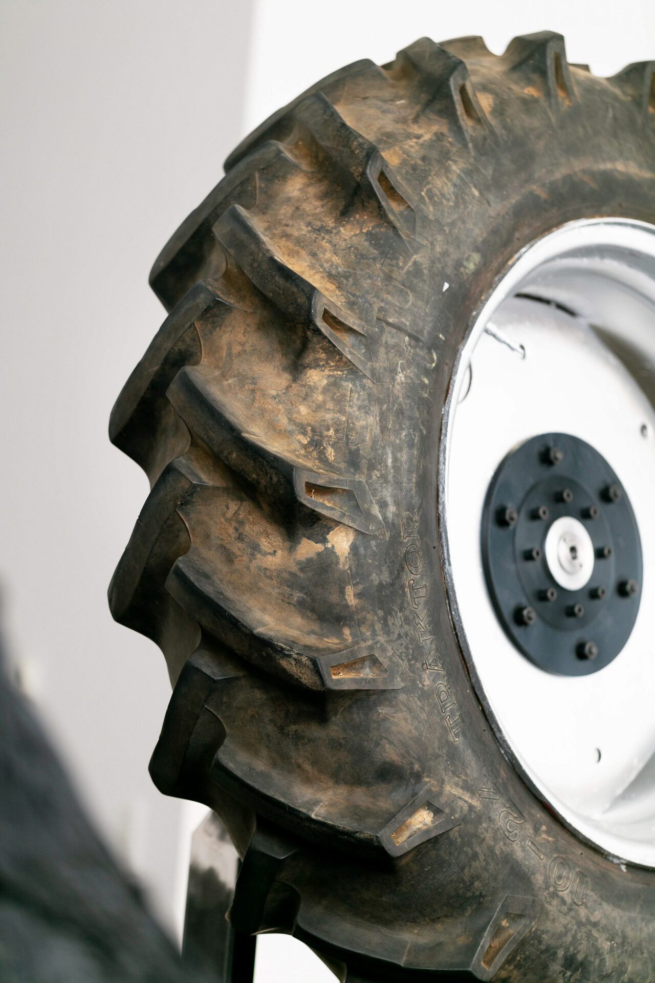 In the exhibition GONZO by the Austrian-Korean artist Kaja Clara Joo at Bildraum 07 the fear of one's own death, anthropomorphic handlings of machines and a longing for a lethal risk are mixed up. At the center of this narrative is the fictional character Gonzo who has a phobia of vertical lines since his birth. He has dedicated his life to his motorcycle since then as it symbolizes the utopia of a horizontal ideology: nothing compares to that elicited feeling of absolute autonomy and self- determination as one speeds towards the horizon in a state of hypnotizing acceleration. When Gonzo is involved in an accident one day his entire worldview is being shaken up. The show attempts to materialize those very fragments from Gonzo's life in a narrative choreography: his vehicle that was injured in the accident, a tire flying away, which in its exaggerated perception blows up to a monumental size. Fragments of autobiographical moments, which accumulate into a dense and confusing compound of sequences racing by the viewer. Explorations of constructed virile archetypes. A desire for lethal danger and the role of the gazing audience as an omnipresent being.