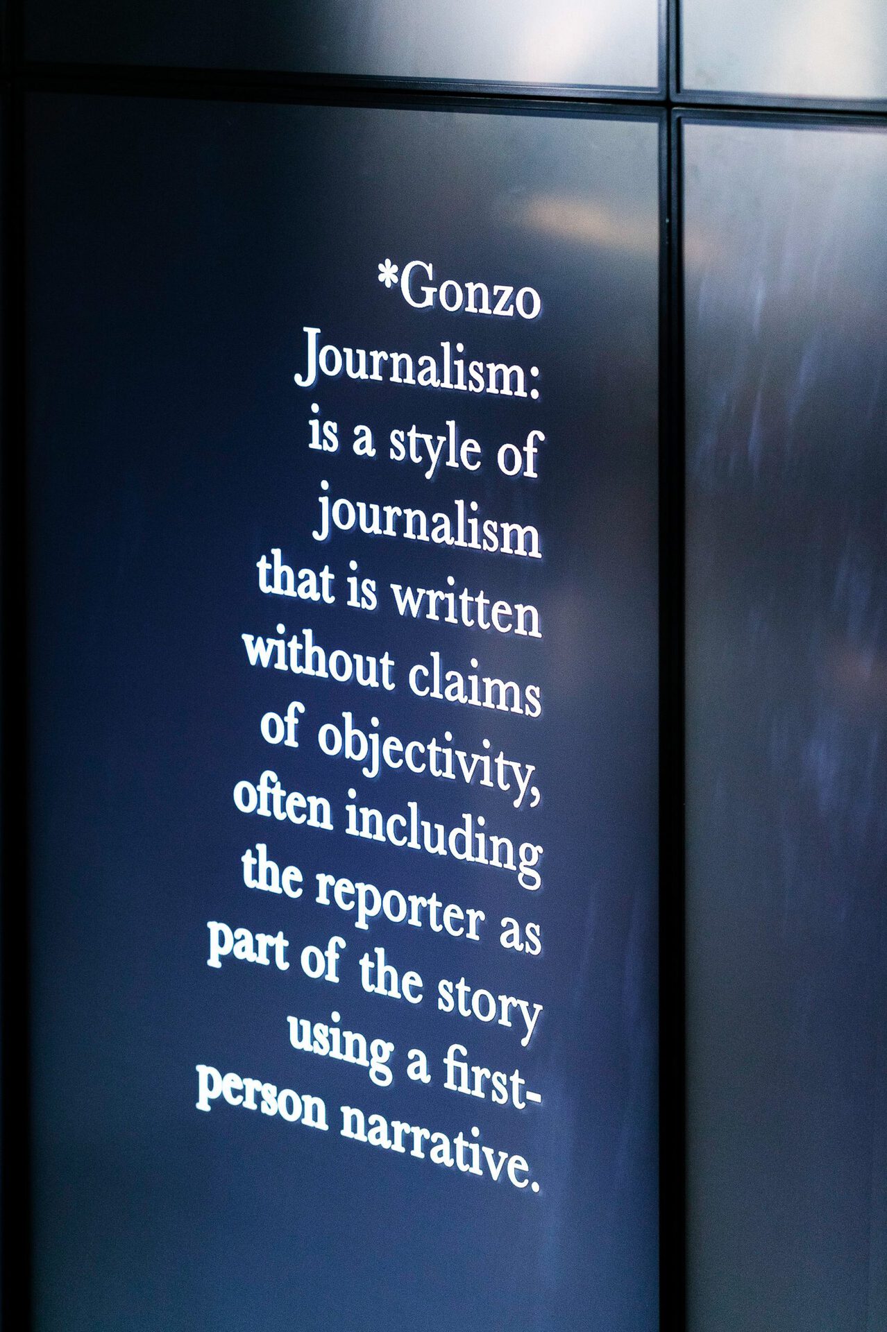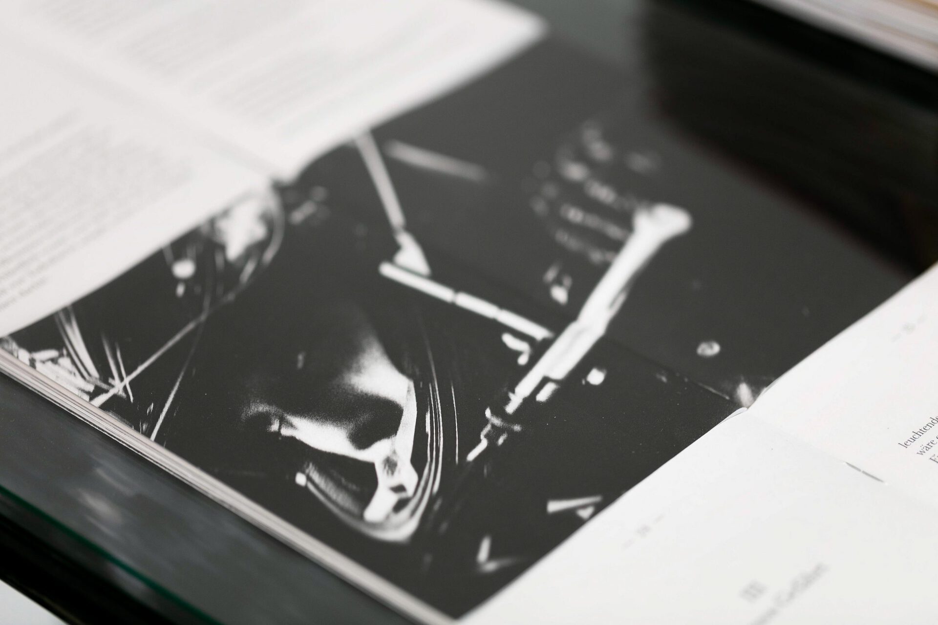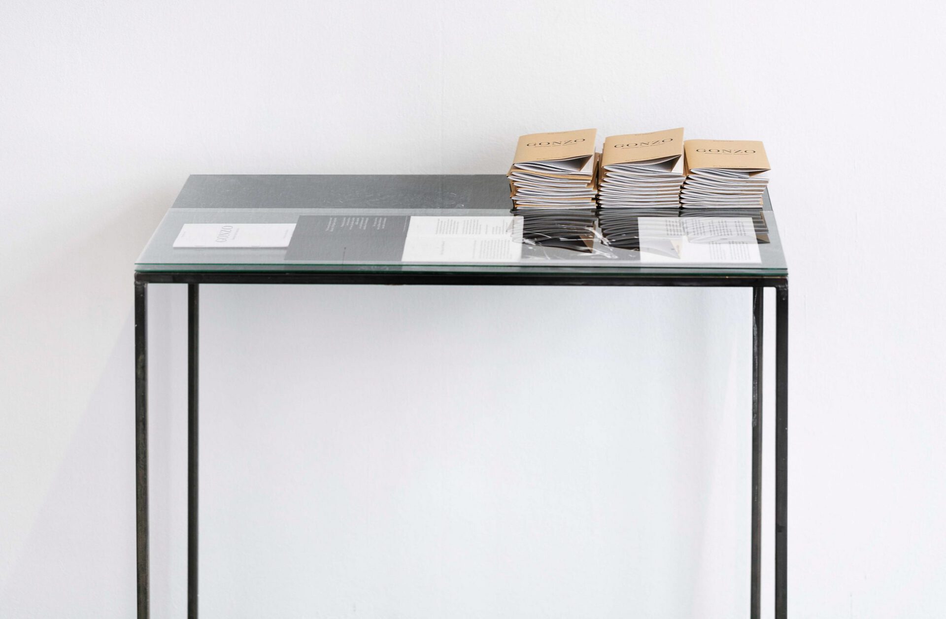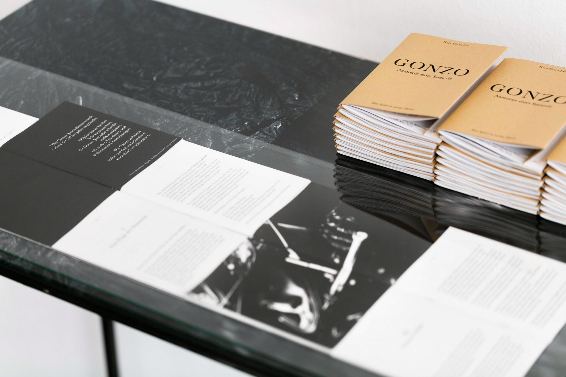 Next to it is the artist book GONZO (Anatomie einer Szenerie) on a steel table. Within six chapters we dive into pivotal moments of Gonzos life: from the lack of affection from his mother who dropped Gonzo on the floor when he was born, his overly sexual relationship with his Honda CBF bike and the few last seconds before his body seperates from his motorcycle as he stumbles into an open, fiery and gooey crack in the pavement that leads to an accident.