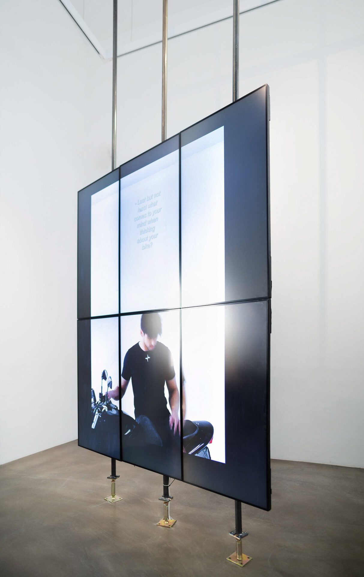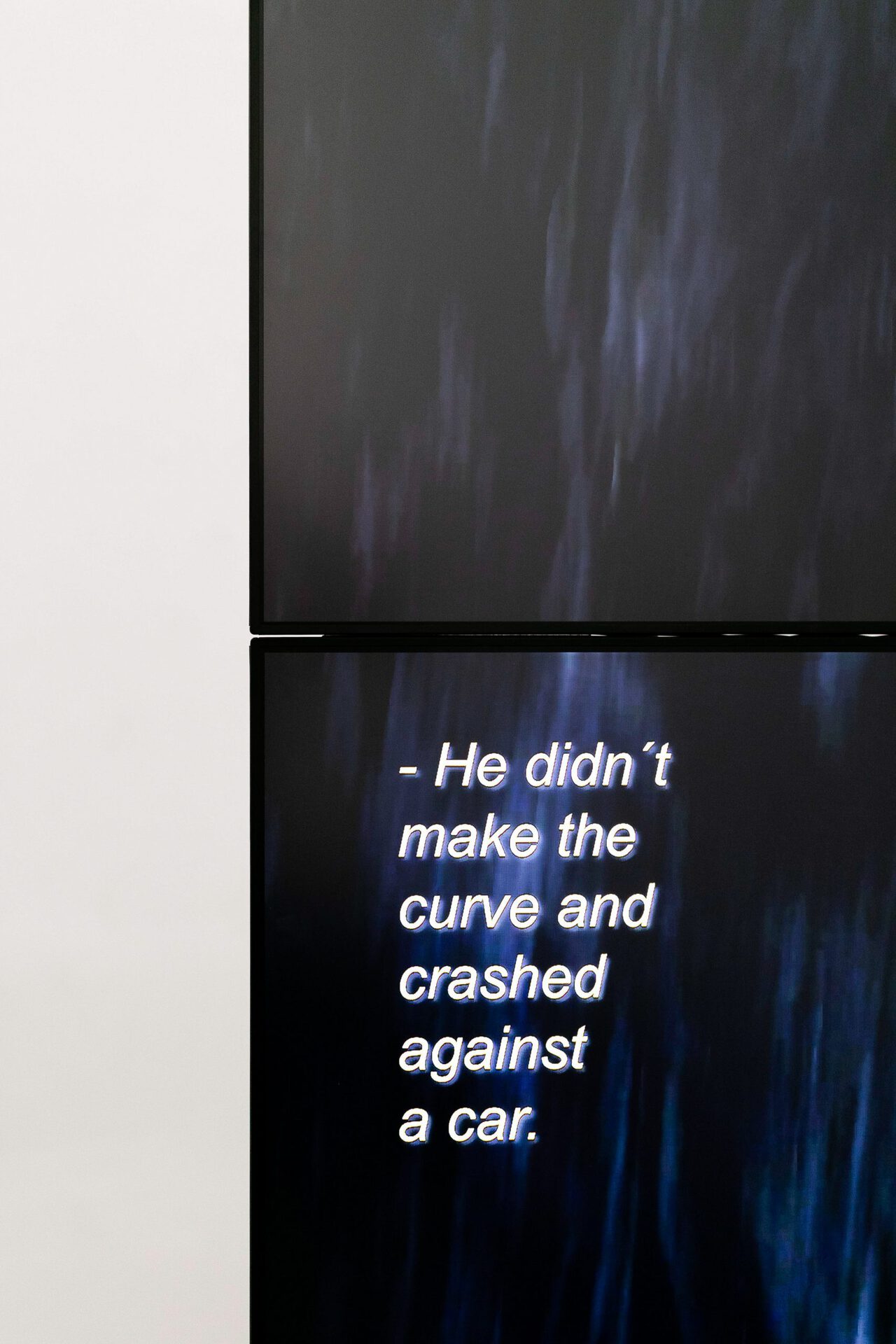 The short documentary ULTRAFRICTION (Wahre Halunken) tells the story of the artist´s brother on a 6- channel video- sculpture that is installed on three massive metal poles. As he jokes about his love for fast cars and motorcycles one starts to wonder whether the interview was authentic and if this person is a copy of the exhibition protagonist. Multiple images and sounds play on simultaneously whilst the viewer gets sucked into a neverending camera- ride through a dark, black pit.