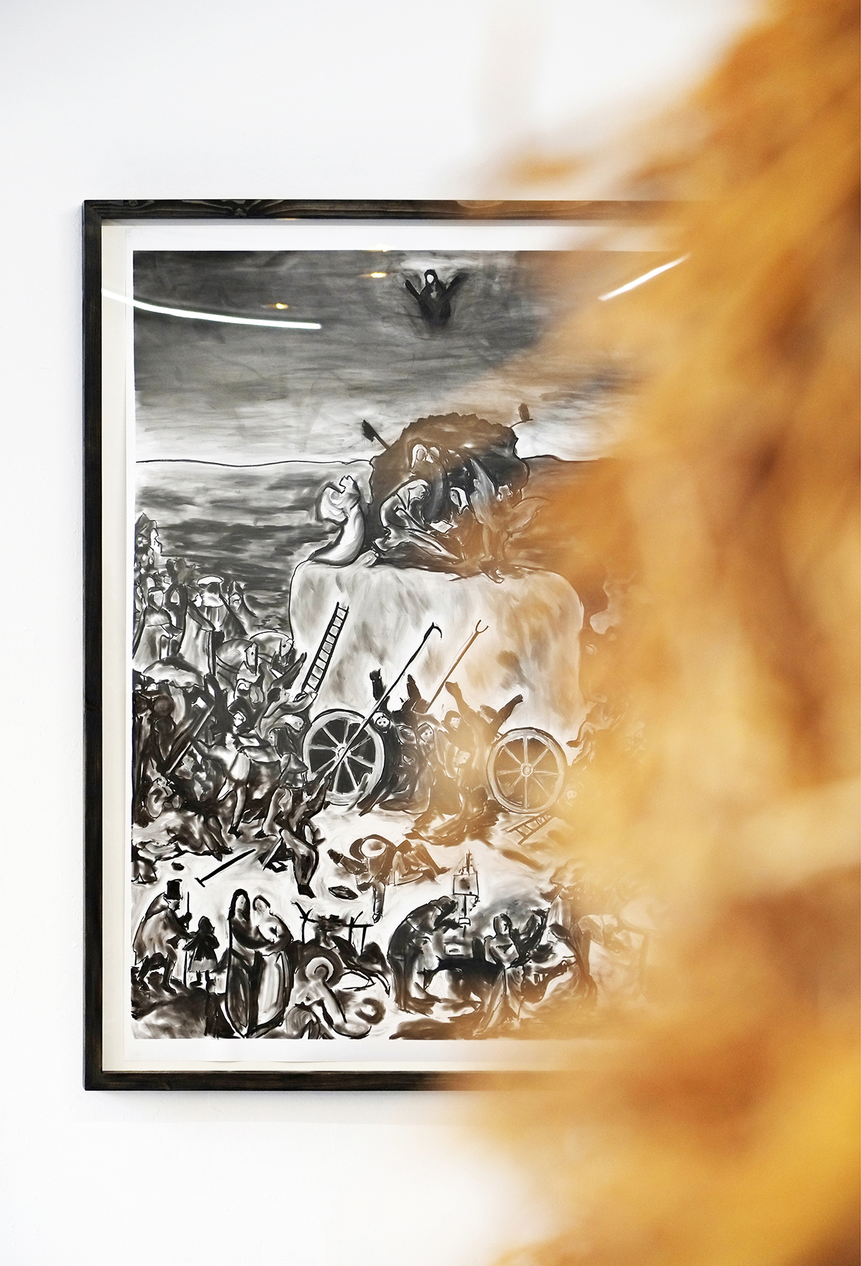 Conrad Hübbe presents a charcoal drawing „The Haywain (after Hieronymus Bosch)“ after the art historically well-known Haywain Triptych (1516) by Hieronymus Bosch. In his charcoal drawing, he continues to be interested in processes of alienation and abstraction when actualizing the hay wagon as a symbol of wealth from a historical context to the present. On his installation of a big pile of straw bales, he shows a golden clay hay wagon to furthermore elaborate on the idea of scale and reference.