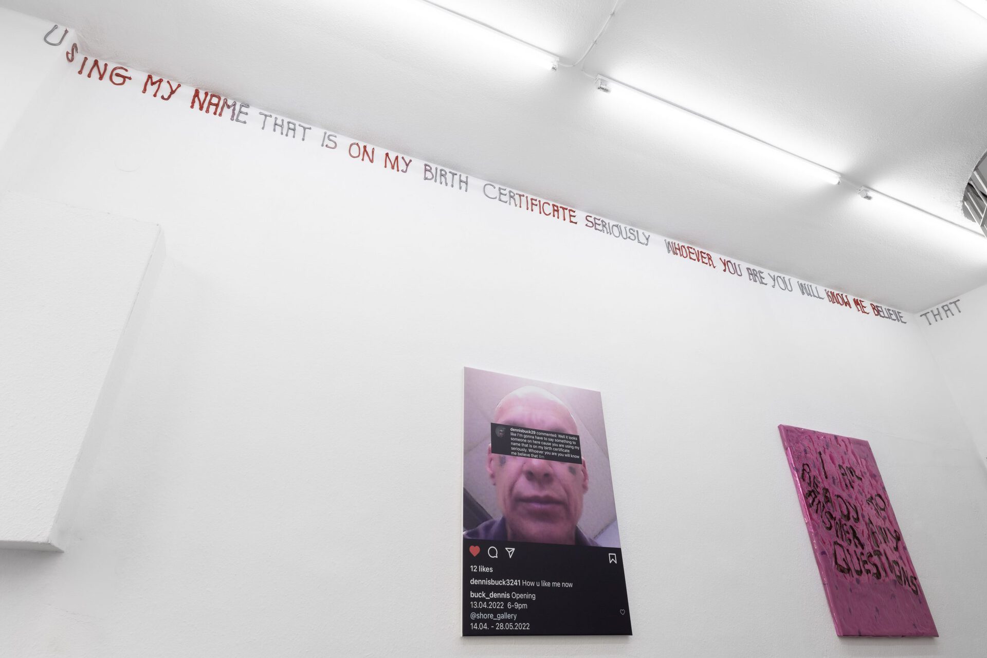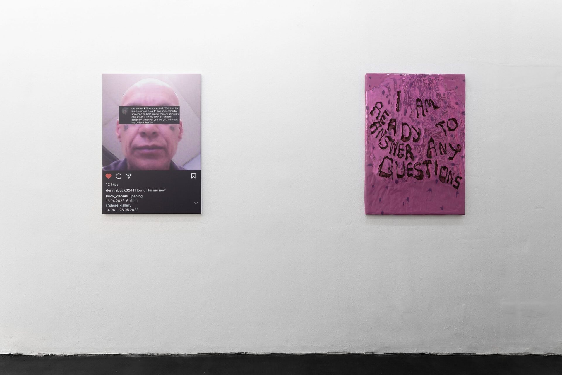 In the end, everything is somehow connected, all the interwoven madness of self-determination is connected in space to form an image. The reference becomes a reflection on one's own perception and that of others, on (artist) identity and its formation, on presentation and representation. From the narcissism of the other, one's own is born again: the life of what is actually a stranger becomes one's own exhibition. Dennis Buck becomes Dennis Buck.