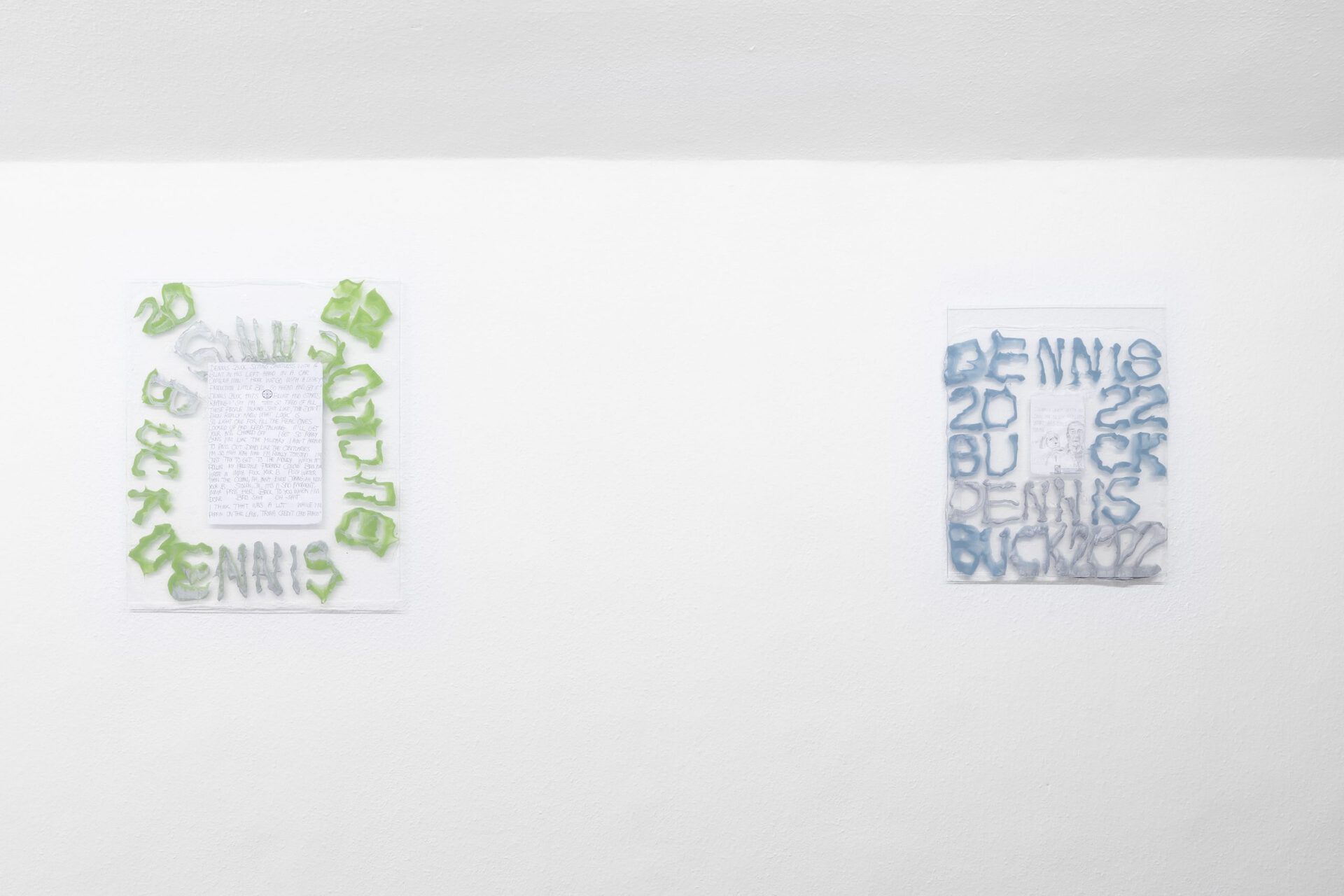 The presentation of Dennis Buck's new works provides a variety of answers to this. For his solo presentation at Shore Gallery, the artist creates a site-specific installation that is also a meticulous research. The artist's initials and his references to hobbies, relatives and places he has traveled to reflect the expectation of his own supposedly narcissistic identity as an artist. Contrary to popular belief, this time Buck does not speak about himself once in his work, but about all the other Dennis Bucks in the world who share the name with him.