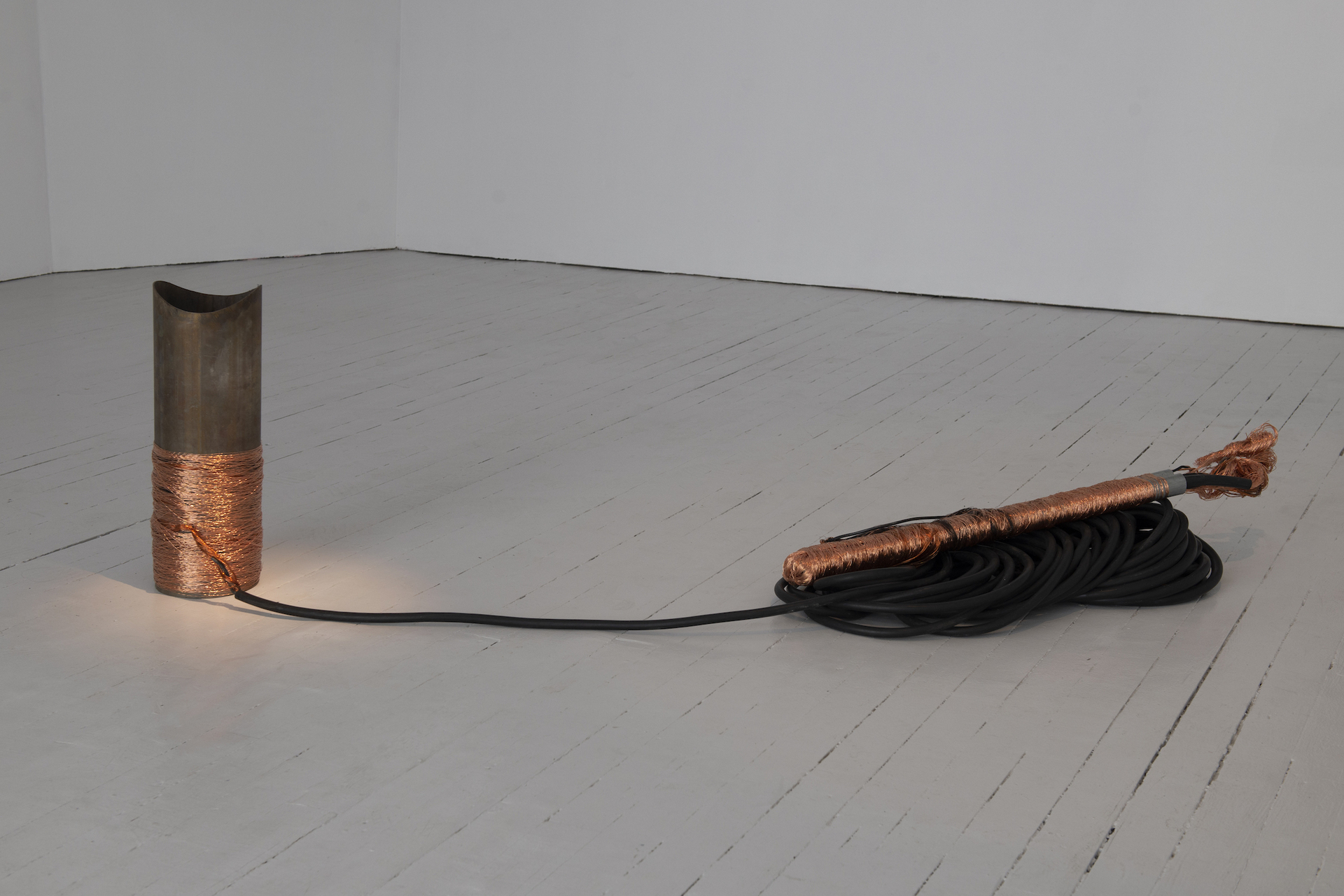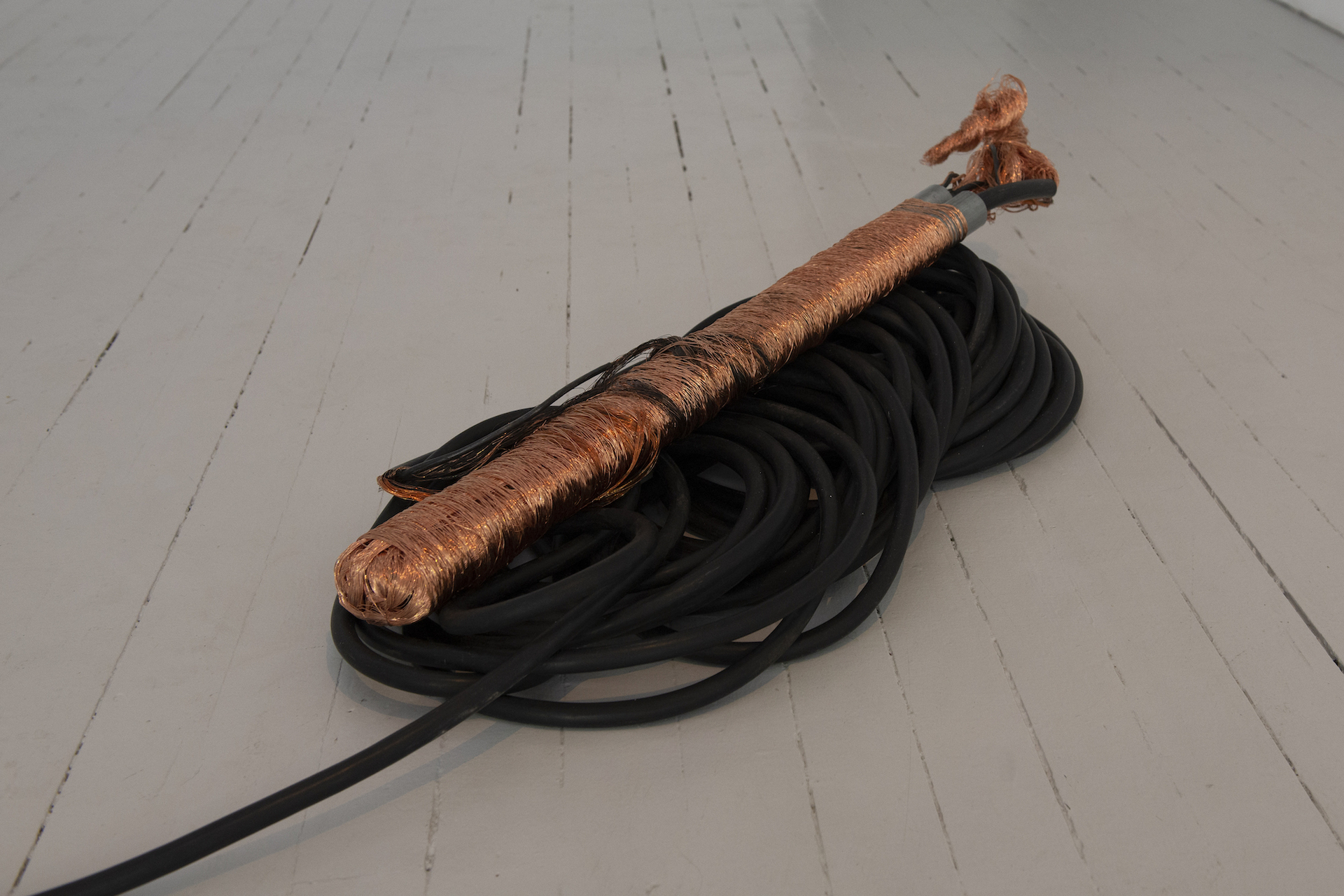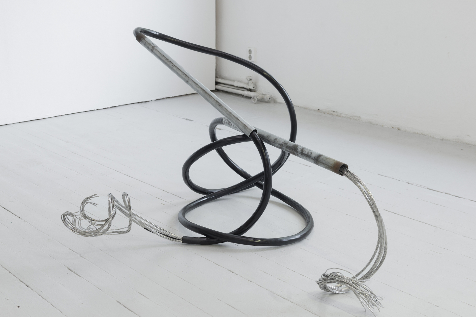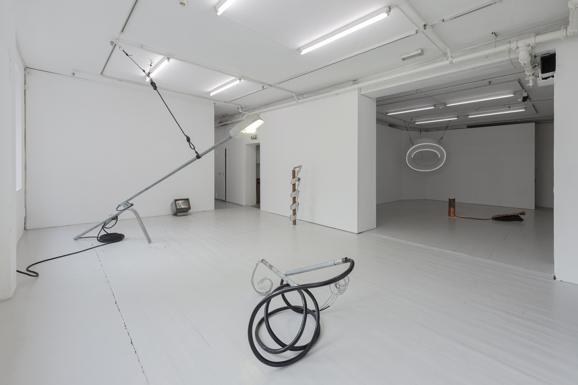 The curved design of Rio’s world famous beach pavement is replicated in a piece of spiralled anti-slippery floor frequently seen in transportation vehicles, and partially broken advertisement signs are combined with rough industrial objects. Electricity cables are stripped and unravelled, revealing its shiny aluminium and copper wires and taking new circular shapes, which are reminiscent of twisted bodies or water fountains. On the gallery window, an LED sign scrolls a text piece based on various slogans collected from both places, turning the semantic geared towards profit into poetic statements.