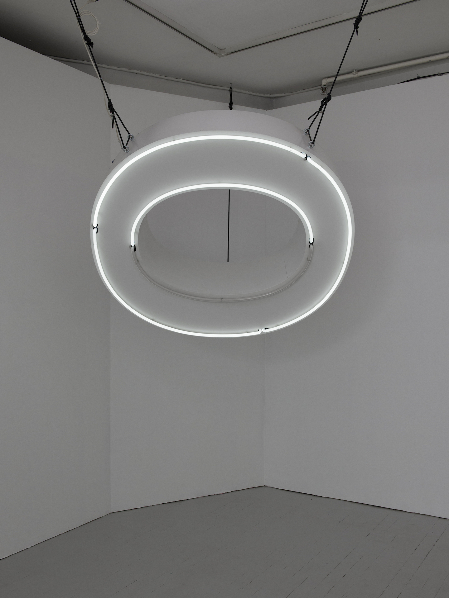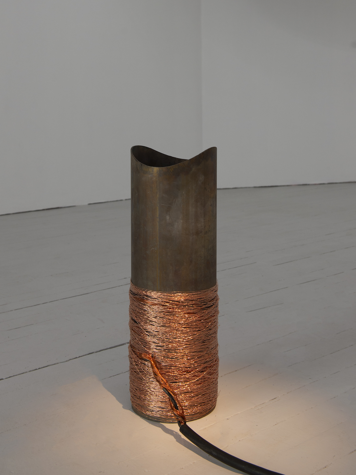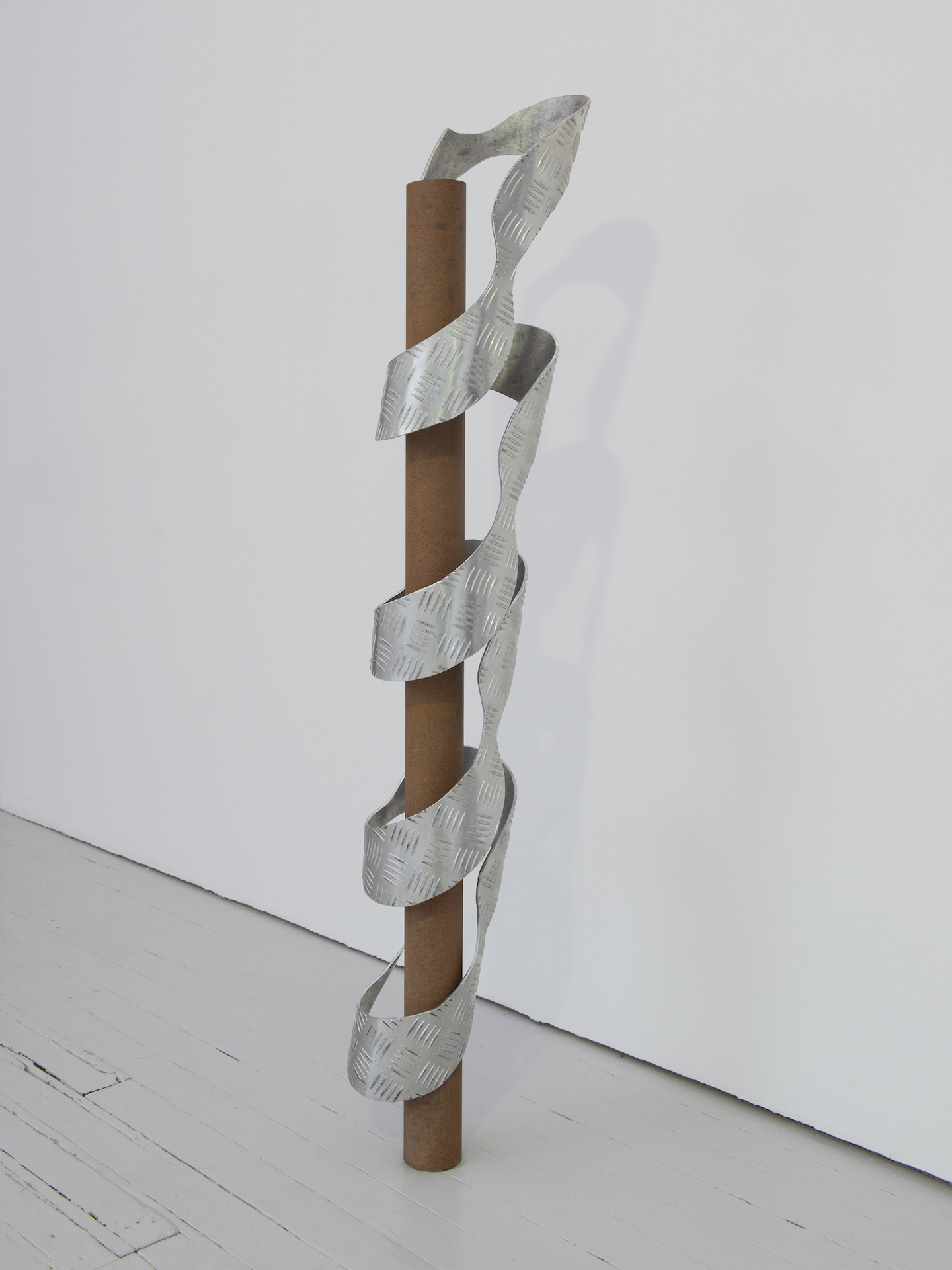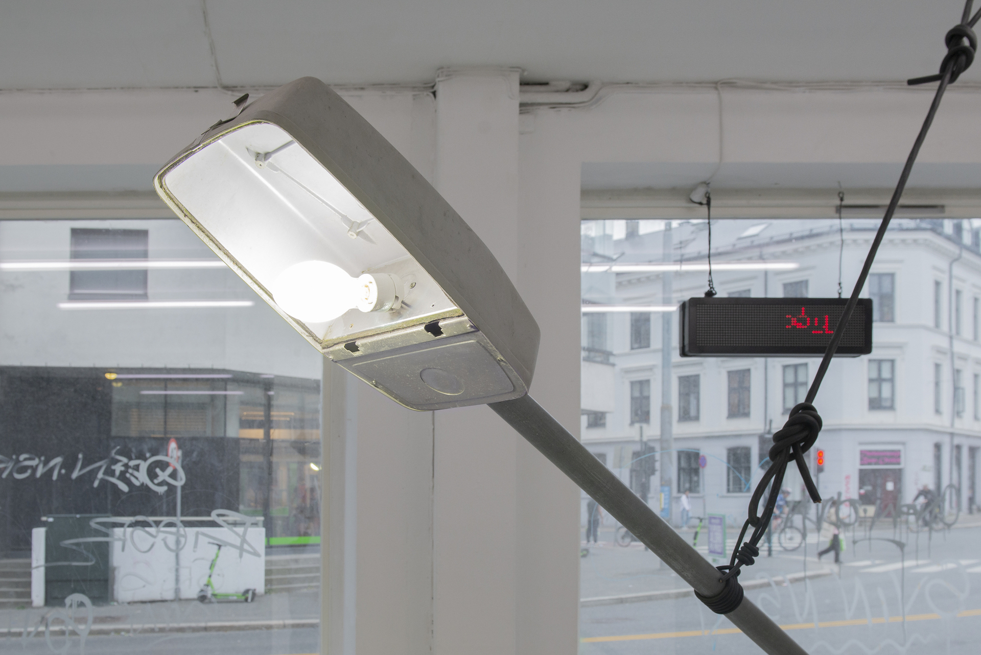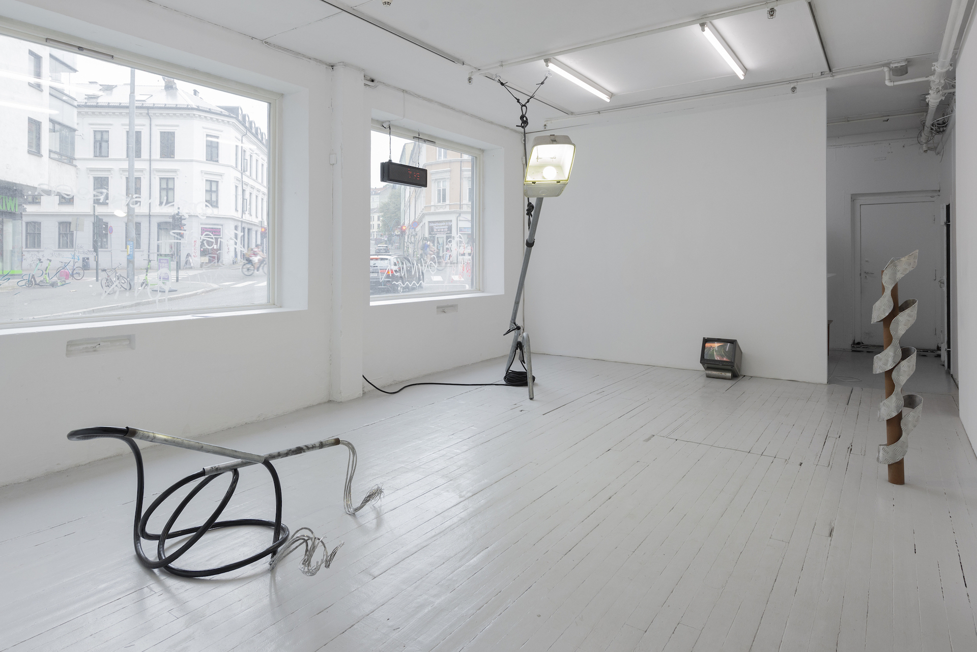 The curved design of Rio’s world famous beach pavement is replicated in a piece of spiralled anti-slippery floor frequently seen in transportation vehicles, and partially broken advertisement signs are combined with rough industrial objects. Electricity cables are stripped and unravelled, revealing its shiny aluminium and copper wires and taking new circular shapes, which are reminiscent of twisted bodies or water fountains. On the gallery window, an LED sign scrolls a text piece based on various slogans collected from both places, turning the semantic geared towards profit into poetic statements.