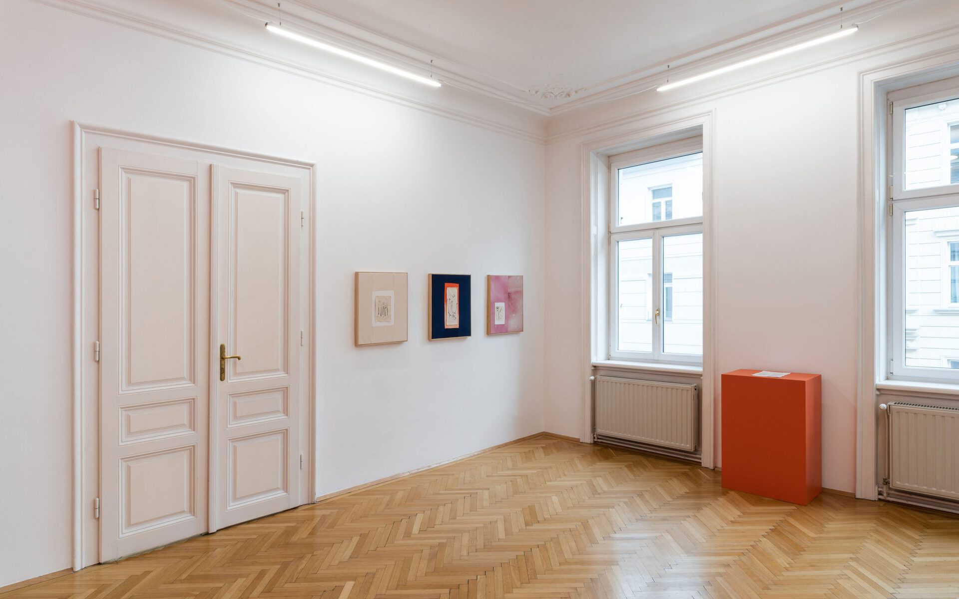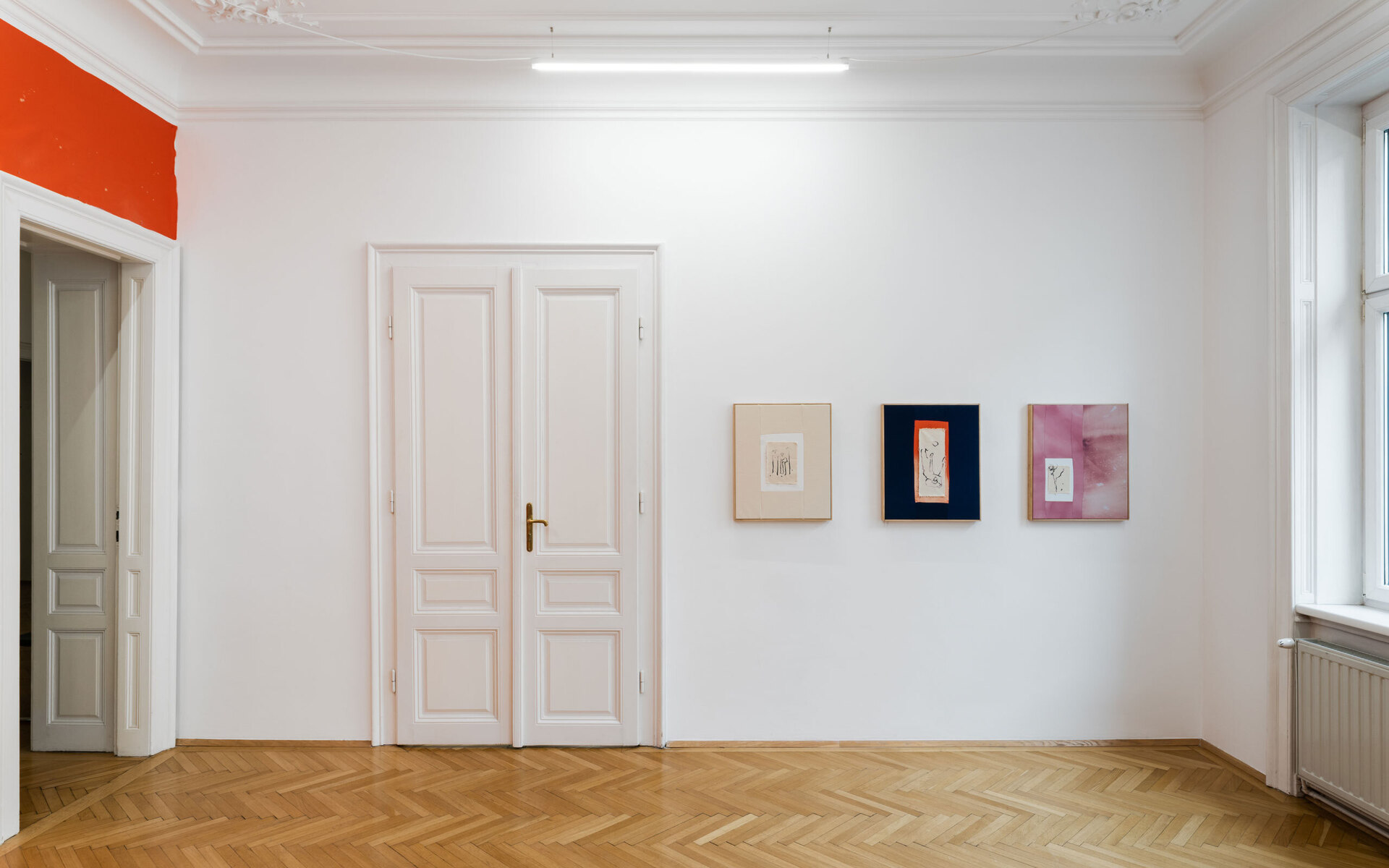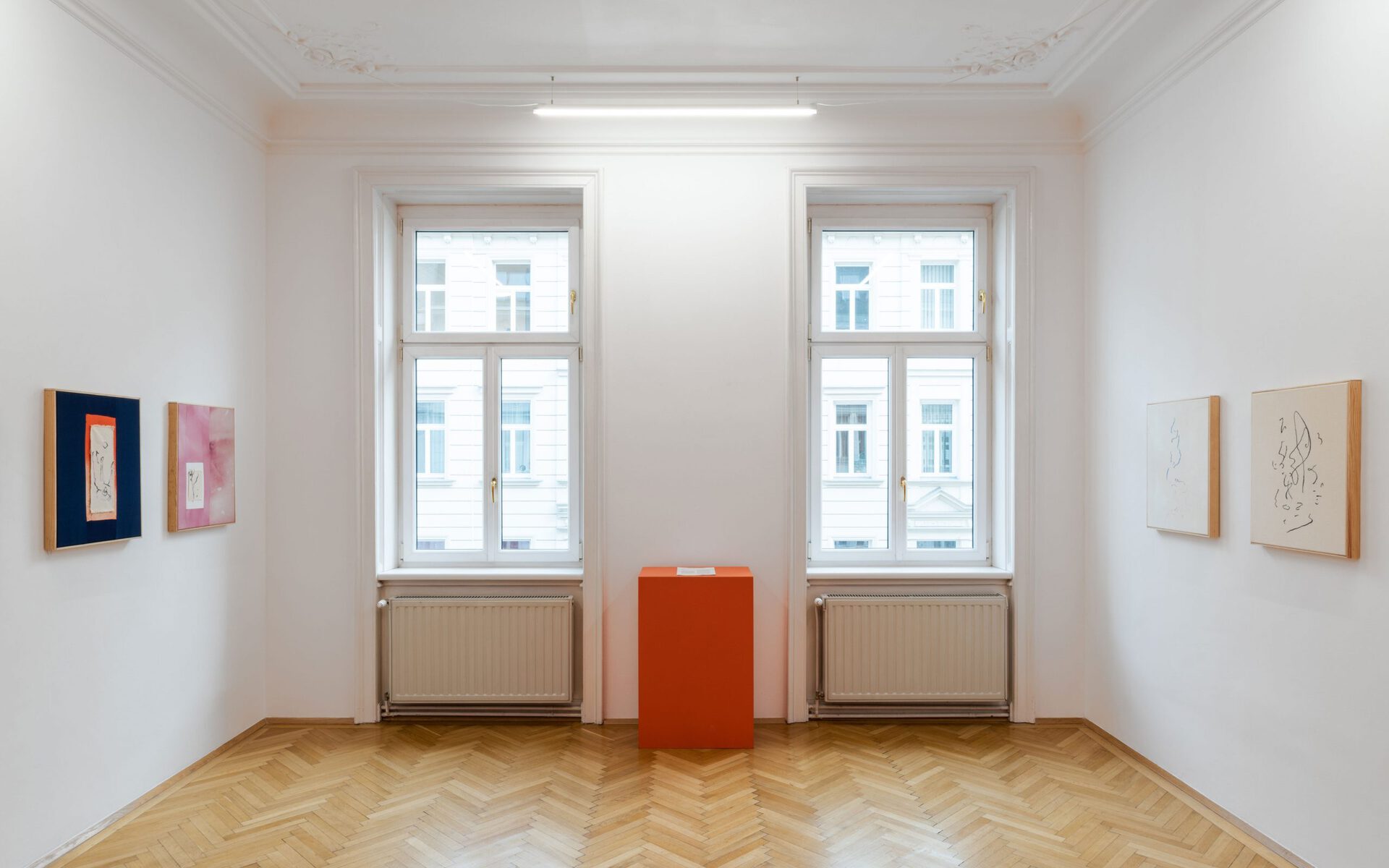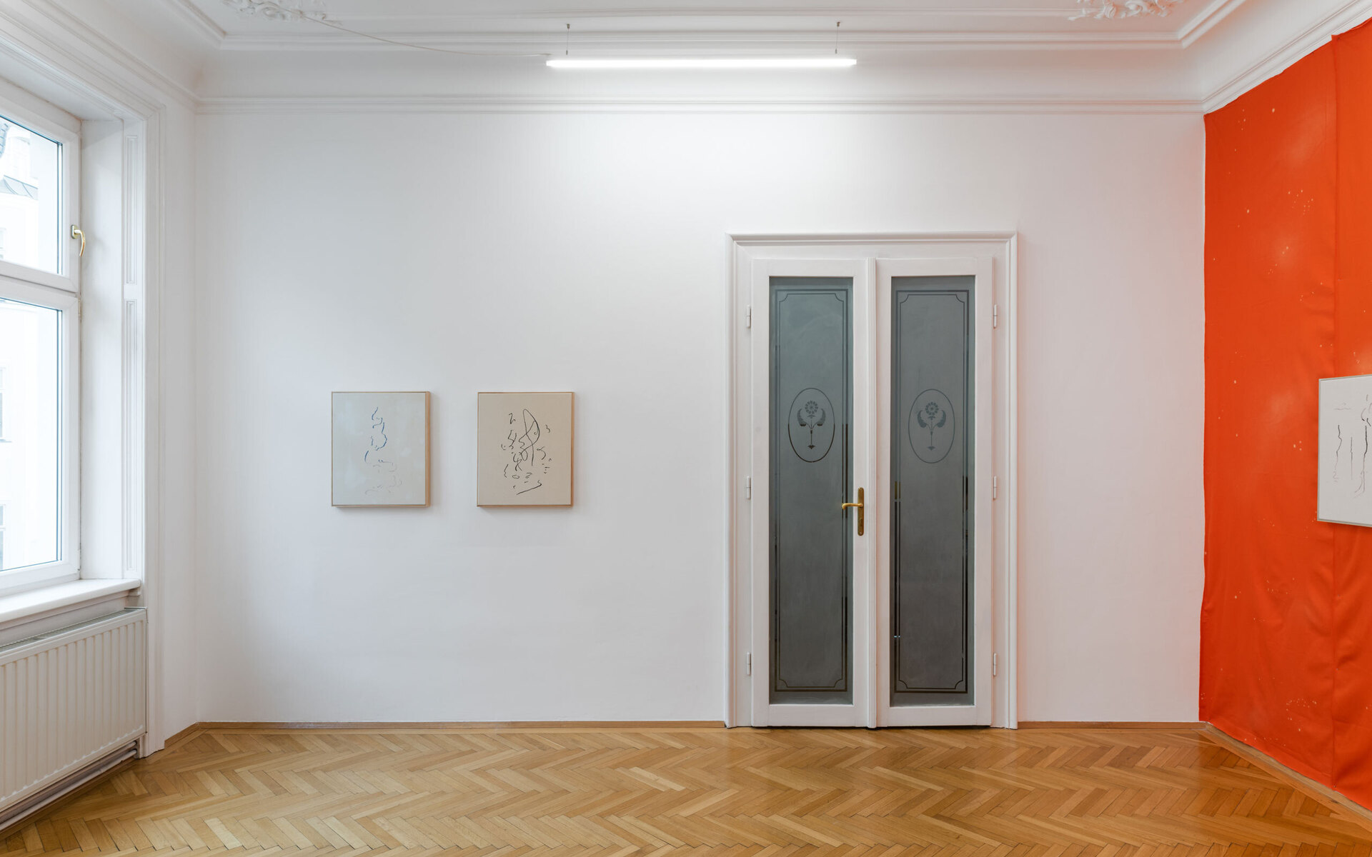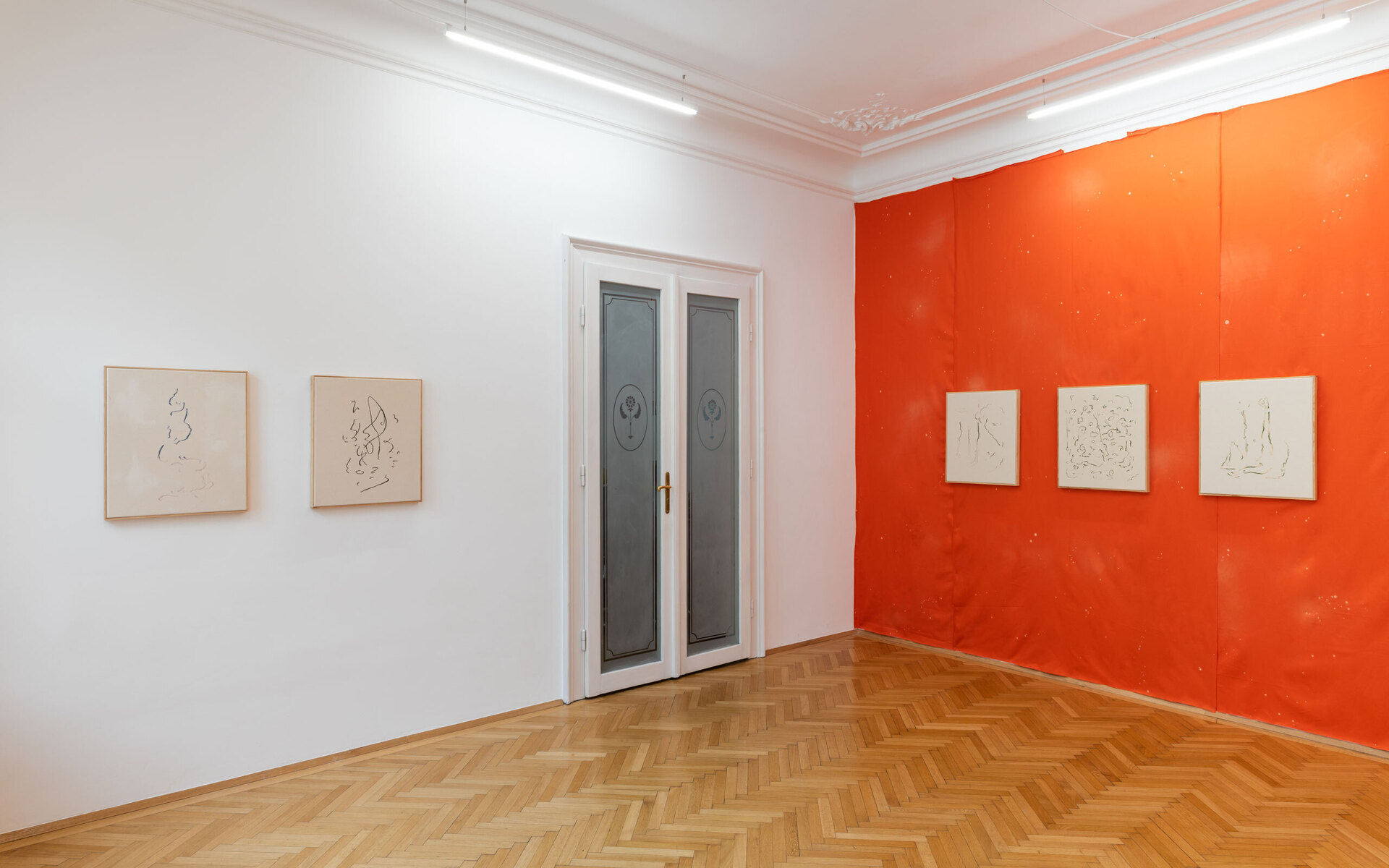 There are lines on raw cloths, and lines on stained cloths, the latter framed and sewn to one another. There are also cloths upon other cloths; four lonesome stiches unite them, for which reason the delicate, light, embroidered cloth seems to rest upon the surface, upon the background colour, upon very small dotted stains, as though it defied gravity. Lines which draw the paths of those who dance and lines upon skies of constellations. It was precisely upon a blue, star-dotted corps de ballet backdrop that Mallarmé saw a possible “ideal dance of the constellations.”5