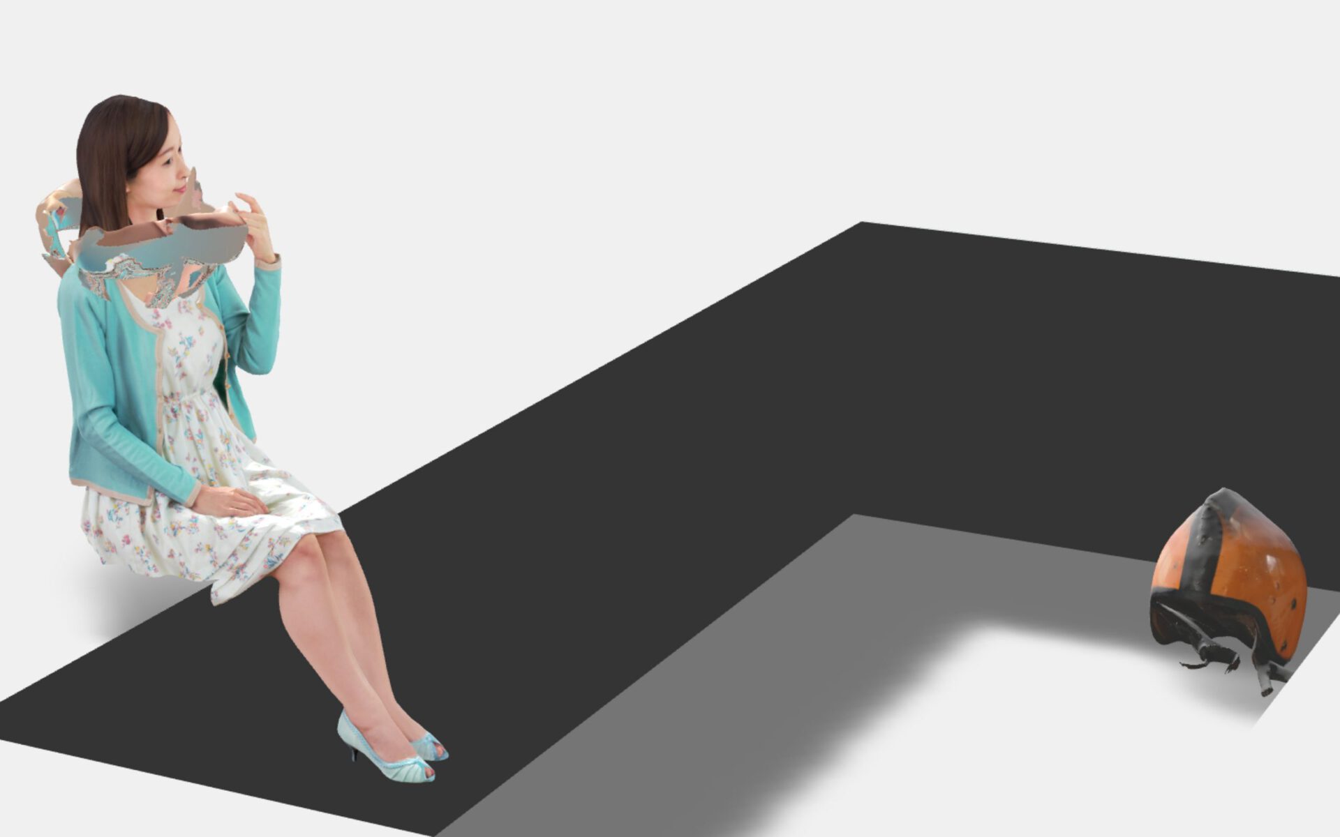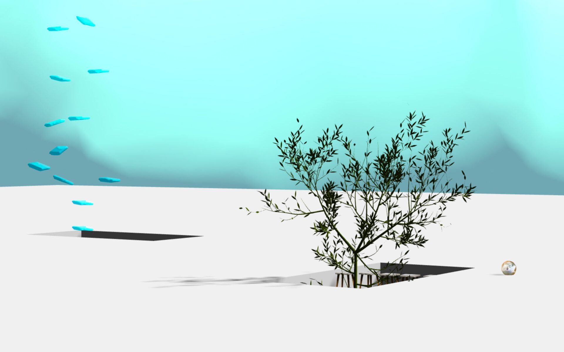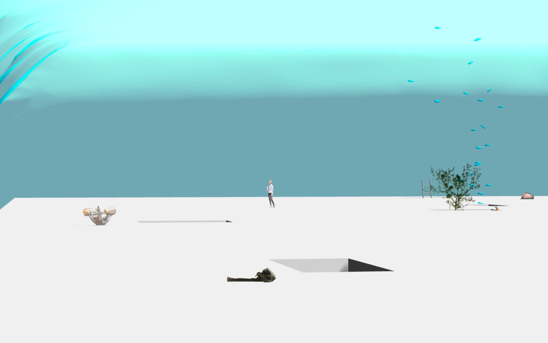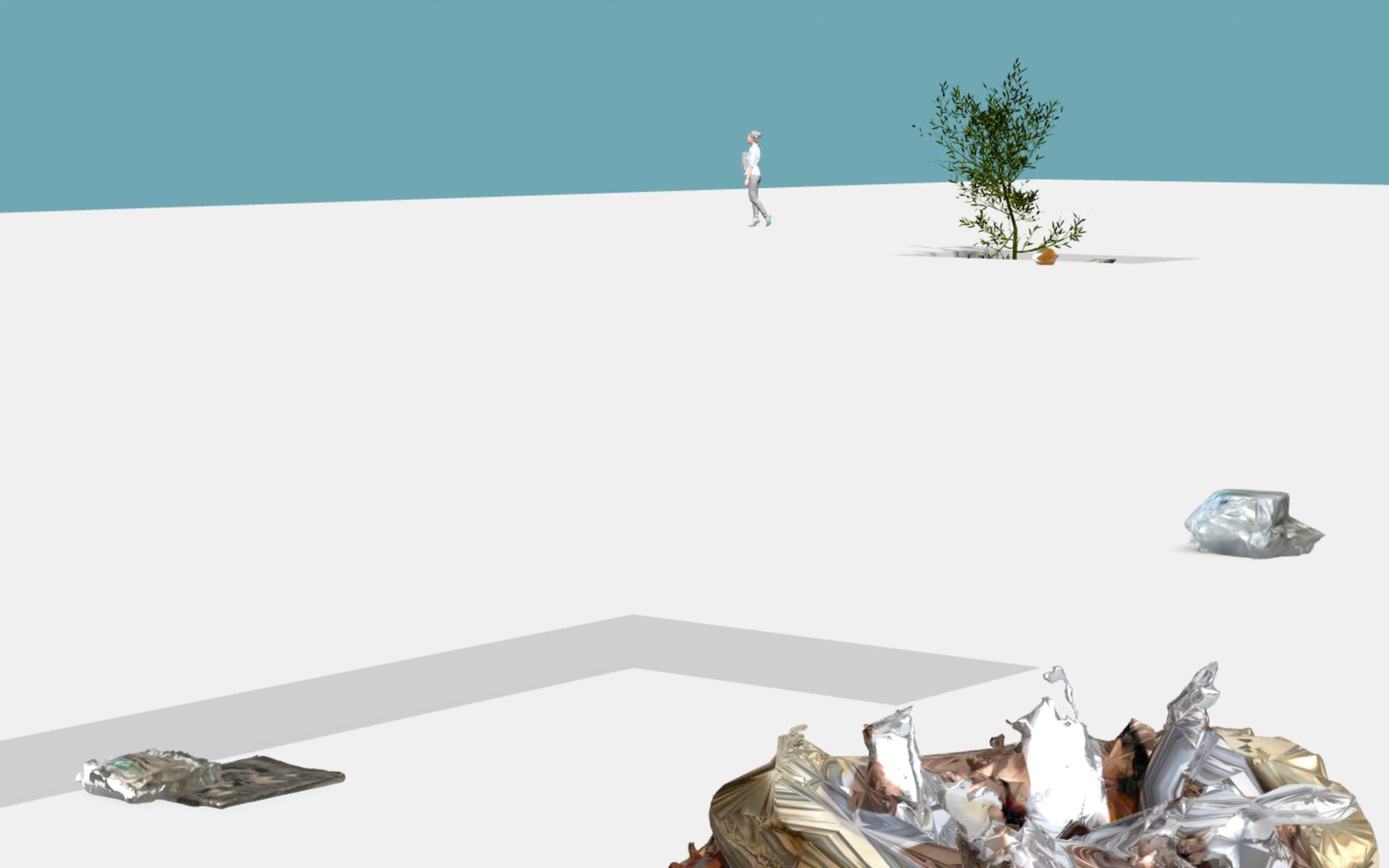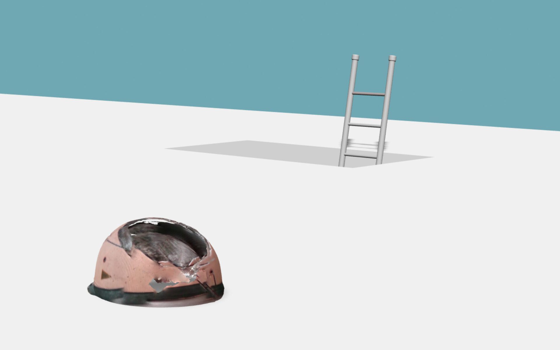 The crown of a lemon tree forms the center. Four stools stand unharmed next to it. With the exception of this notch, a threatening climate dominates the rest of the scene. A woman, turned away from the tree, stares thoughtlessly into an ice-cold blazing inferno. Spoiled food, damaged protective helmets and gas masks lie freely, almost erratically distributed around. They seem as if they determine new relations between space & humans and question the usability of the space. While I inspect the place step by step, further objects catch my eye, which suggest human presence. But they do not so much convey a 'light at the end of the tunnel' as a blood-curdling past. An old family photo lies abandoned in the room, almost entirely covered by respiratory filters. Another niche is graced with an old sleeping bag as well as a kettle. A woman stares satisfied into nothingness. But her serenity seems artificial. I must admit, dear friend, that in general much of this place seems deformed rather than imitated.