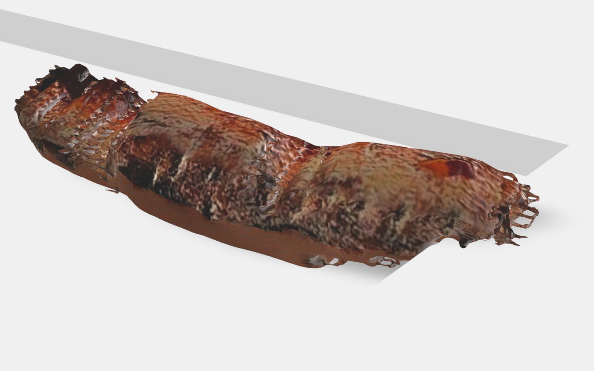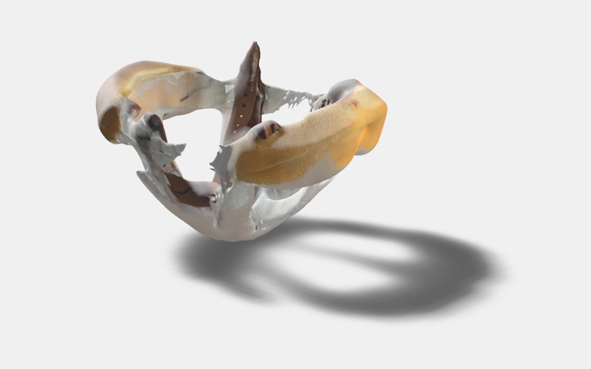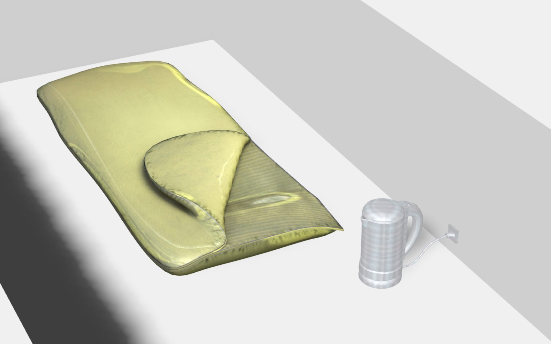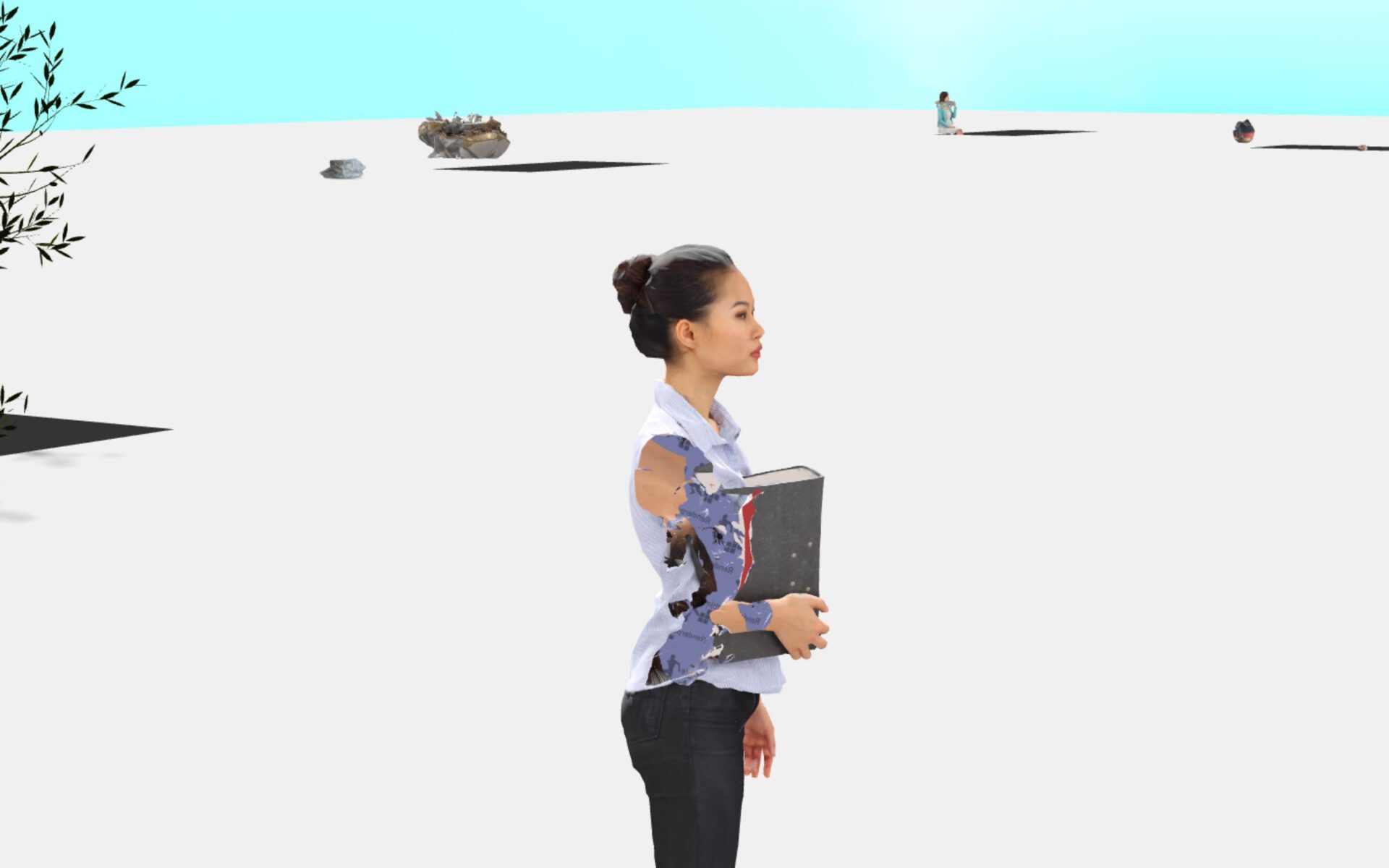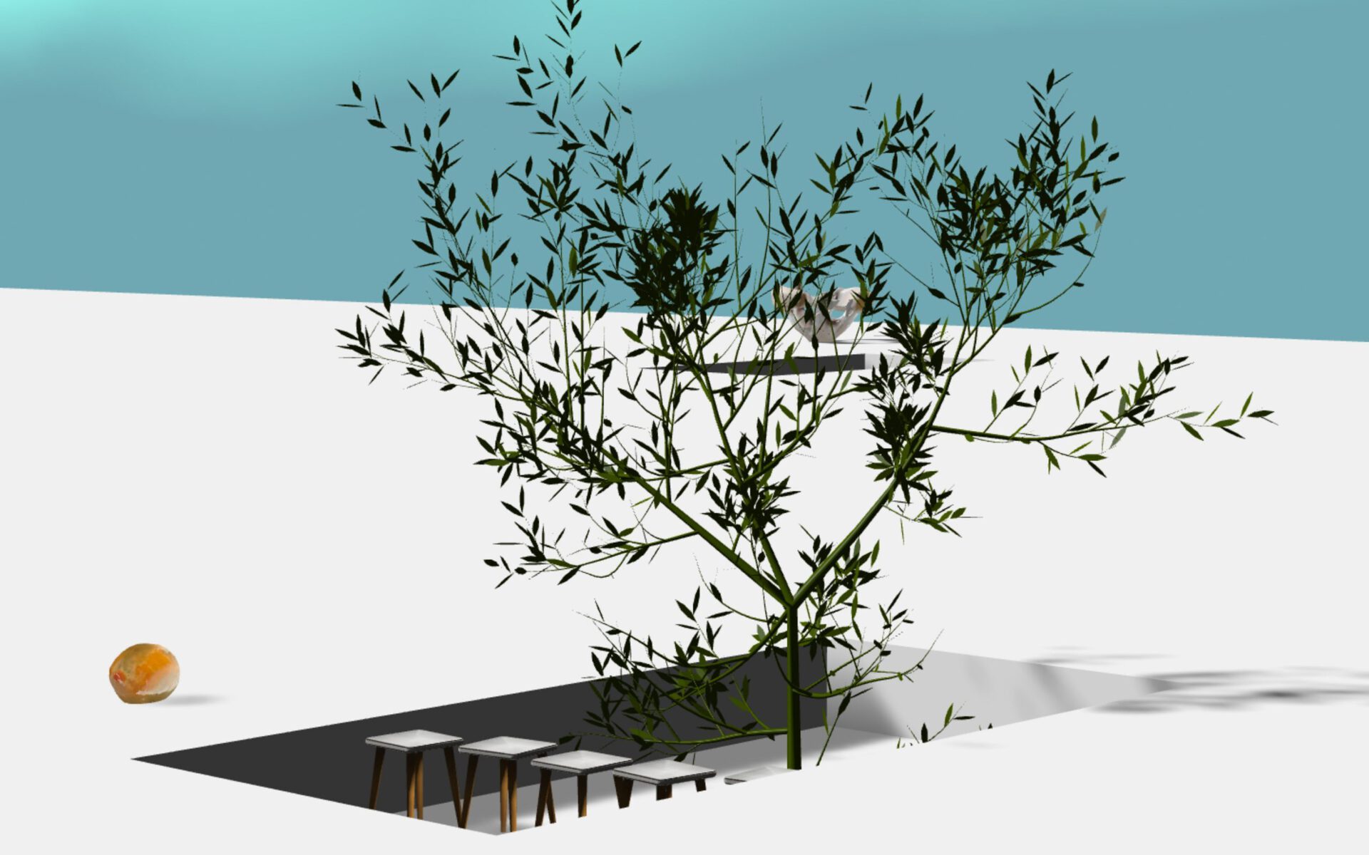 The crown of a lemon tree forms the center. Four stools stand unharmed next to it. With the exception of this notch, a threatening climate dominates the rest of the scene. A woman, turned away from the tree, stares thoughtlessly into an ice-cold blazing inferno. Spoiled food, damaged protective helmets and gas masks lie freely, almost erratically distributed around. They seem as if they determine new relations between space & humans and question the usability of the space. While I inspect the place step by step, further objects catch my eye, which suggest human presence. But they do not so much convey a 'light at the end of the tunnel' as a blood-curdling past. An old family photo lies abandoned in the room, almost entirely covered by respiratory filters. Another niche is graced with an old sleeping bag as well as a kettle. A woman stares satisfied into nothingness. But her serenity seems artificial. I must admit, dear friend, that in general much of this place seems deformed rather than imitated.