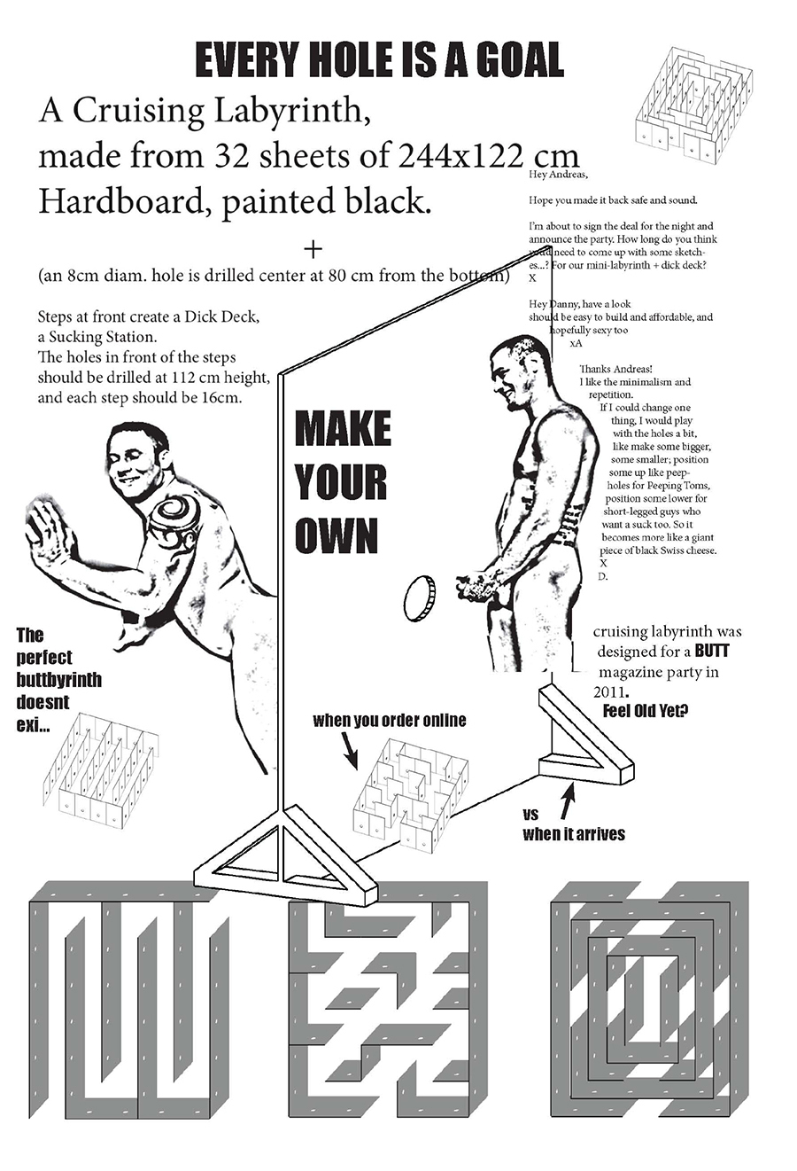 Cruising architecture and dialectics also focus on ideas of visibility and orientation and the organisation of body fluids. Cruising architecture, however, reverses the codes of modern machinistic morality into a fetish. Darkness, corners, angles, passages, wet surfaces, lubricated devices: they all use the aesthetic language and logic of the modernist city, but precisely to facilitate activities that are actually designed outside the city. Thus, a subversive space of possibility and freedom for art and bodies is created in Boxen.