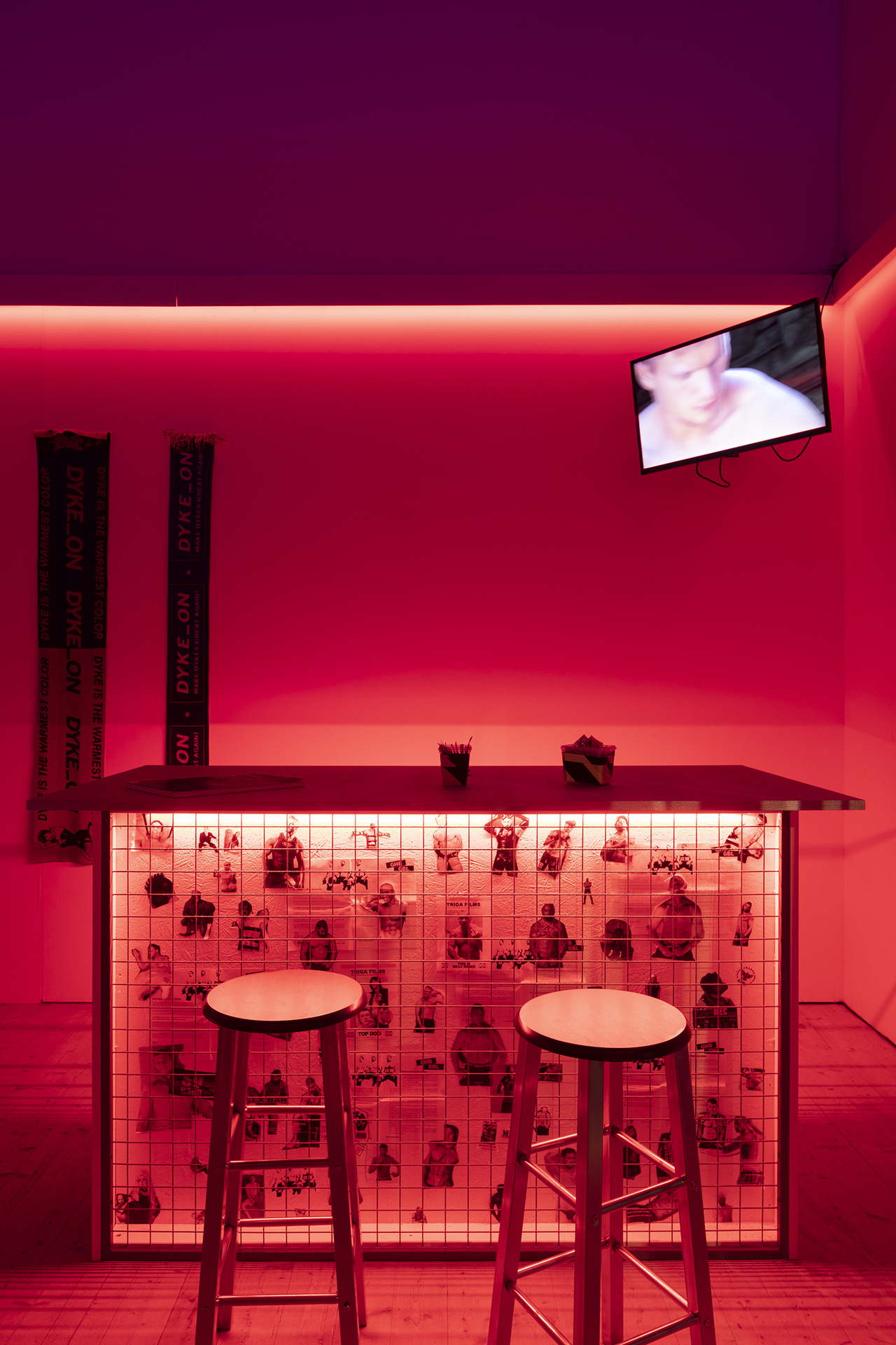 The few indirect red lights, the Disco and Deep House music and the bar setting immediately relocate the visitor at the beginning of the exhibition into gay bars like Möbel Olfe in Berlin or Sidetrack in Stockholm. Baren is the name of this first of three rooms in the exhibition "Cruising Pavilion: Architecture, Gay Sex and Cruising Culture" at ArkDes, the national museum of architecture and design in Stockholm. This exhibition marks the end of the trilogy of the curatorial project "Cruising Pavilion" around the architects and curators Pierre-Alexandre Mateos, Rasmus Myrup, Octave Perrault and Charles Teyssou. Following their debut as an unofficial part of the Architecture Biennial 2018 in Venice and the "Cruising Pavilion New York" in Ludlow38 in spring 2019, the curatorial collective presented their last edition for the first time in an institutional setting.