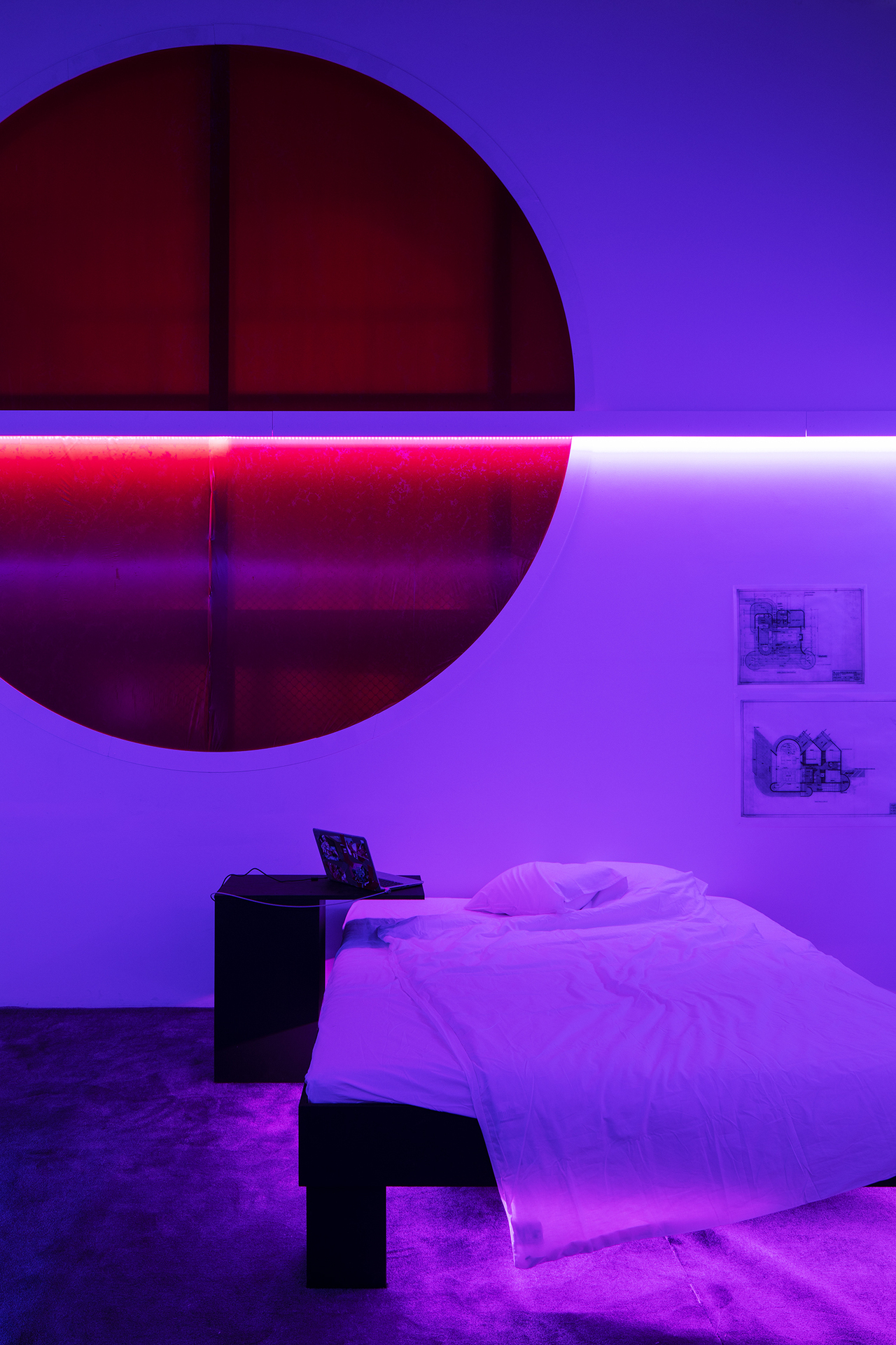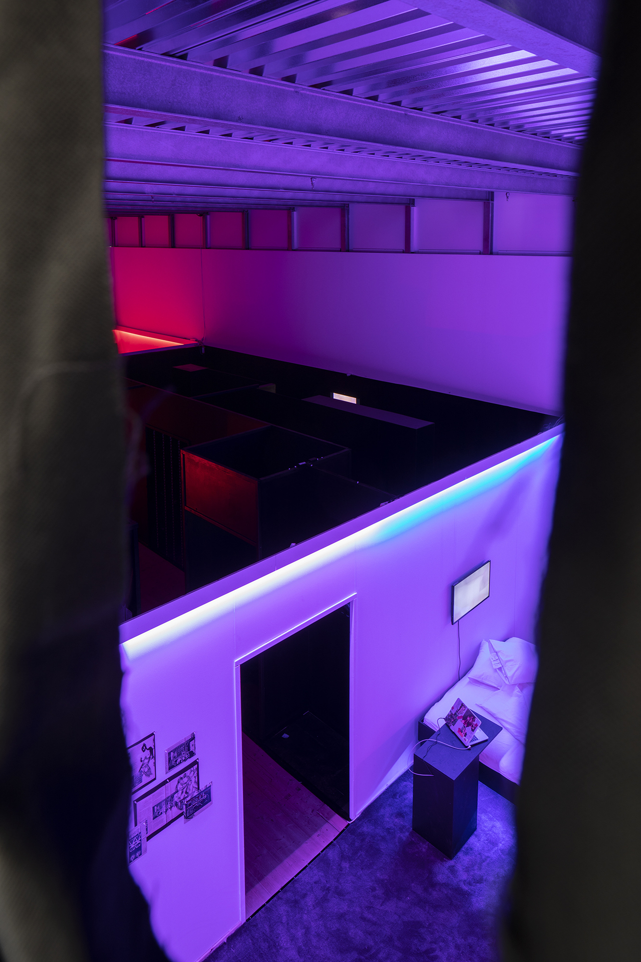 Sovrummet / The Bedroom shows us how the phenomenon of cruising has evolved over the last two decades from a local practice to a global geospatial phenomenon through dating and hook-up apps like Tinder, Grindr etc. Through direct communication with the sex partners via the apps, the geography of cruising practices has changed significantly. Meeting places are less and less often public places, but rather our private spaces. The bedroom, which is more associated with a heterosexual fantasy of reproduction, has become a new meeting place for gay men and sexual desire. Andrés Jaque's "Intimate Strangers" (2017) shows us that dating apps such as Grindr can also be abused by authoritarian regimes and states through tracking in order to explicitly attack the LGBTQ+ community. In this last part of the exhibition, video works and video games on monitors are increasingly shown. Here Shu Lea Cheng's cyberpornographic film "I.K.U." shows us (2000) a futuristic vision in which the Internet liberates us from social constructions such as sexual difference, race and gender. At the same time, however, it also makes us aware of the ambivalent nature of technology, which functions both emancipating and restricting. The revised version of the utopian project "Lesbian Xanadu (Updated Version)" (2019) is also visionary. Based on their design for a lesbian sex club from 1992 (also in the exhibition), Ann Krsul and Alexis Roworth imagine in this work a body-inclusive non-heteronormative space for sexual exploration, which is still emphasizing the feminine and thus stimulates a renegotiation of the power structures between bodies and architectures.