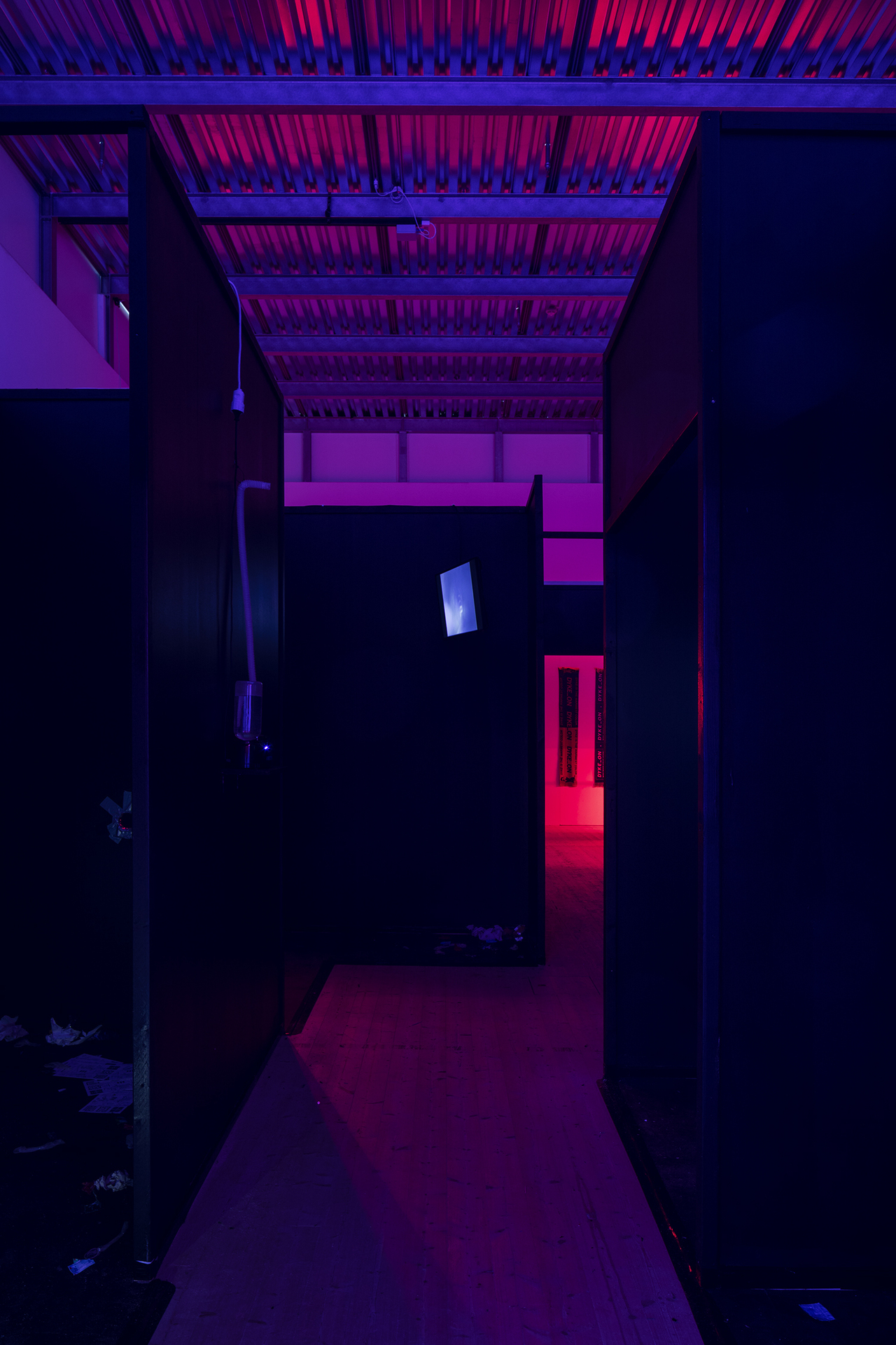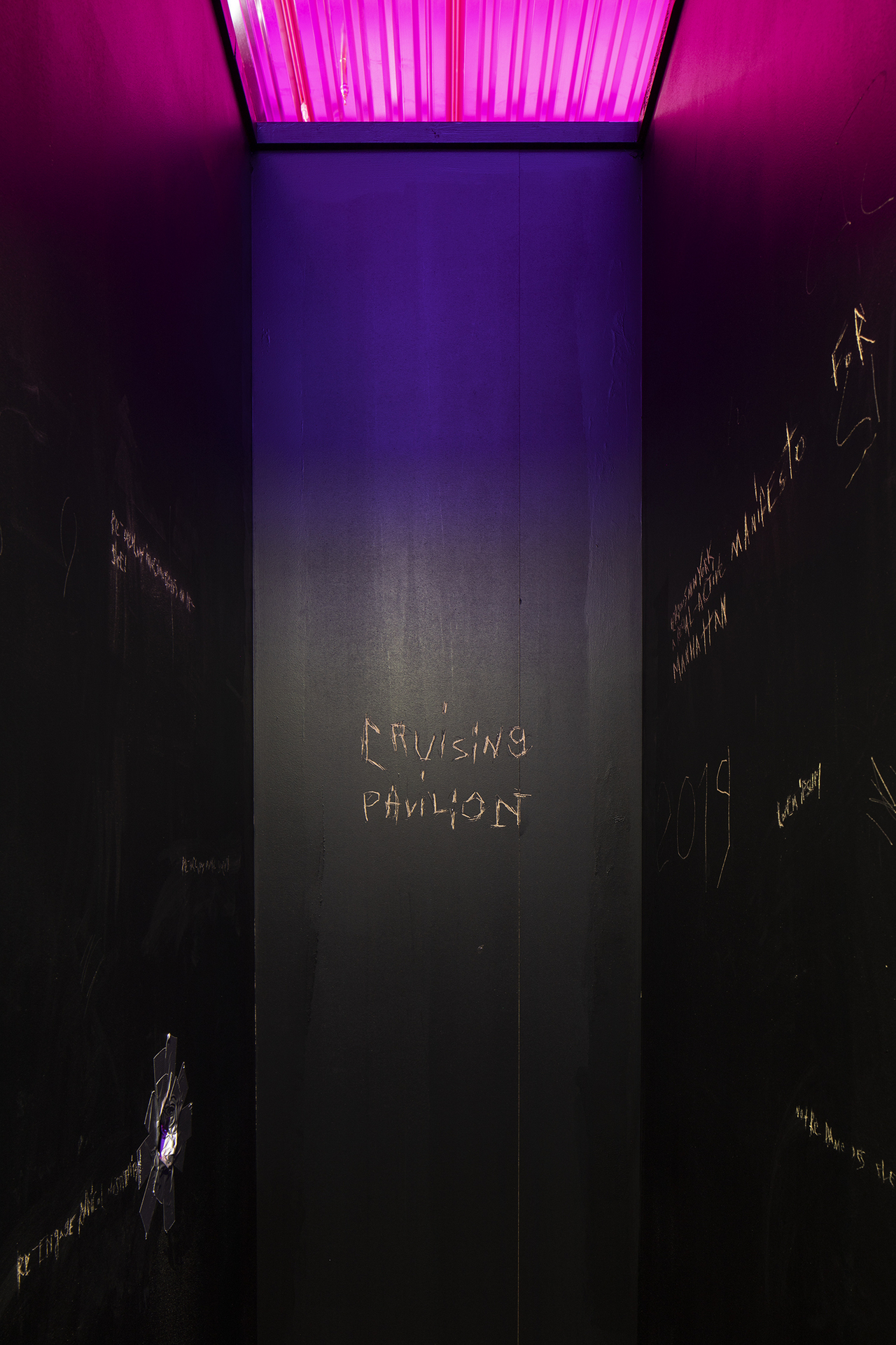 The undermining of these political mechanisms occurs in the darkroom through a potentially emancipatory quality that contemporary exhibition spaces, predominantly the White Cube, do not have - darkness. In darkness lies the metaphorical chance to infiltrate the rigid mechanisms of the construction if the sovereign subject, as we know since Enlightenment. The architectural strategies of the darkrooms are also based on visibility and orientation, but not in the sense of surveillance and totalitarian organization, but in the sense of finding-one-another. The men in darkrooms searching for each other in disorientating spaces do not know each other. One could think they have left their subjectivity outside the door. Their subjectivity is here in a not yet constituted state and has to be found first without ever being completed. The transfer of this quality to the exhibition space creates a dynamic becoming of desire rather than a rigid linear being. In this way, Cruising Pavilion creates new forms of desire, loving and living beyond the heteropatriarchal model of reproduction and homophobic paranoia that make homosexuals prisoners of heterosexual ideas of homosexuality.