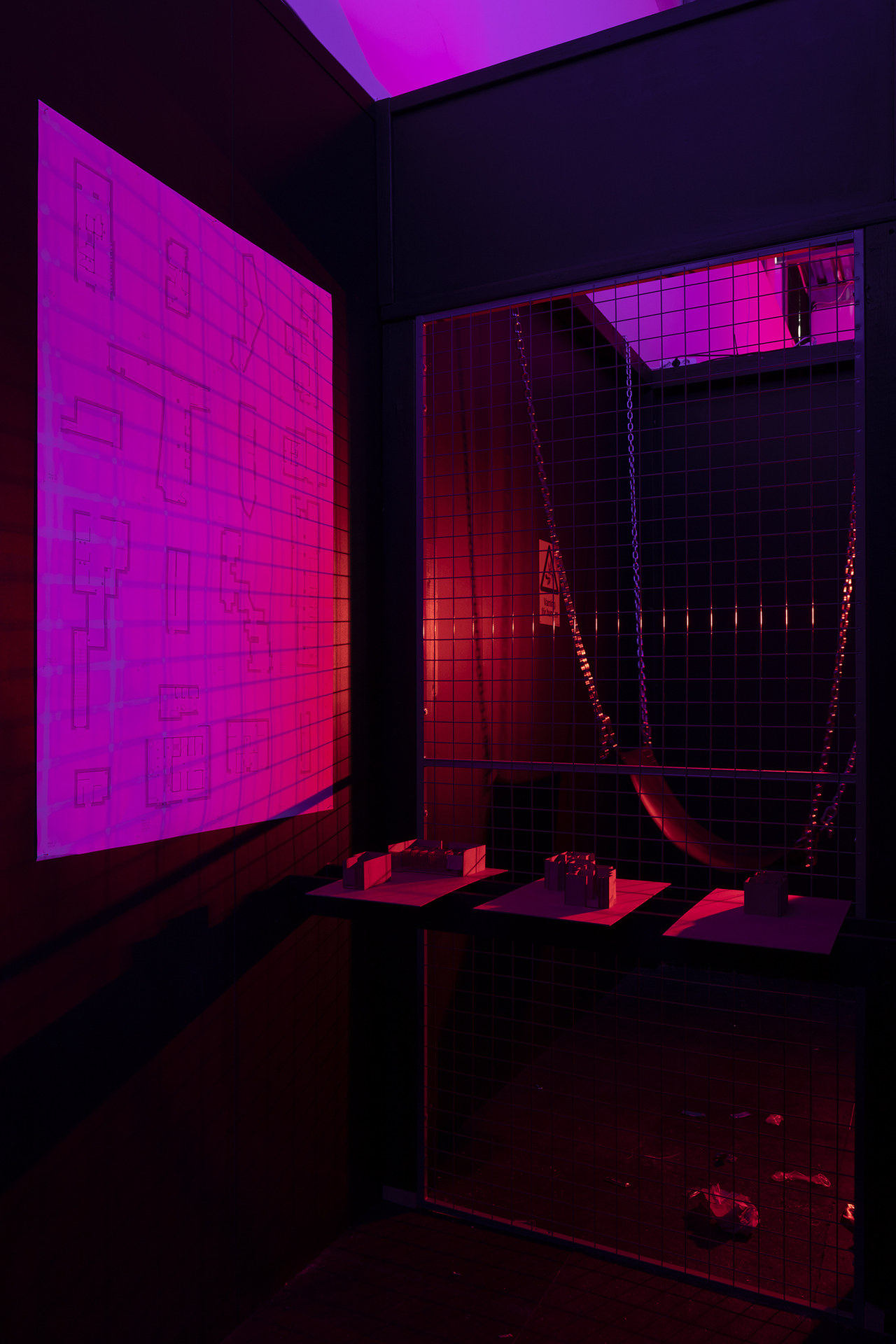 The Darkroom is dark and disorientating. Do I go left, right or straight ahead? Everywhere are supposedly used condoms, their packaging and tissues. There is a leather swing, chains and glory holes, just like in a real darkroom. In this setting, the curators have placed Henrik Olesen's "Pre-Post: Speaking Backwards" (2006). In this collection of texts, Olesen makes the dissident social and sexual practice of cruising and queer artists excluded from the European art canon visible again by telling their stories. The text-based conceptual works of very visible “masters” such as Vito Acconci, Chris Burden and Bruce Nauman, which Olesen places next to these marginalized narratives, must thus be read anew and above all queer. This part of the exhibition is also increasingly dedicated to the architectural dimension of cruising culture. Among other things, Studio Karhard's designs for the Boiler Room (2015) - a gay sauna in Berlin - show that the language of form, materials, and aesthetics are taken from this clandestine sex practice and have long since been adopted into a design language and thus into the mainstream. Pol Esteve and Marc Navarro's study "Atlas of Plans: Barcelona Dark Rooms" (2007) shows on the one hand Barcelona's distinctive network of places of gay sexual desire in 2007 and is on the other hand probably the first attempt at an architectural typology of the sex club. And with "Cruising Labyrinth" (2011 - 2019) Andreas Angelidakis even gives us instructions for building our own dark room.