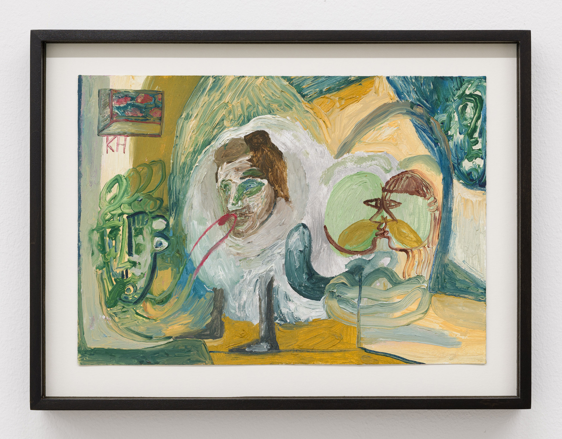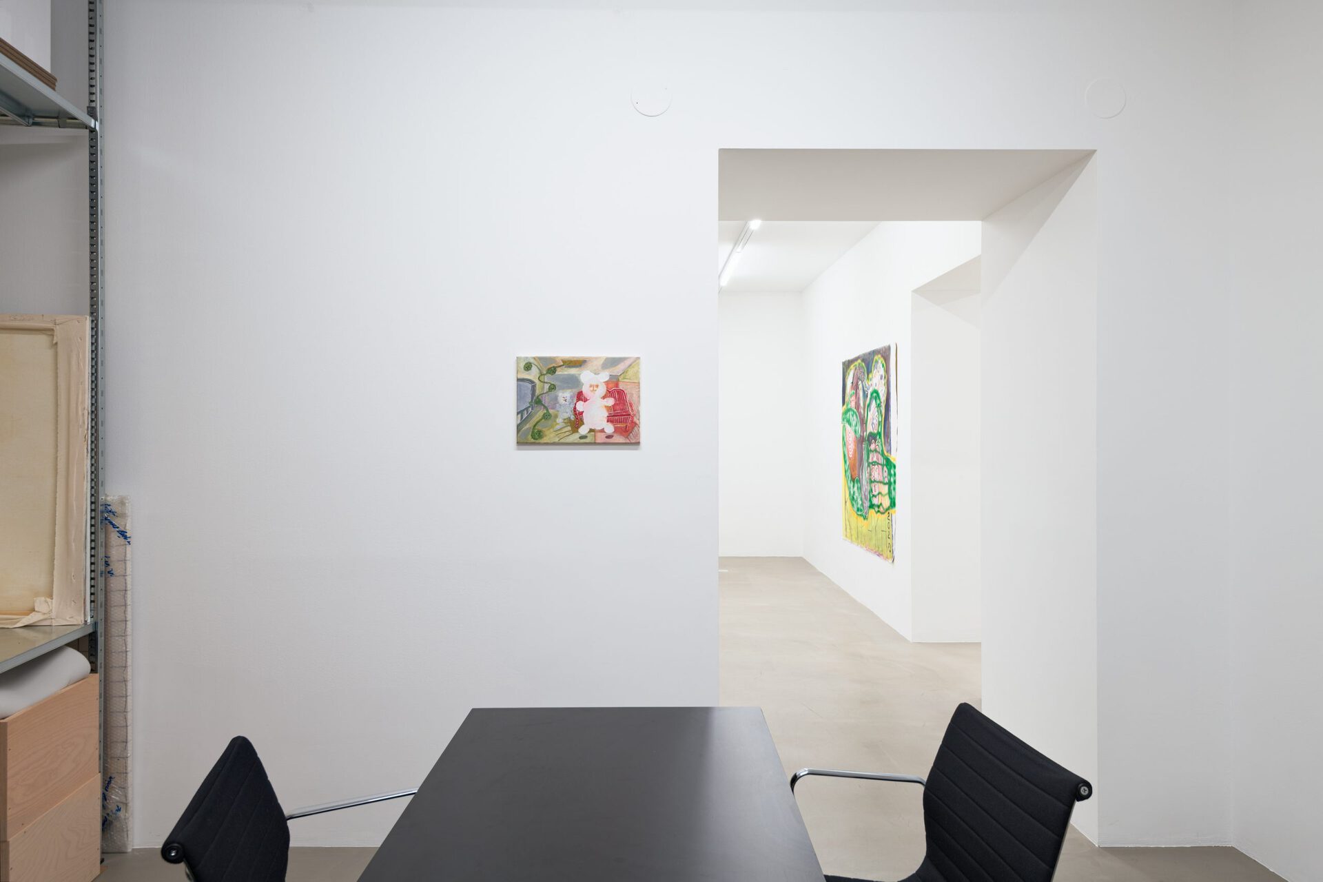 KH: Oh yes, we always fancied exploding them with our fingers as children, and still up to now. I imagined it would be an actual cucumber which is exploding when it's 'grown up'. I have to paint that. Also, when I think about your paintings, it's not so much that they are exploding, but continuously spritzing (not actually true, it's more splashing and flowing, but I like the relation to the German word), like an endless application of colour that doesn’t stop from one painting to the other, but just changes. And even though you would often say 'no' and sometimes say 'yes', for me it's so important to see the whole action. Maybe for me, it's a bit like the contrast to that, it's more 'stop and go'. Although I can totally relate to what you said about each painting being the answer to the last one. VP: Do you mean like 'stop and go' and move to the next one? Kiss-and-ride! I see it in your small-format paintings on cardboard. They are more like vessels and more pronounced as portraits or still lifes, for example. Large-format paintings are multi-functional in a way: a still life is not only a still life but also a portrait and a landscape. What was the difference in the process? [caption id="attachment_72271" align="alignnone" width="660"]
