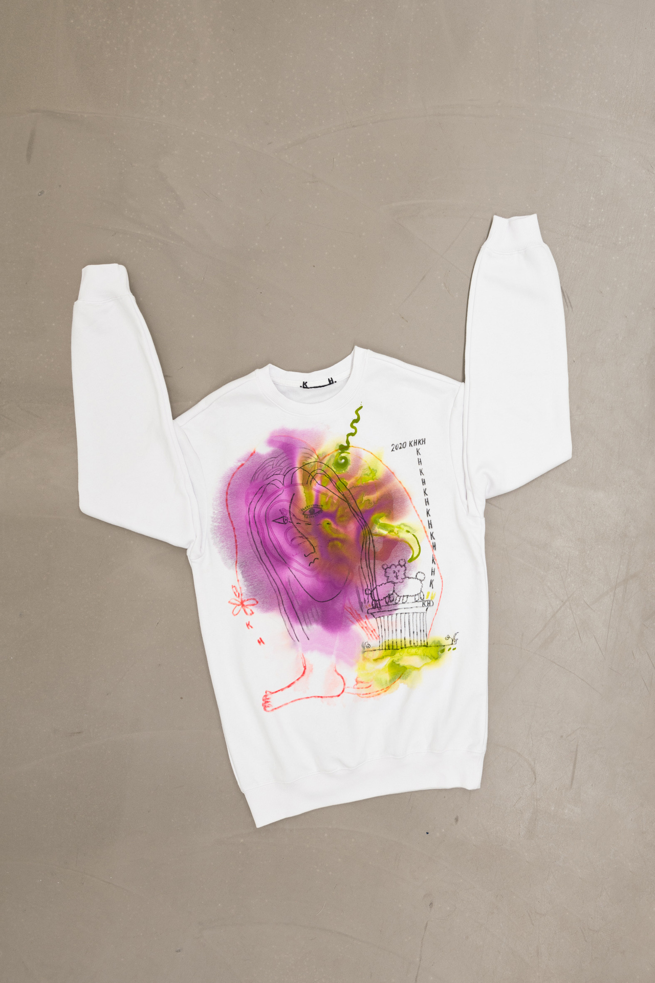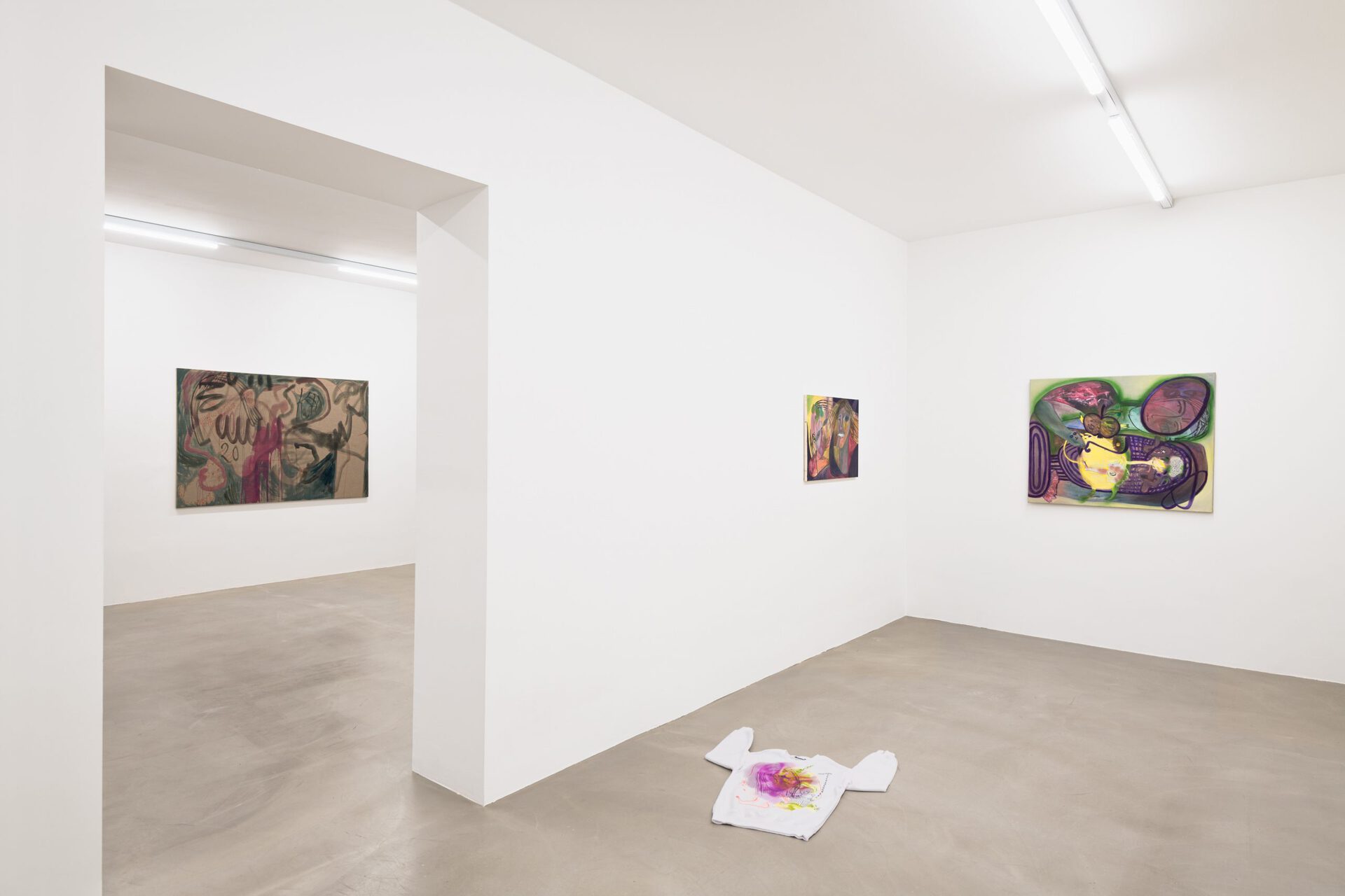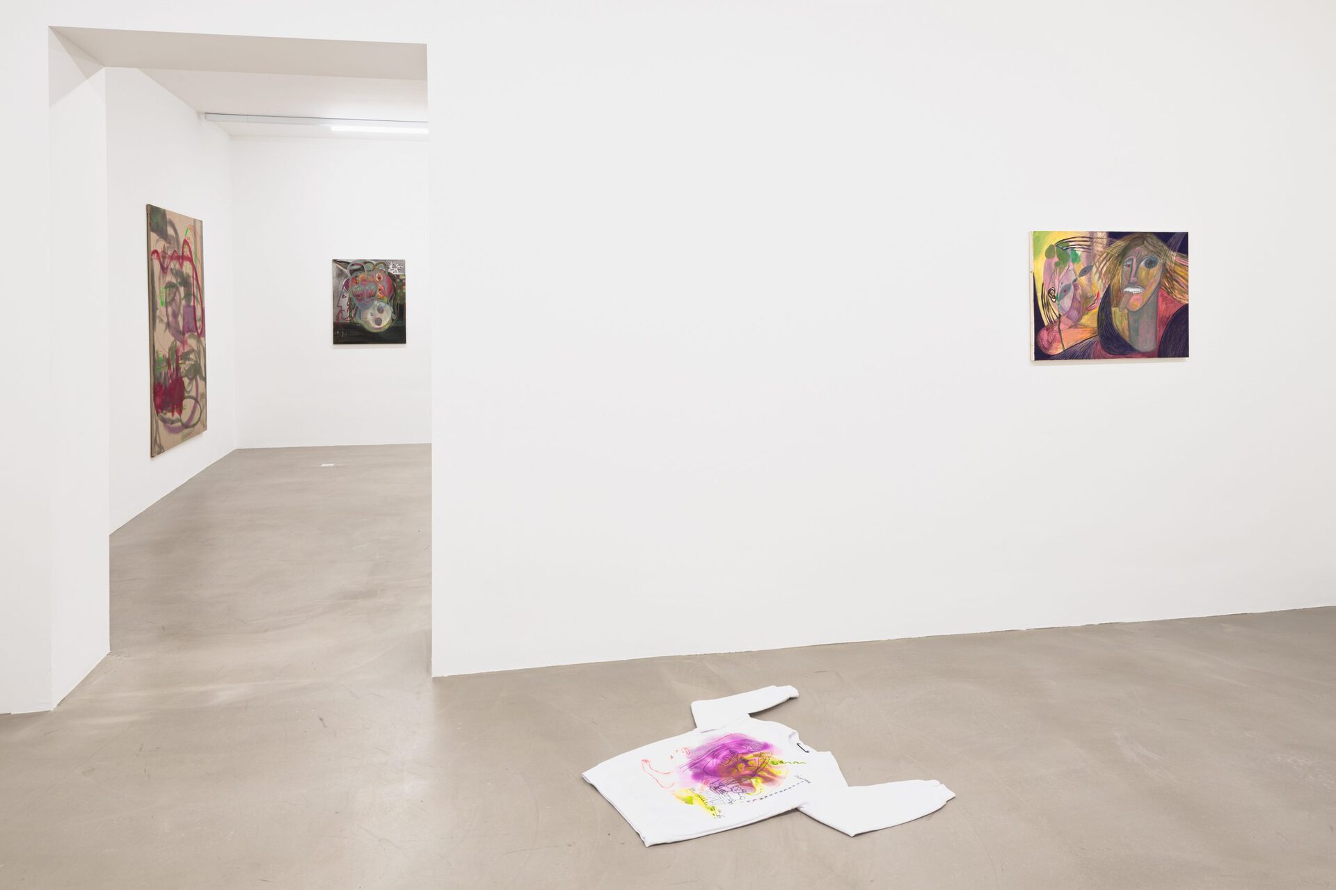 unstretched painting on canvas acting as a mural, a book as a collection of hand-painted t-shirts, neatly framed small-format oil paintings on cardboard, hand-painted sweatshirt pointing with its sleeves towards oil paintings on canvas.